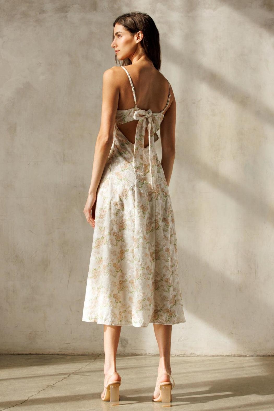 This romantic floral midi dress is the perfect blend of elegance and allure. Crafted from a lightweight fabric with a soft floral pattern, it features a fitted bodice with dainty button details down the front.