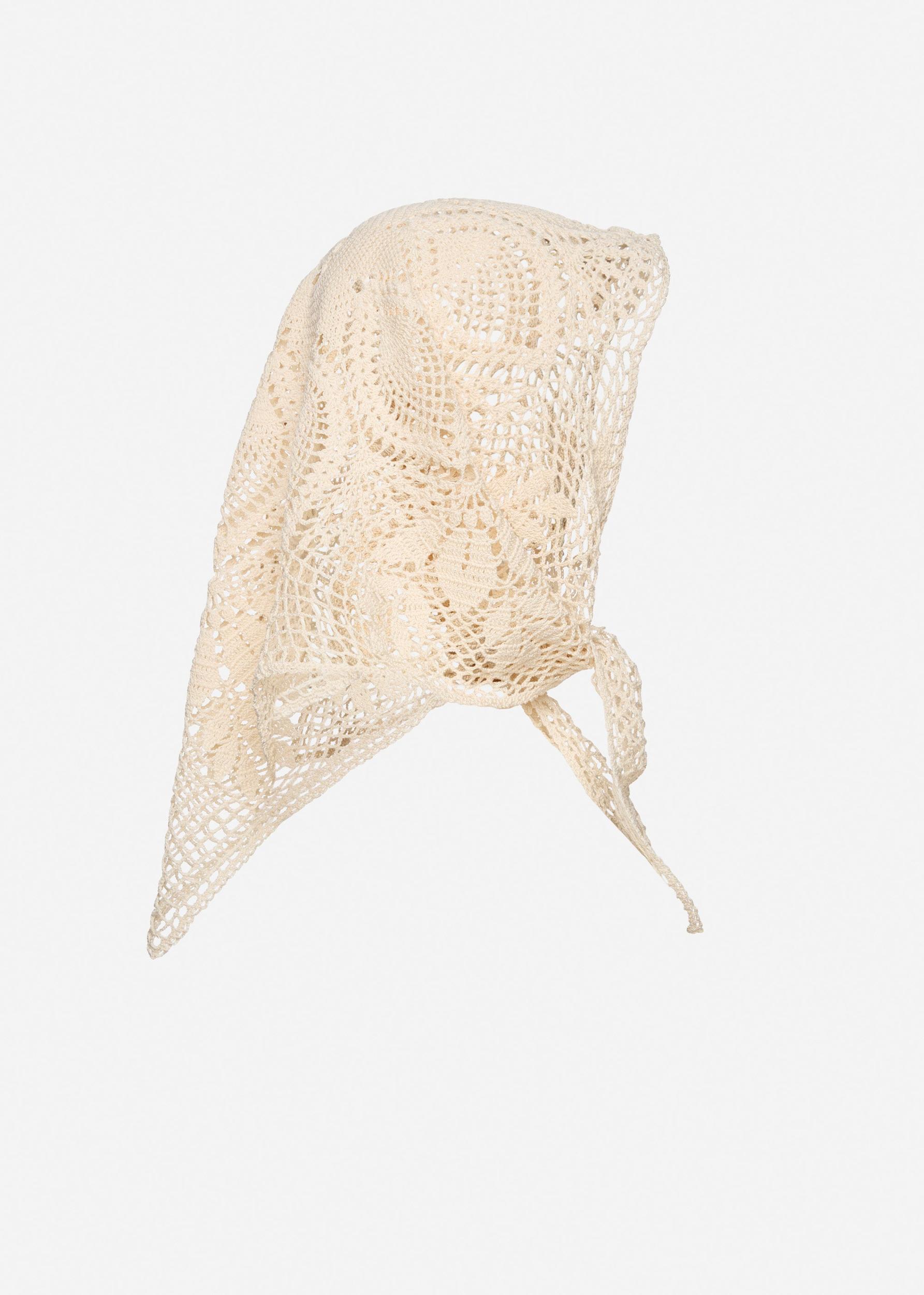 This beautiful crochet scarf in cream showcases intricate craftsmanship with an openwork floral pattern. Its triangular shape and lightweight design make it an accessory that can be worn as a headscarf, around the neck, or draped elegantly. Perfect for adding a soft touch to your outfit.