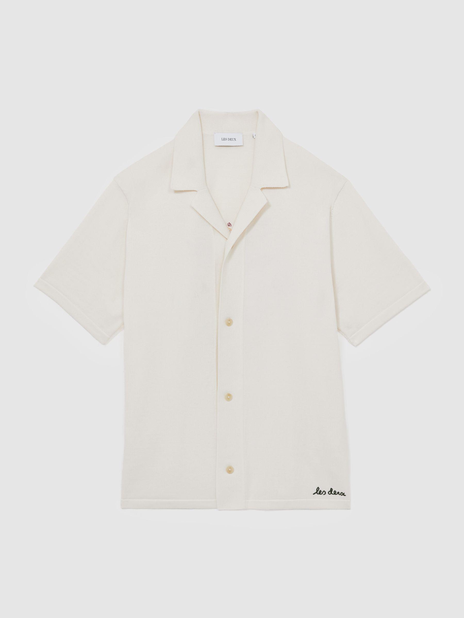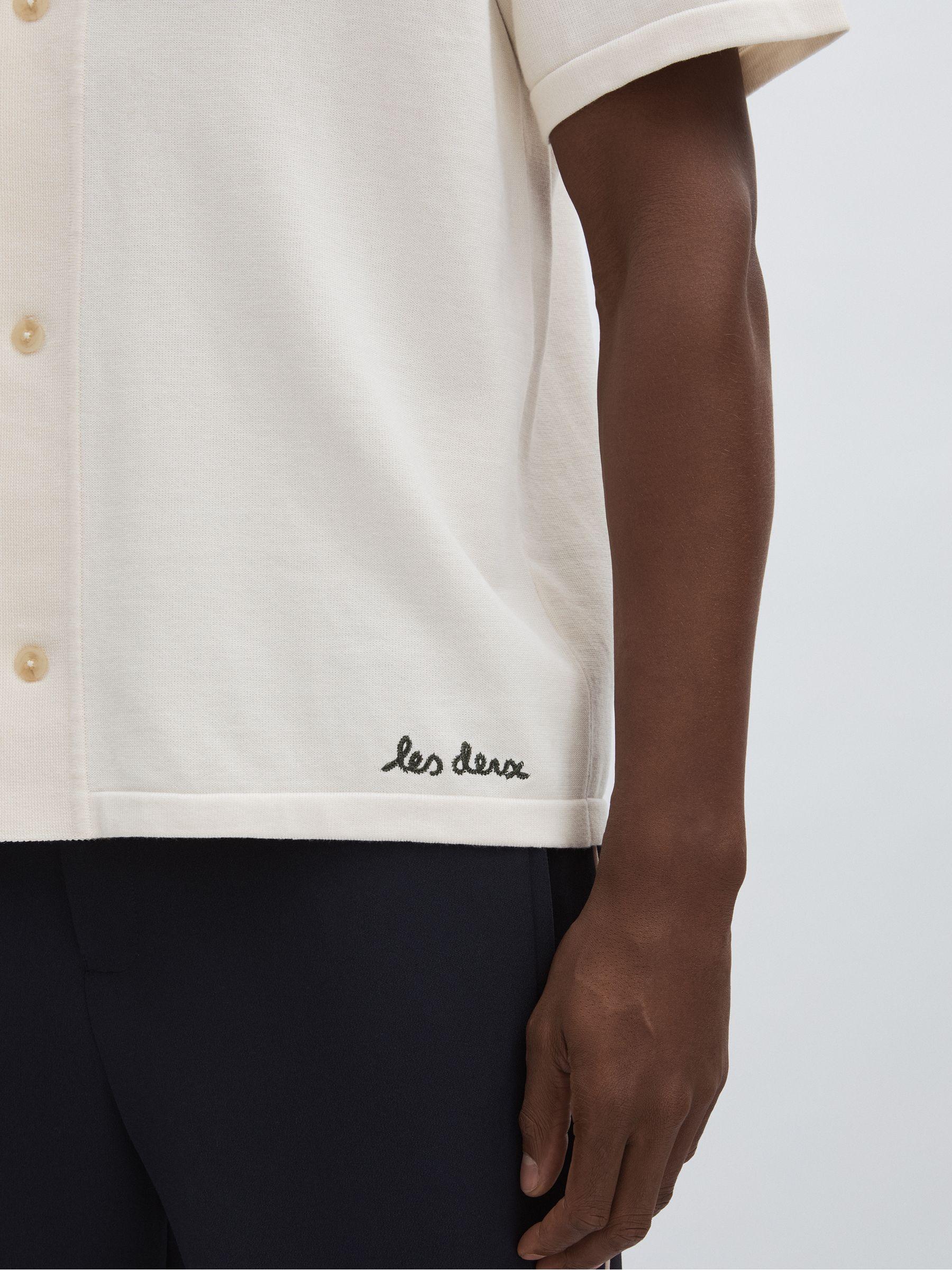 The Geoffroy shirt is an elevated knitted style crafted from 100% cotton for a soft feel and a premium aesthetic. A bright floral motif brings an unexpected element to the back, whilst subtle logo embroidery details the front hem for a signature finish. 100% cotton knit. Floral motif to the back. Cuban collar. Front buttons. Les Deux, curated by Reiss, is a Copenhagen-based menswear brand encapsulating the two contrasting style identities of its founder – preppy and urban, creative and entrepreneurial.