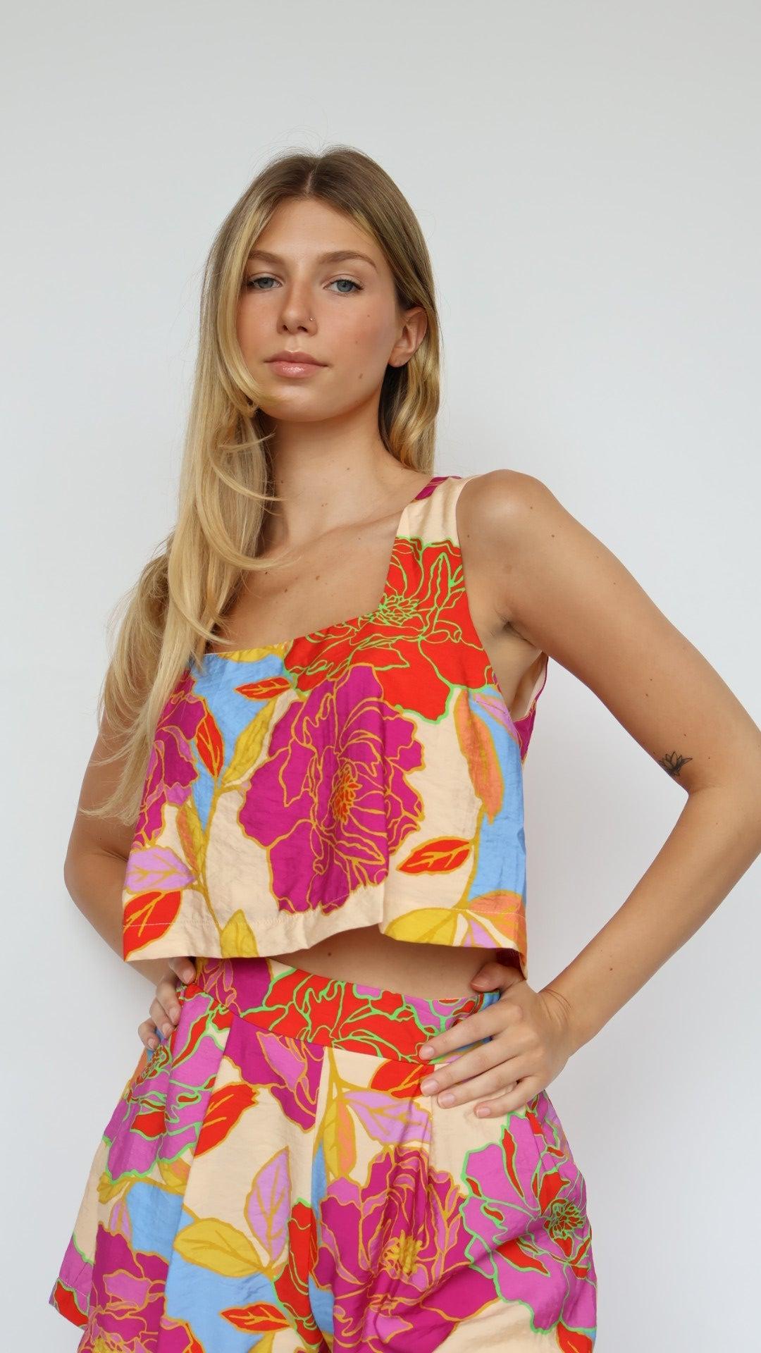 Sweet, breezy, and effortlessly stylish—this floral print crop top features a flattering square neckline and an easy swing fit for a floaty, feminine feel. The cropped length pairs perfectly with the matching shorts, high-waisted denim or skirts, while the soft floral print adds a touch of charm to any look. Lightweight and airy, it’s the perfect piece for sunny days and weekend outings.