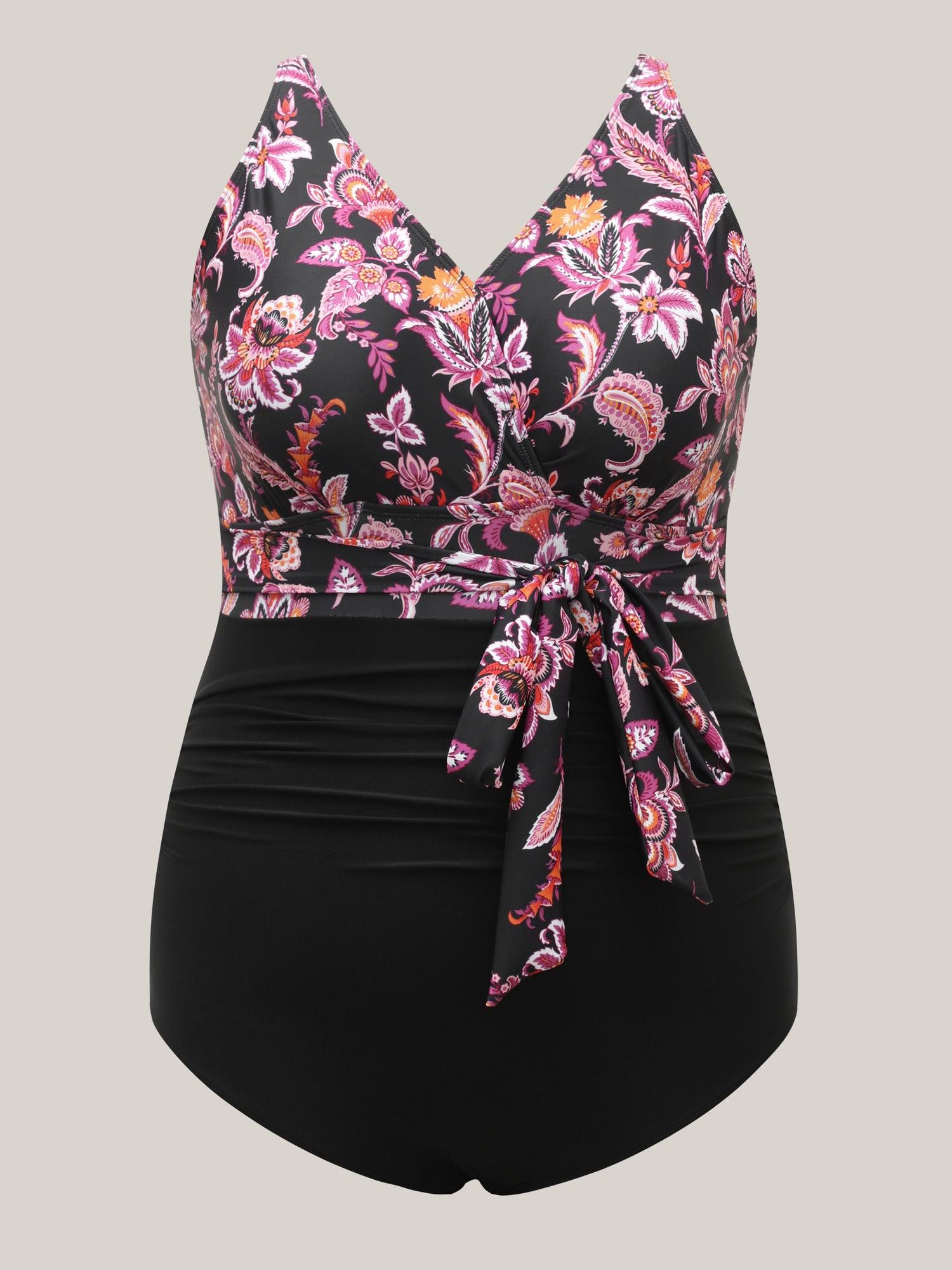 Shop Floral Print Front-Knot One-Piece Swimsuit now and redefine your style with confidence at BloomChic. Tailored for mid and plus-size women. This trendy Swimwear Women, sizes 10-30. Color:Black;Style:Beach Vacation;Cup Type:Removable cups;Coverage:Full;Neckline:Overlap Collar;Sleeve Type:Sleeveless;Prints:Floral;Details:Tie knot, Gathered;Pocket:No-pocket;Belt:Belt;Chest pad:Removable Padding;Lining:Lining;Closure Type:Non;Structural function:Tummy-Sculpt,Adaptive-Fit