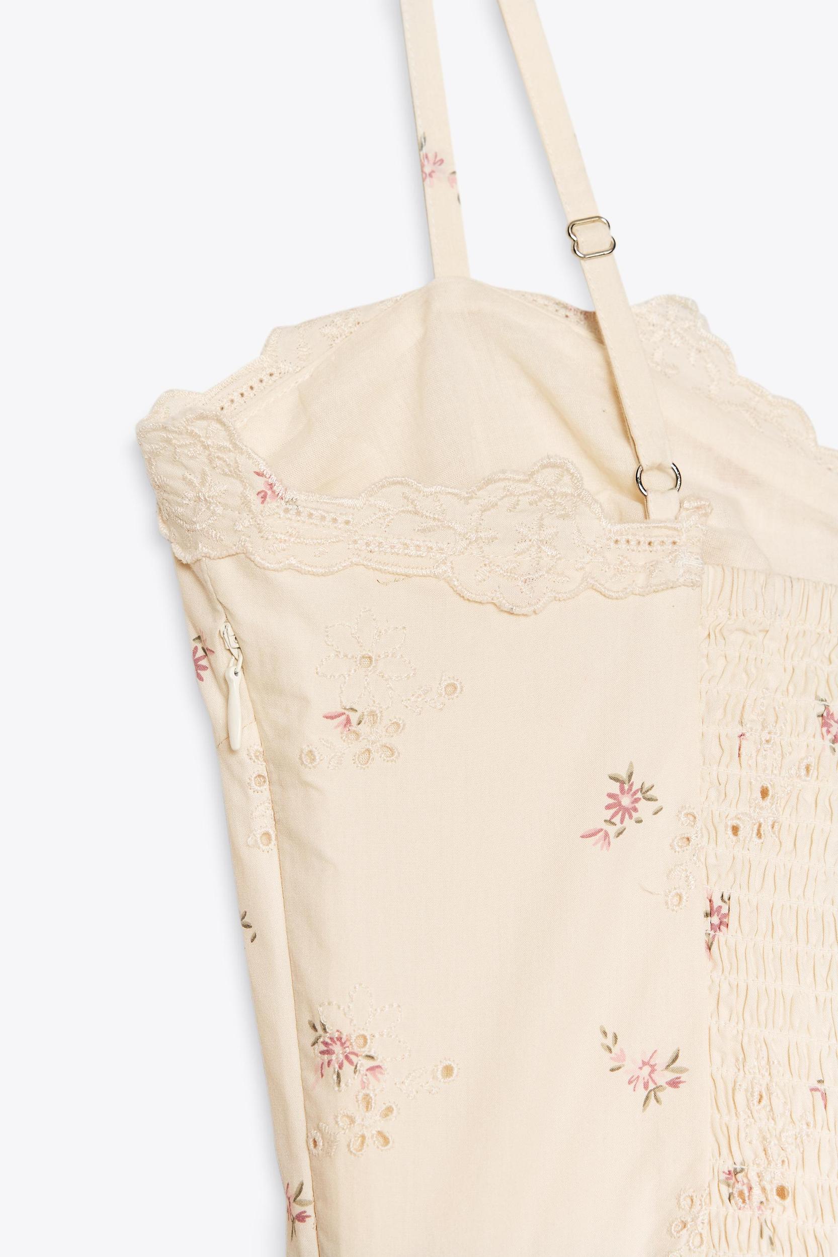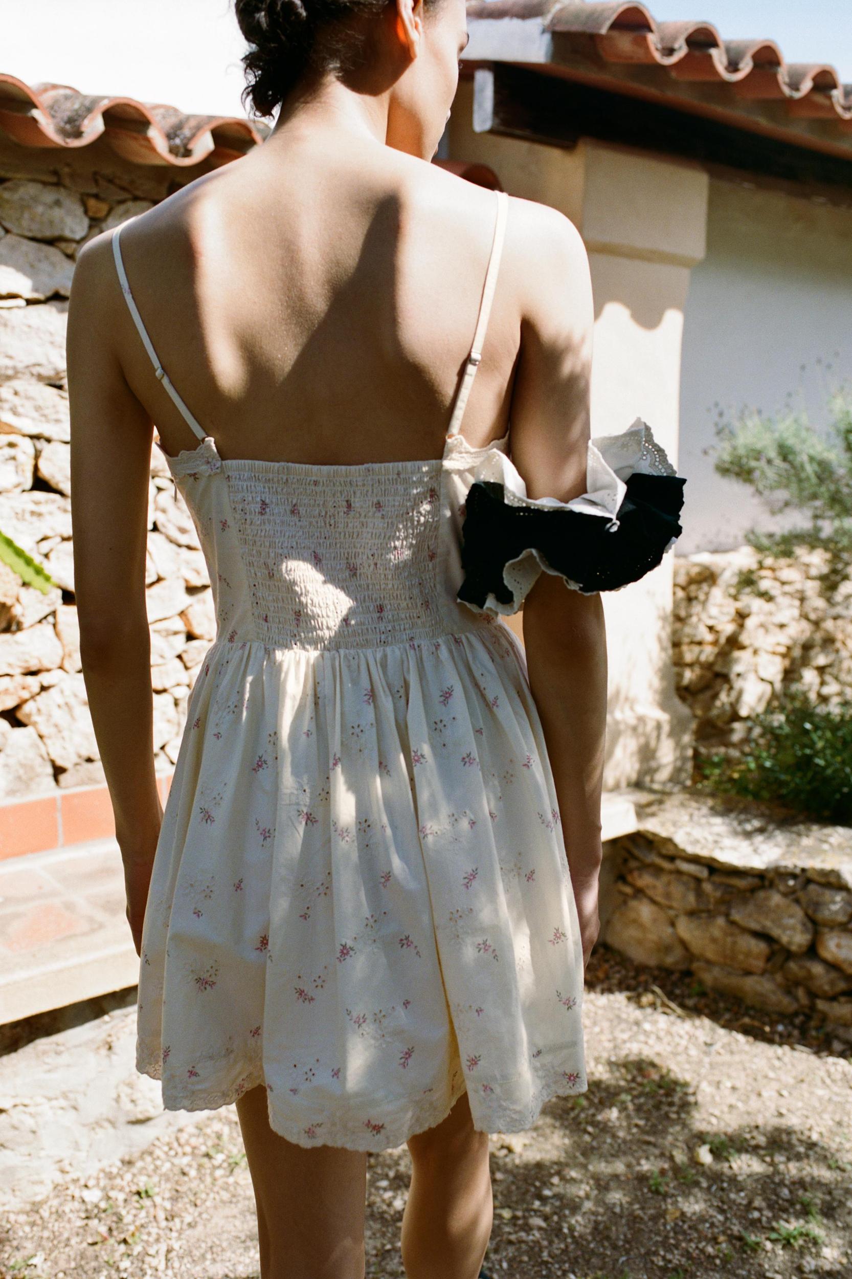 Short dress with a V-neck and adjustable thin straps. Features contrasting embroidered flower detail. Hidden side in-seam pockets. Honeycomb smocked elastic fabric at the back. Side hidden in-seam zip closure.