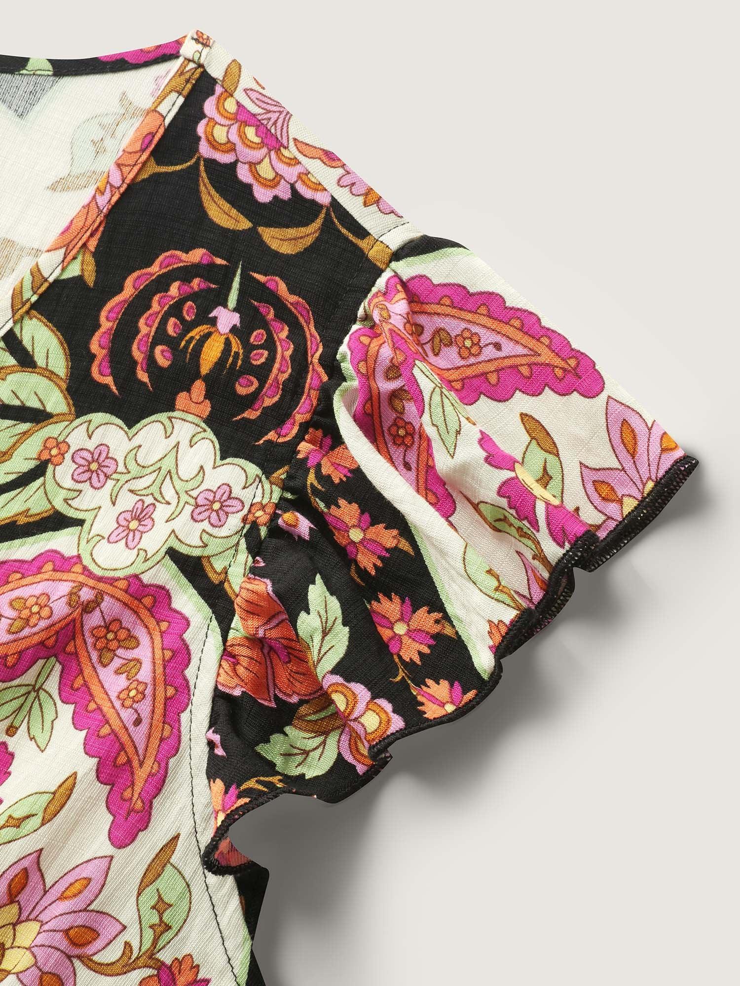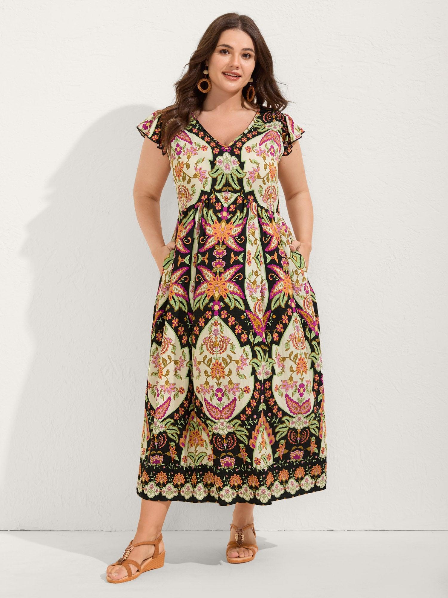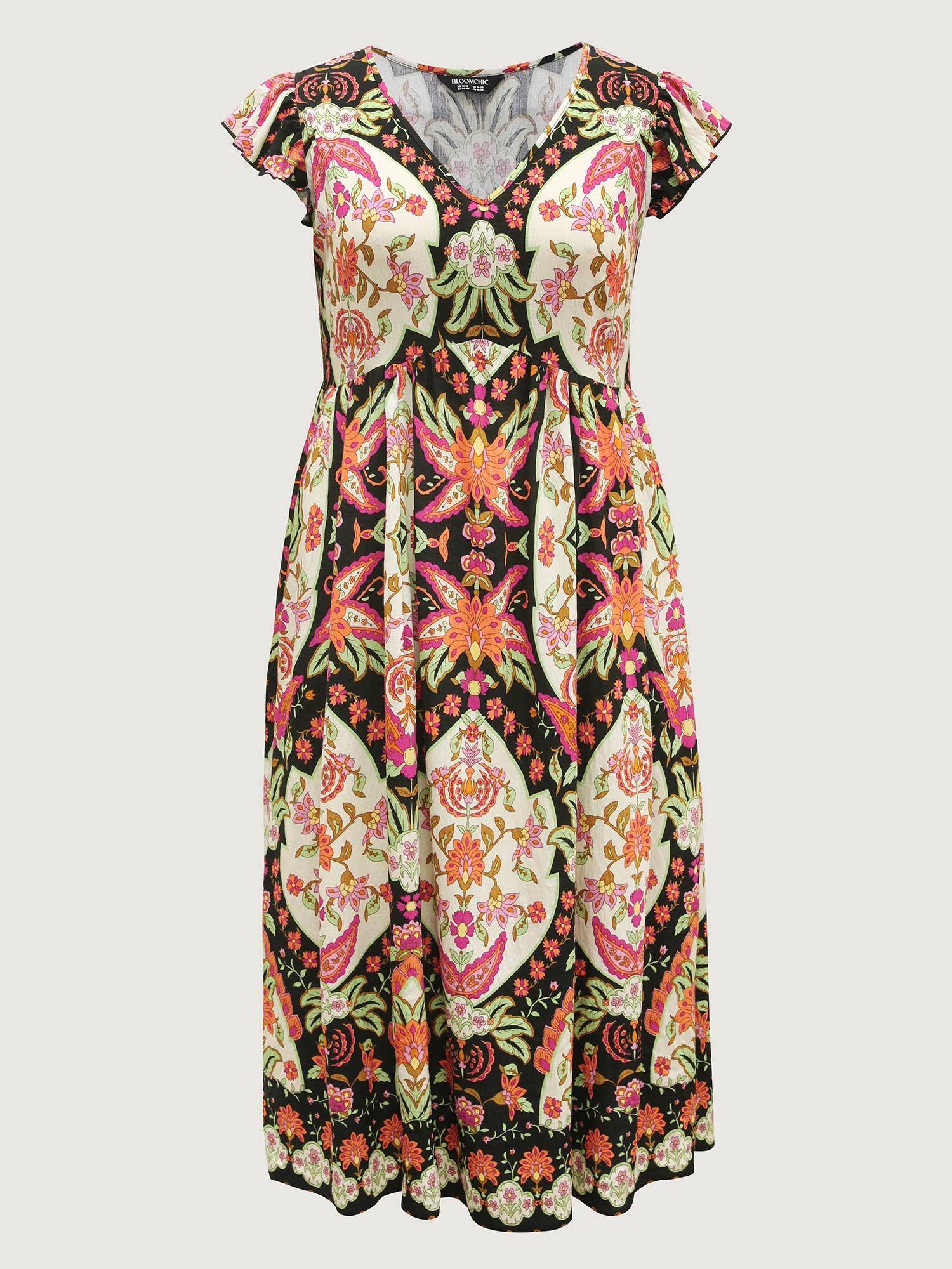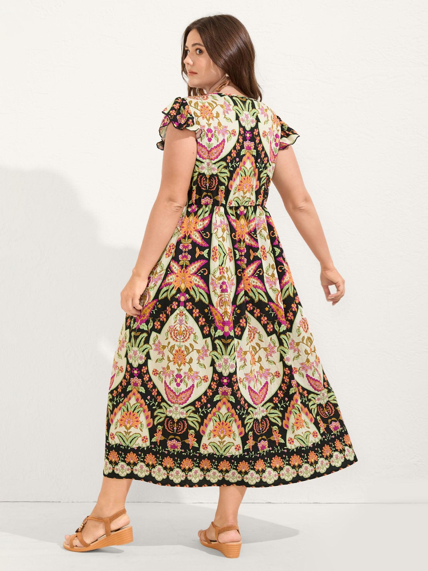Floral Print Ruffled Sleeve V-Neck Midi Dress Female