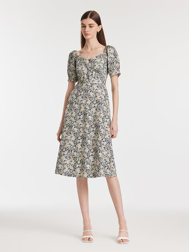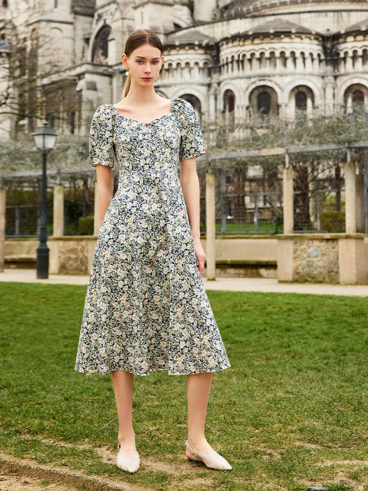 -Cotton -Square neck -Vacation wear This dress exudes a vintage vibe with its printed pattern and classic square neckline. The A-line shape enhances the silhouette for a more inclusive look. The square neckline shows off the shoulder and neckline for a more stylish aesthetic. Elegant and romantic, this dress is perfect