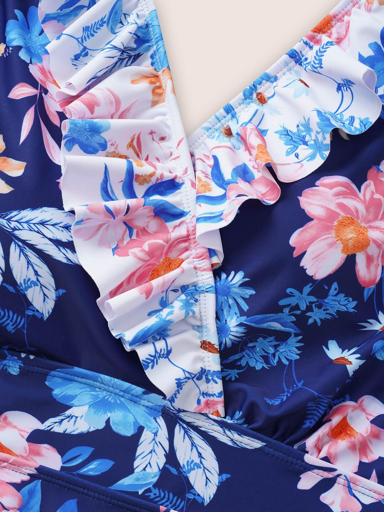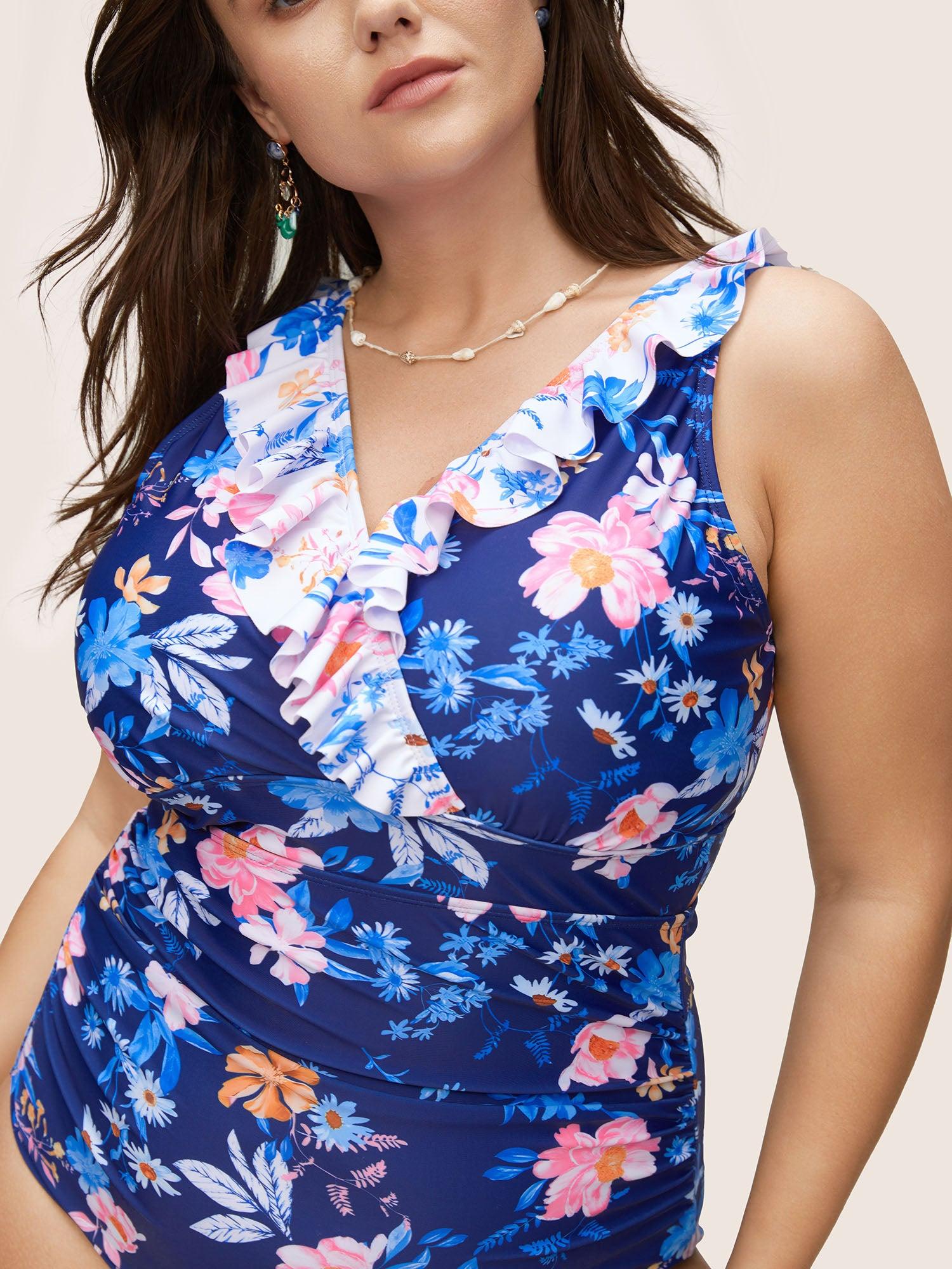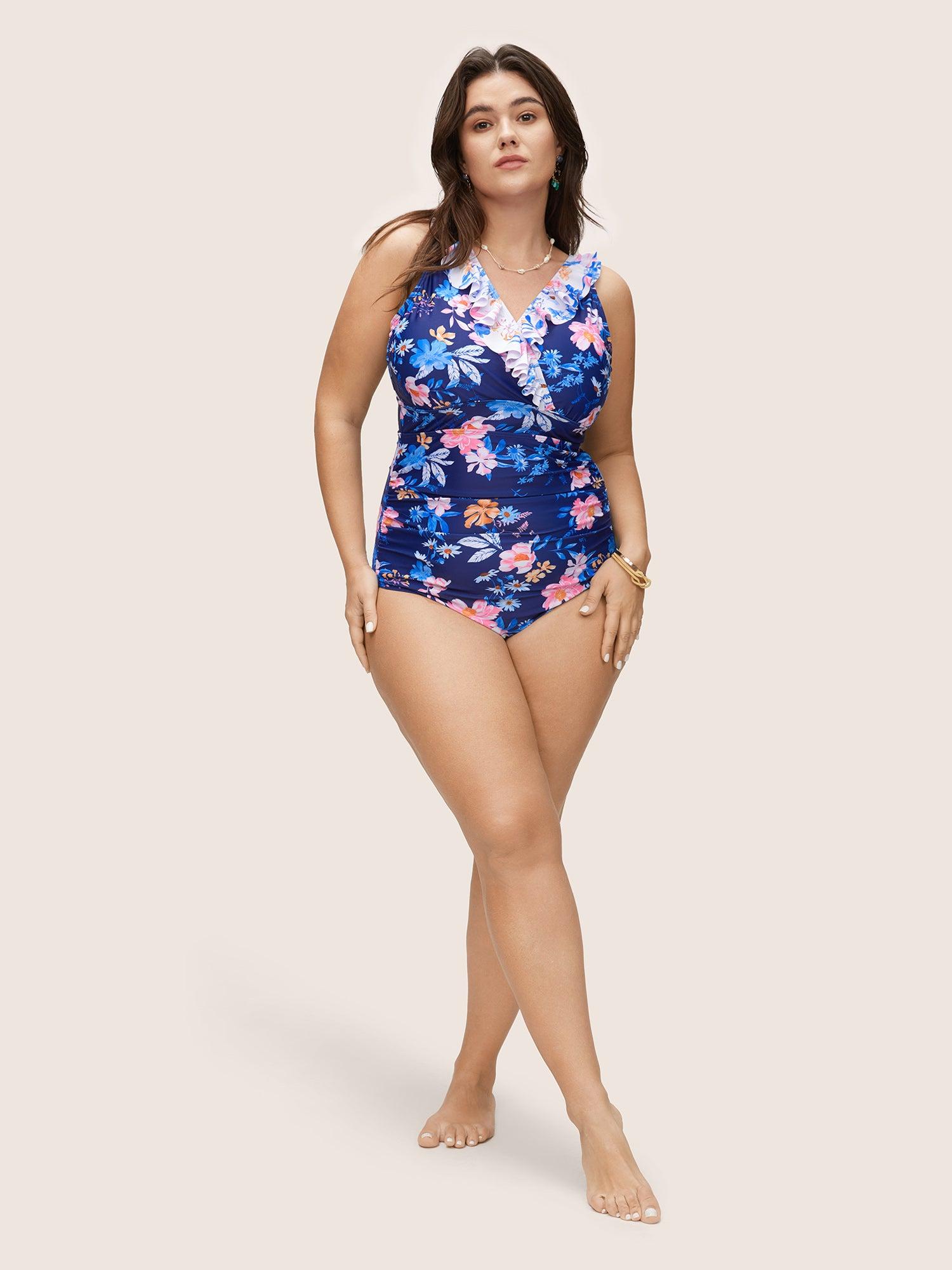 Shop Floral Ruffle Trim Adjustable Straps One Piece Swimsuit now and redefine your style with confidence at BloomChic. Tailored for mid and plus-size women. This trendy Swimwear Women, sizes 10-30. Season:Spring;Color:Indigo;Bra Type:Wireless;Coverage:Full;Waist Design:High Rise;Neckline:V-neck;Sleeve Type:Sleeveless;Pattern Type:Floral;Pocket:No-pocket;Belt:No-belt;Chest pad:Removable Padding;Lining:Lining