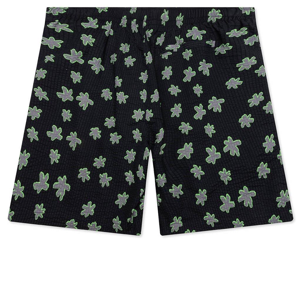 Pleasures introduces the Floral Seersucker Shorts in its latest collection. Made from lightweight seersucker fabric, these shorts feature a subtle puckered texture that promotes airflow. The all-over floral print adds a bold, expressive touch, while the relaxed fit ensures all-day comfort. Finished with an elastic waistband, 3-pocket design, and embroidered 'PLEASURES' logo at the hem. 100% Cotton Seersucker fabric Relaxed fit Elastic waistband with internal drawstrings Side pockets Rear back pocket Embroidered logo Style no: P25SU030-BLACK P25SU030 BLAC