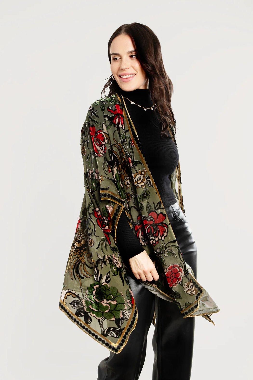 Luxuriate in comfort and style with our Floral Sheer Velvet Ruana. Delicate florals and playful polka dots add a whimsical touch to this elegant layering piece. This sheer tapestry is perfect for special occasions or cozy nights, making it the ideal layering piece for all your layering needs.