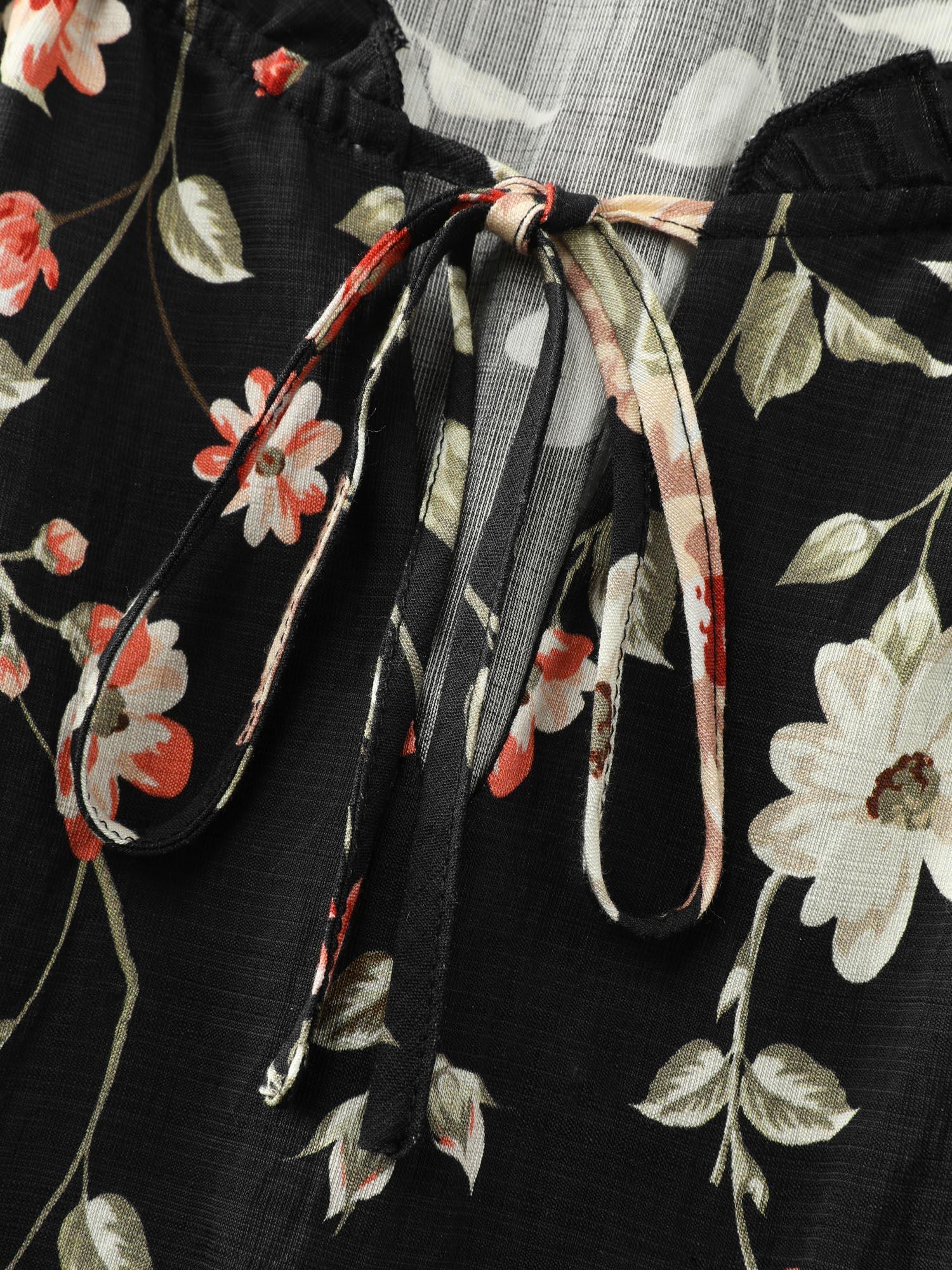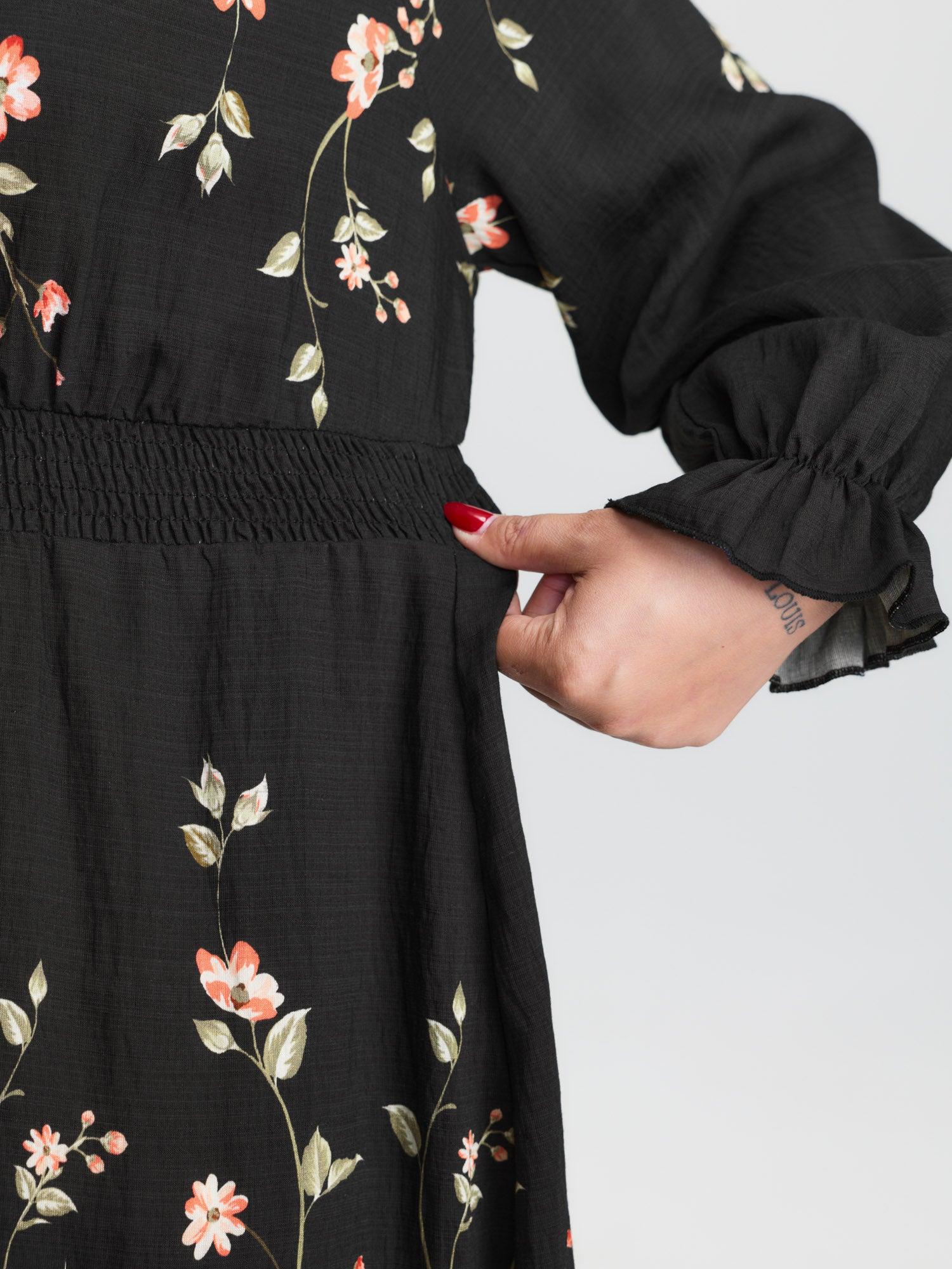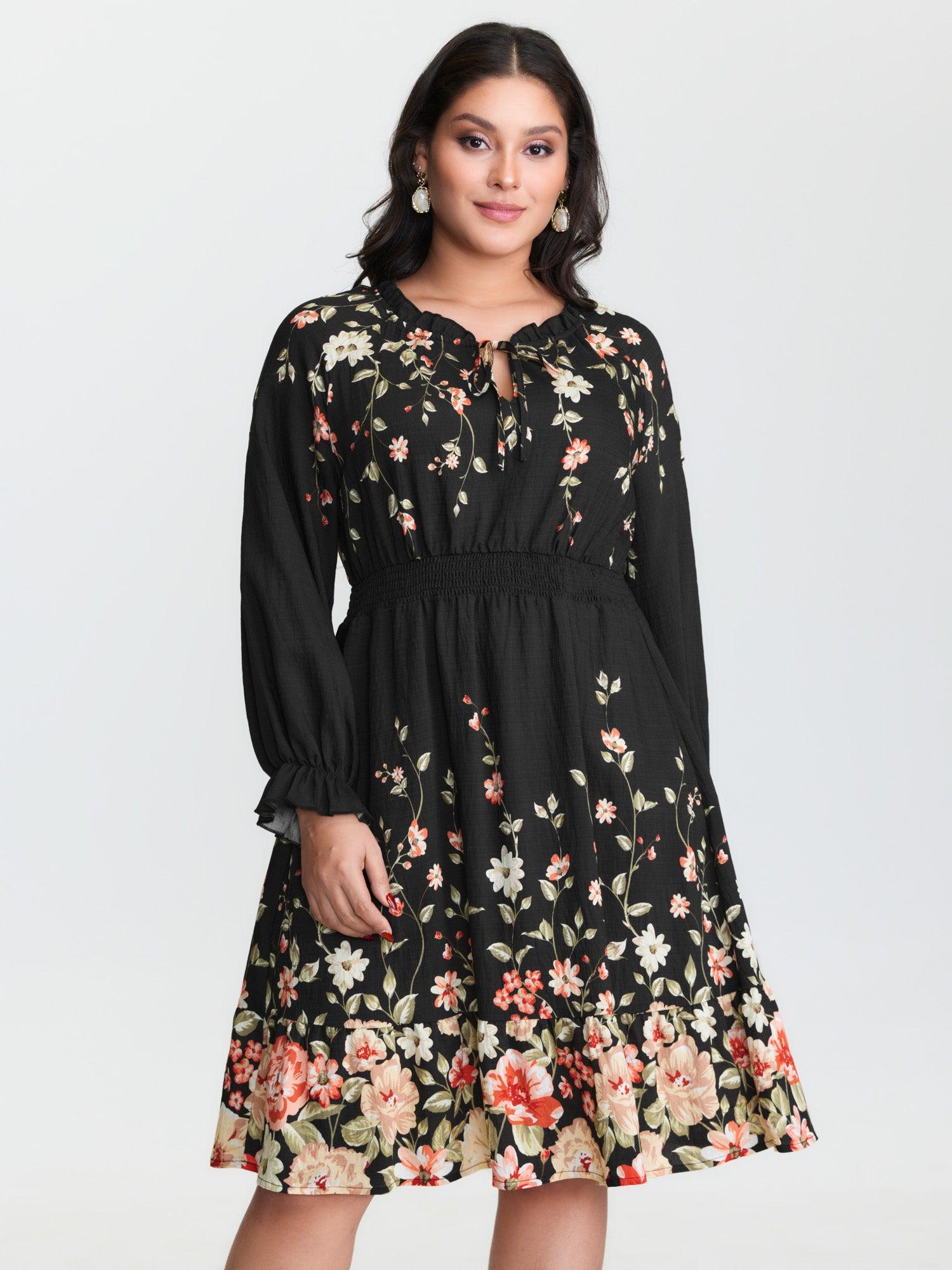 Shop Floral Shirred Waist Neck-Tie Midi Dress now and redefine your style with confidence at BloomChic. Tailored for mid and plus-size women. This trendy Dress, sizes 10-30. You can never go wrong with BloomChic Dresses. Color:Black;Style:Timeless;Neckline:Flat collar with V-notch;Sleeve Type:Elastic cuff;Prints:Ditsy floral;Details:Shirred, Ruffles, Knotted, Contrast, Gathered;Pocket:Side seam pocket;Belt:No-belt;Closure Type:Non