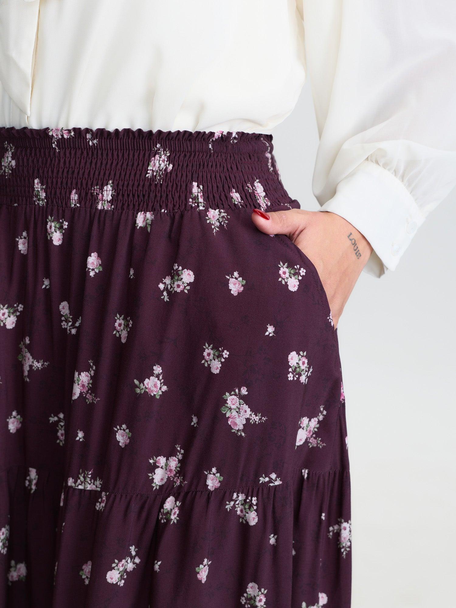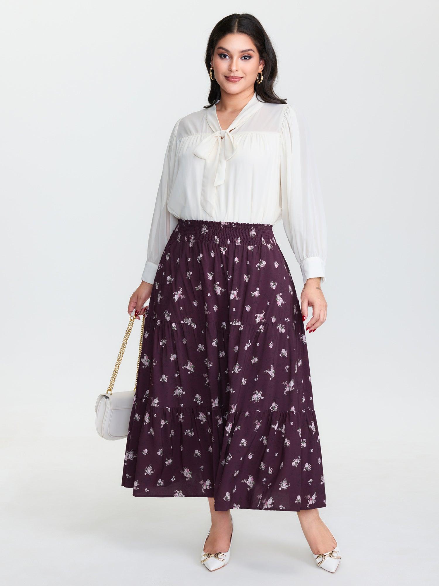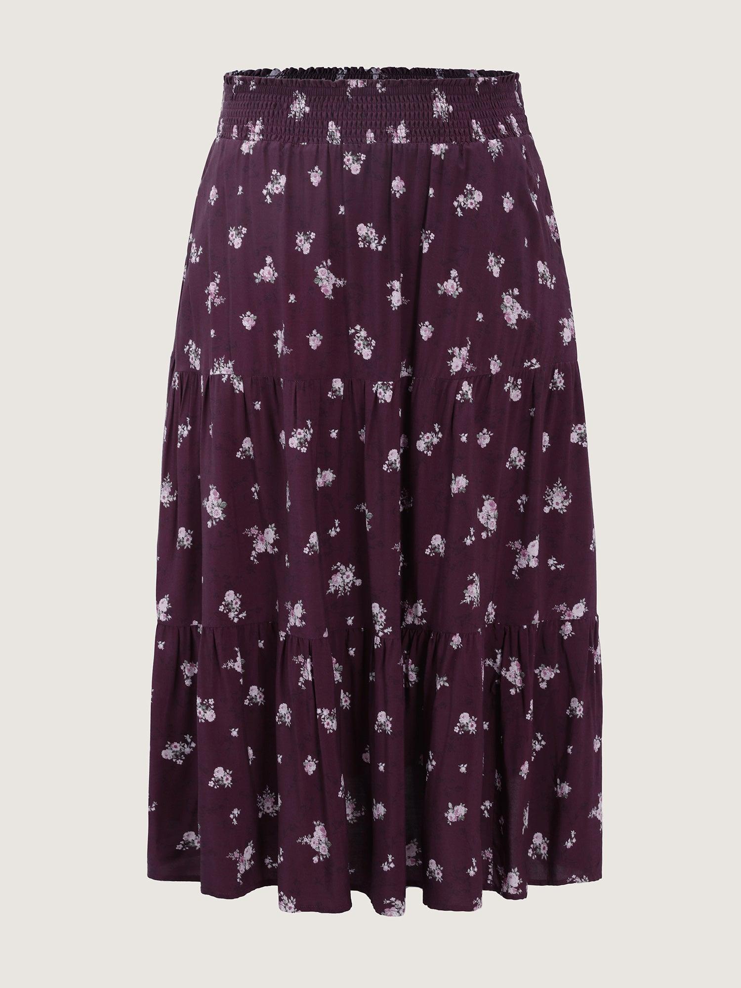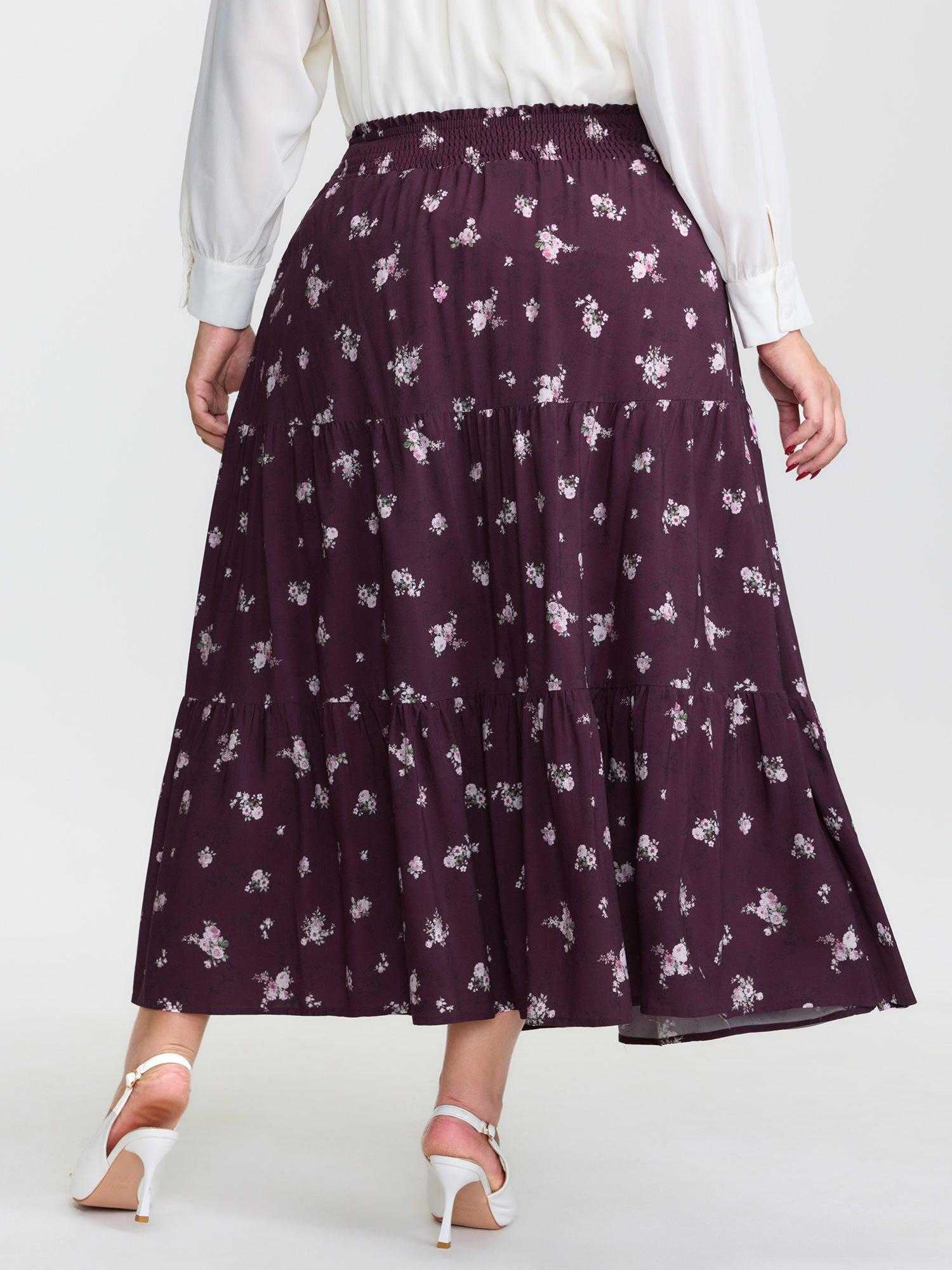 Shop Floral Shirred Waist Tiered Maxi Skirt now and redefine your style with confidence at BloomChic. Tailored for mid and plus-size women. This trendy Bottoms Women, sizes 10-30. Color:Burgundy;Style:Retro;Prints:Floral;Details:Shirred, Gathered, Contrast;Pocket:Slanted pocket;Belt:No-belt;Closure Type:Non