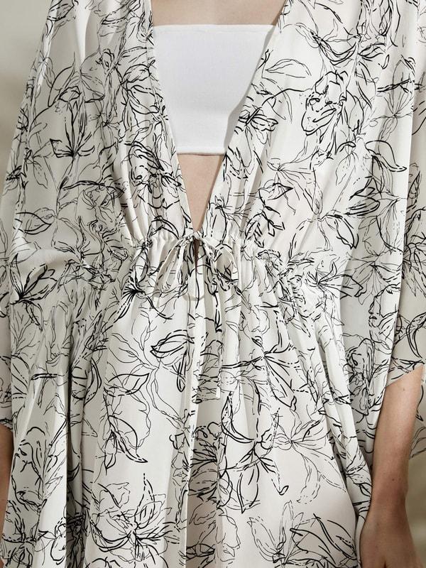This relaxed-fit cardigan is designed with an elegant black-white floral pattern, adding to its charm and versatility. It is made with 100% silk and the three-quarter sleeve with waist rope makes it easy to mix and match.