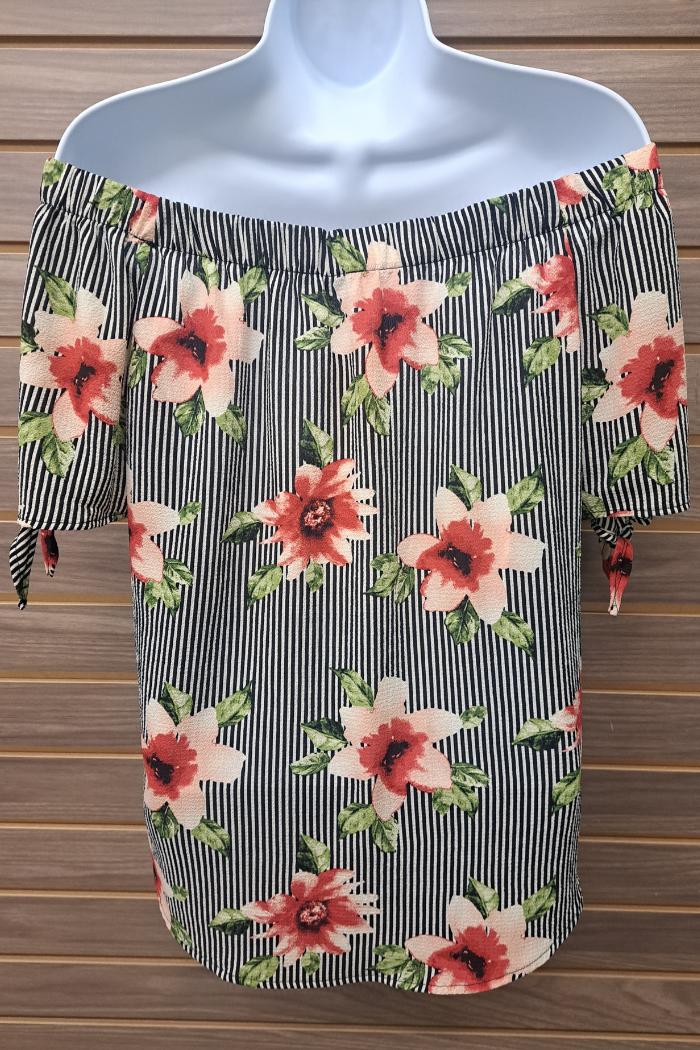 This Floral Stripe Off Shoulder Tie Sleeve top has a gorgeous, feminine design, made of a lightweight and breathable fabric blend of 96% rayon and 4% spandex. The tie sleeve offers an adjustable fit, while the off-shoulder cut adds a stylish and flirty touch, perfect for any occasion.