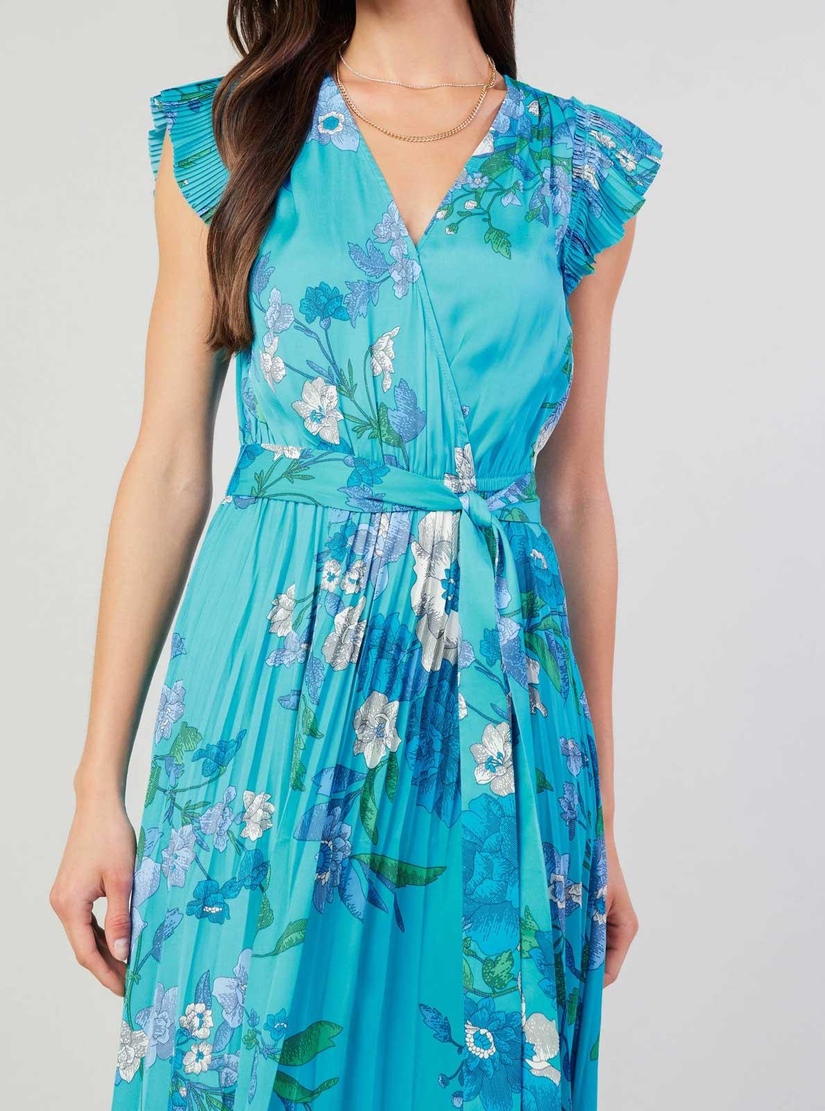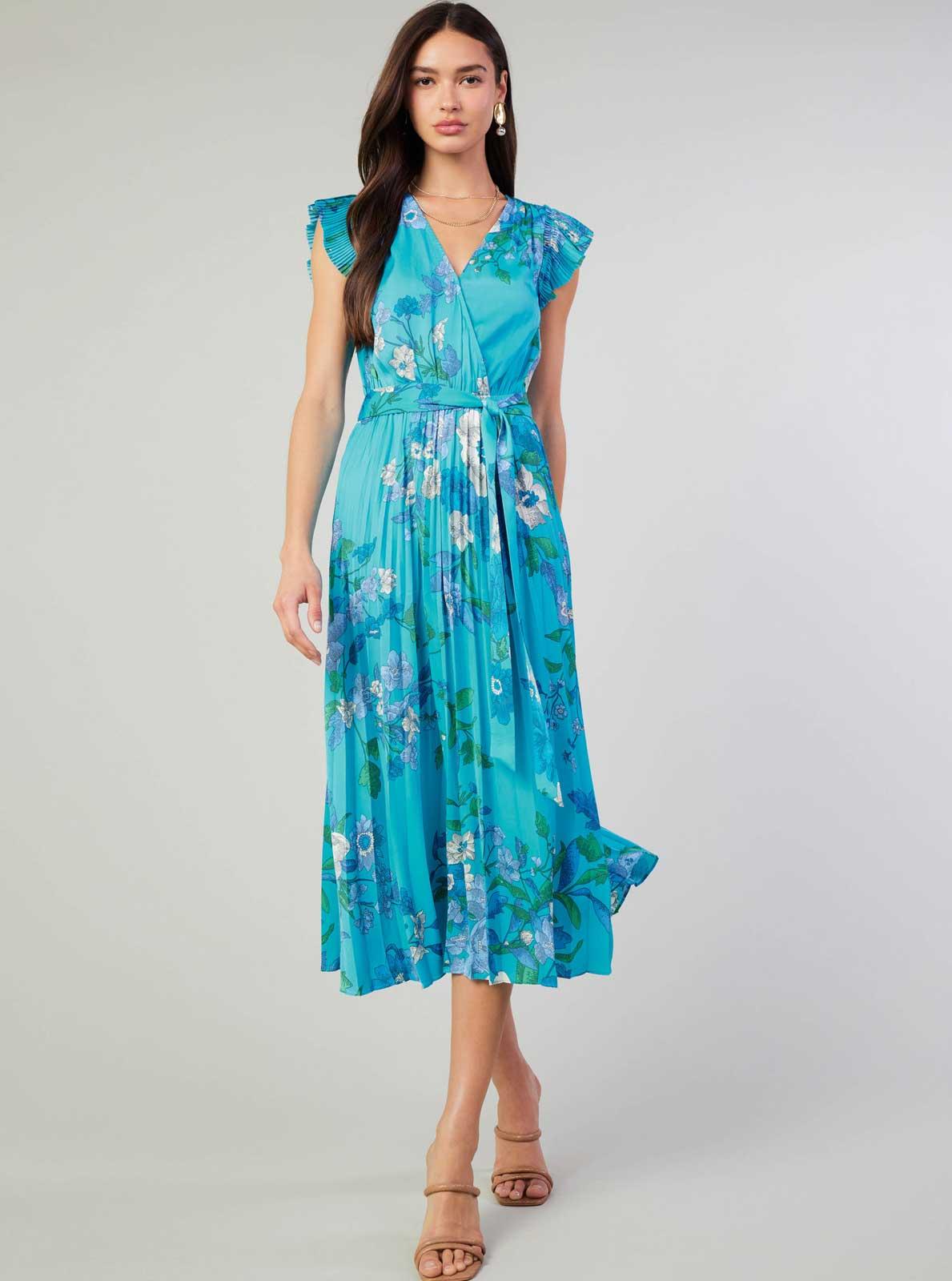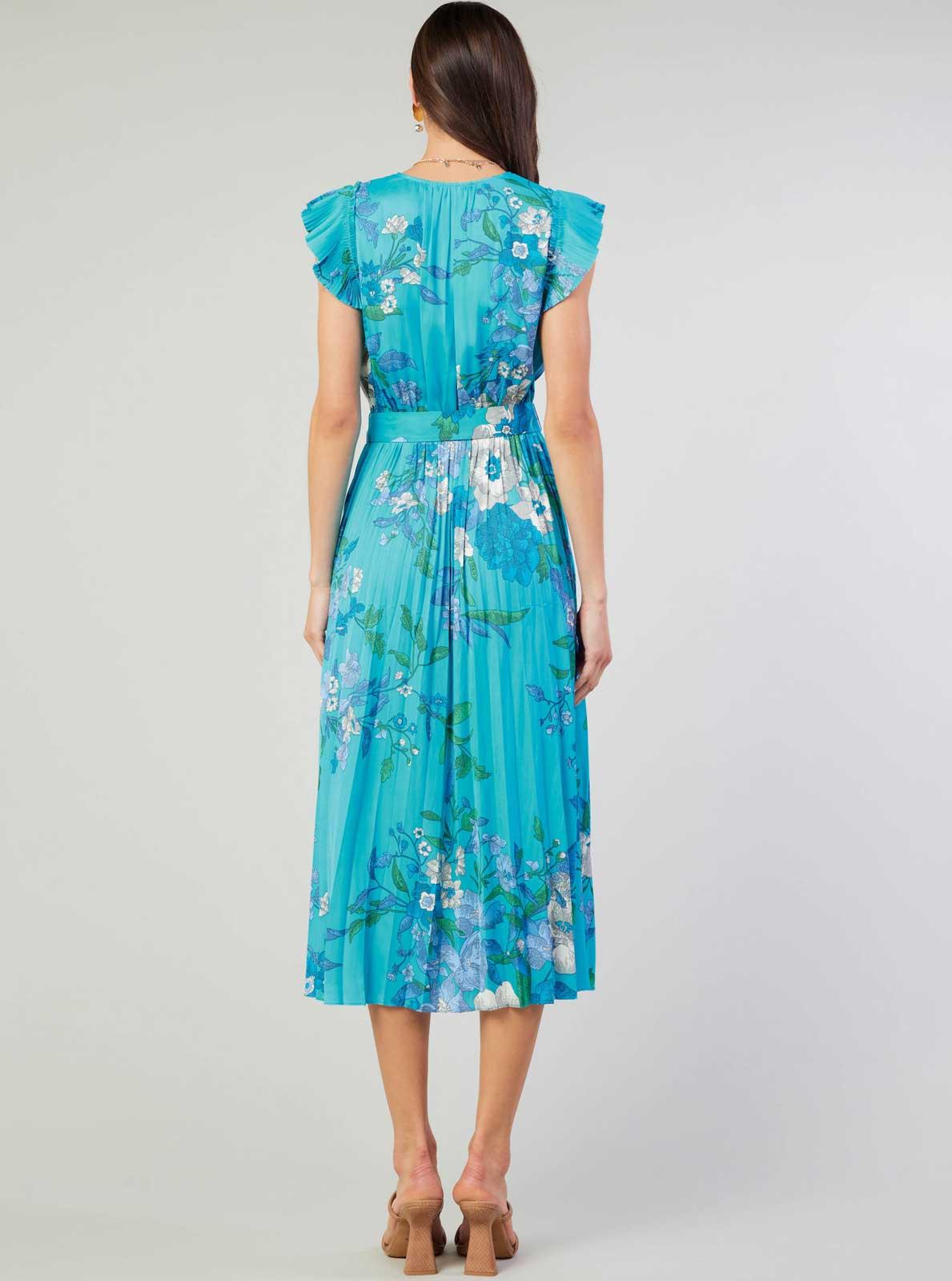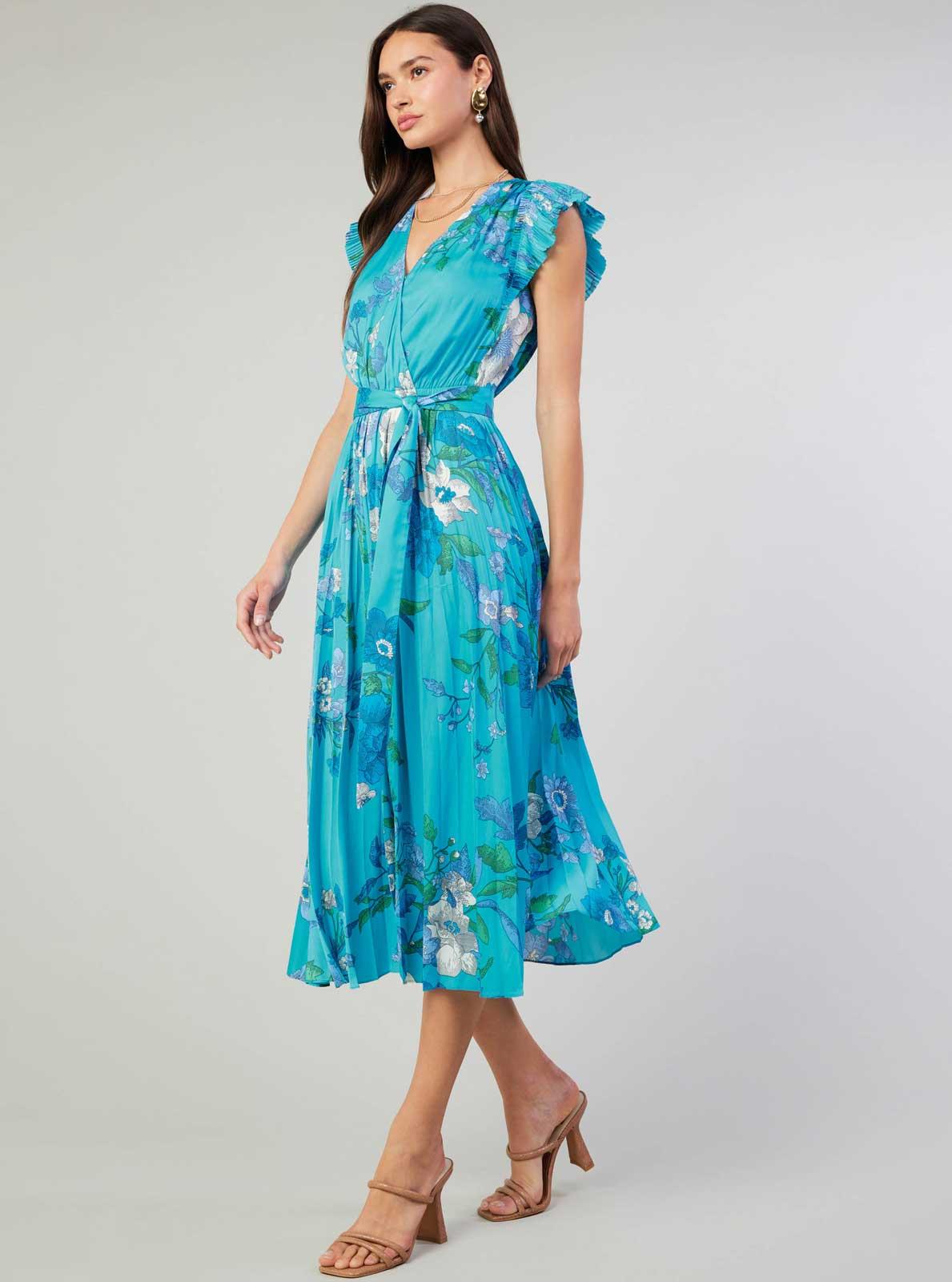 Flaunt your feminine side with our Floral Surplus Midi Dress! This stunning dress features flutter sleeves, pleated details, and a self-waist belt for a flattering fit. Perfect for any occasion, this dress is sure to make you feel confident and beautiful.