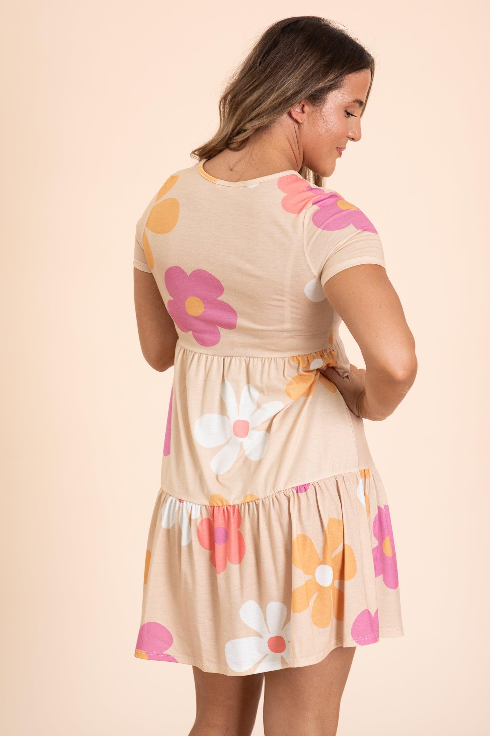 Product Details Colors: Tan, Pink, Dark Orange, Off White/ Baby Blue, Off White, Orange, Coral, Pink Print: Floral Neckline: Round Sleeve: Short Sleeve Hemline: Straight Brand: BomBom Material and Care 95% Polyester 5% Spandex Hand Wash Cold Hang/Line Dry Size and Fit Small: Bust 32" Waist 30" Length 35" Medium: Bust 34" Waist 32" Length 35" Large: Bust 36" Waist 34" Length 35" X Large: Bust 38" Waist 36" Length 35" Model is 5'7 and wearing a size small