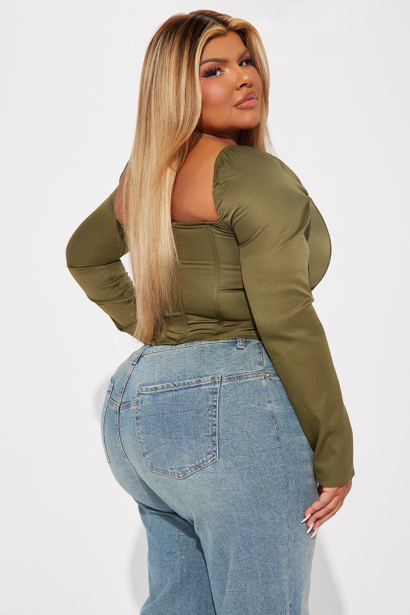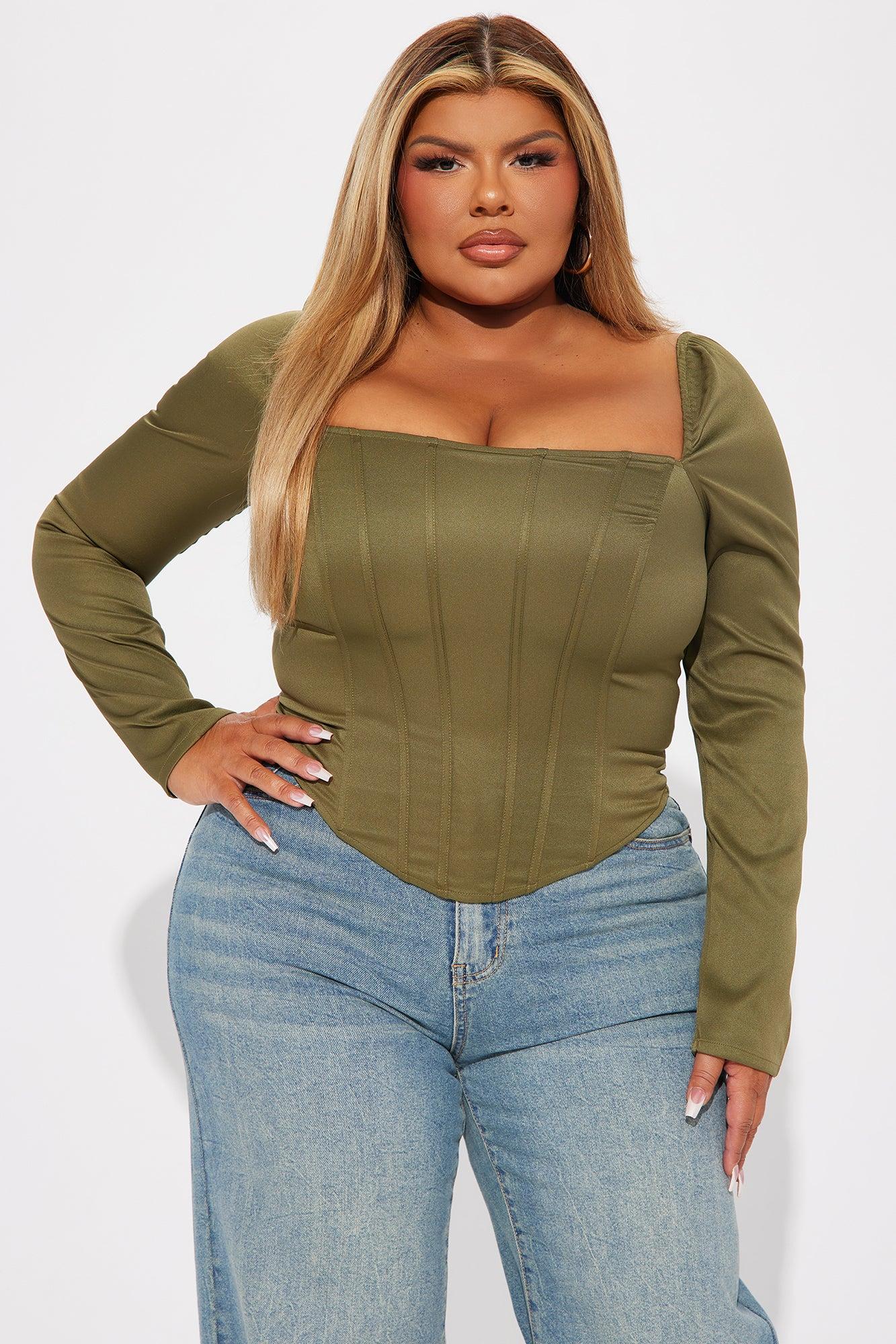 Available In Black And Olive. Corset Top Long Sleeve Boning Square Neck V Hem Back Zipper Closure Cropped Fully Lined Non Stretch Shell: 96% Polyester 4% Spandex Lining: 100% Polyester Imported