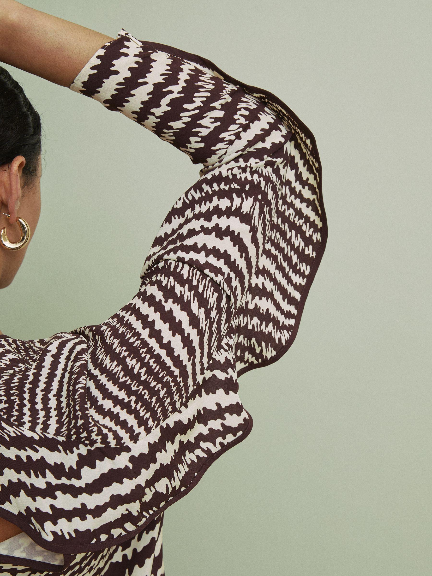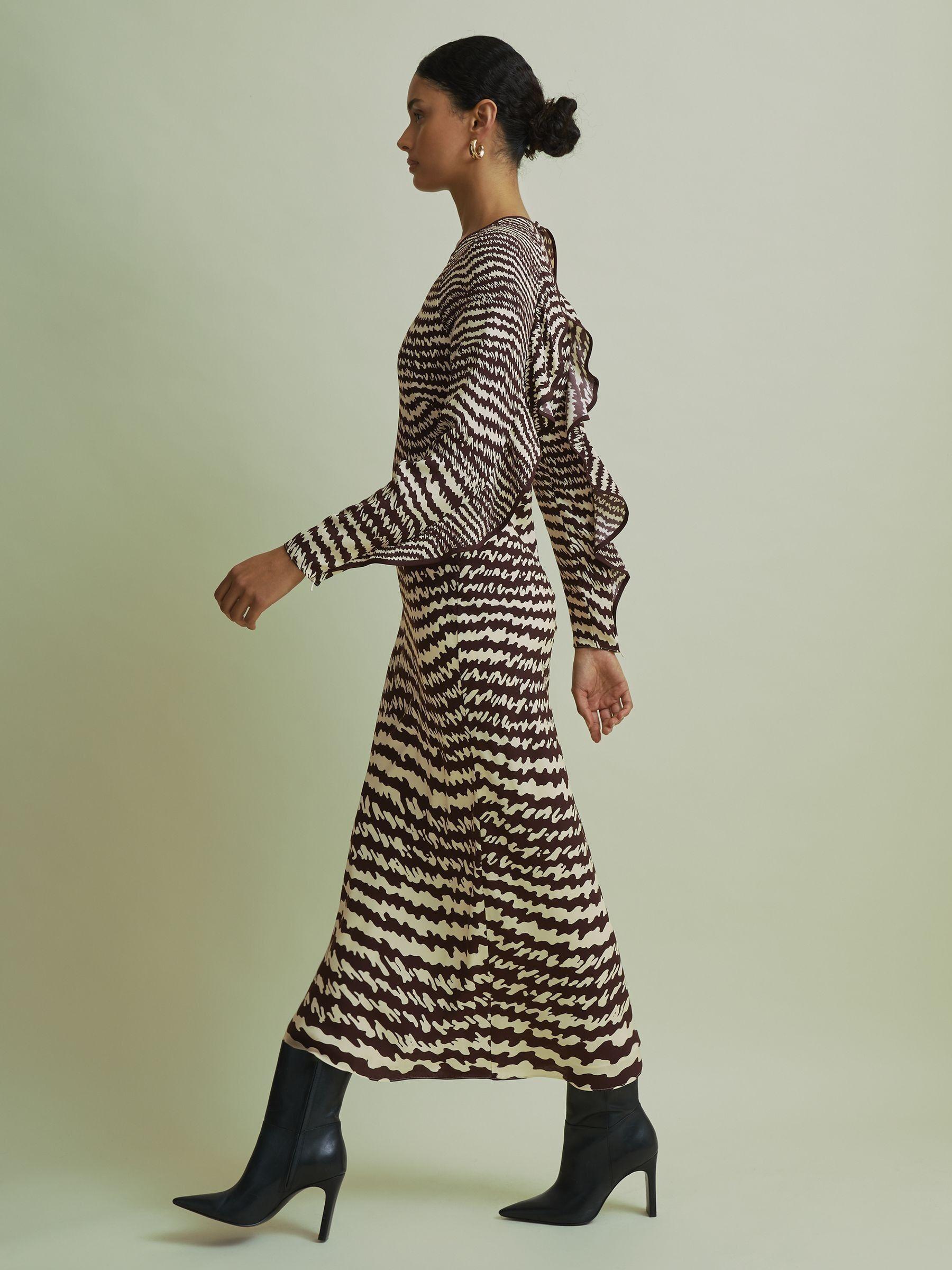 Designed in a flattering column silhouette, this midi dress falls straight through the body with ruffle details at the back. It s fitted through the sleeves and complete with zip cuffs. Florere s Grace print adds a graphic element to the collection, embodying a textural abstract feel. Crew neckline. Open-back design. Ruffle detailing to reverse. Fitted sleeves. Zip details to cuffs. Midi length. Florere is a modern womenswear brand, that creates a distinct presence in the contemporary premium occasionwear market by inspiring women's wardrobes with bold colours, statement prints, distinctive detailing, and considered versatile designs.