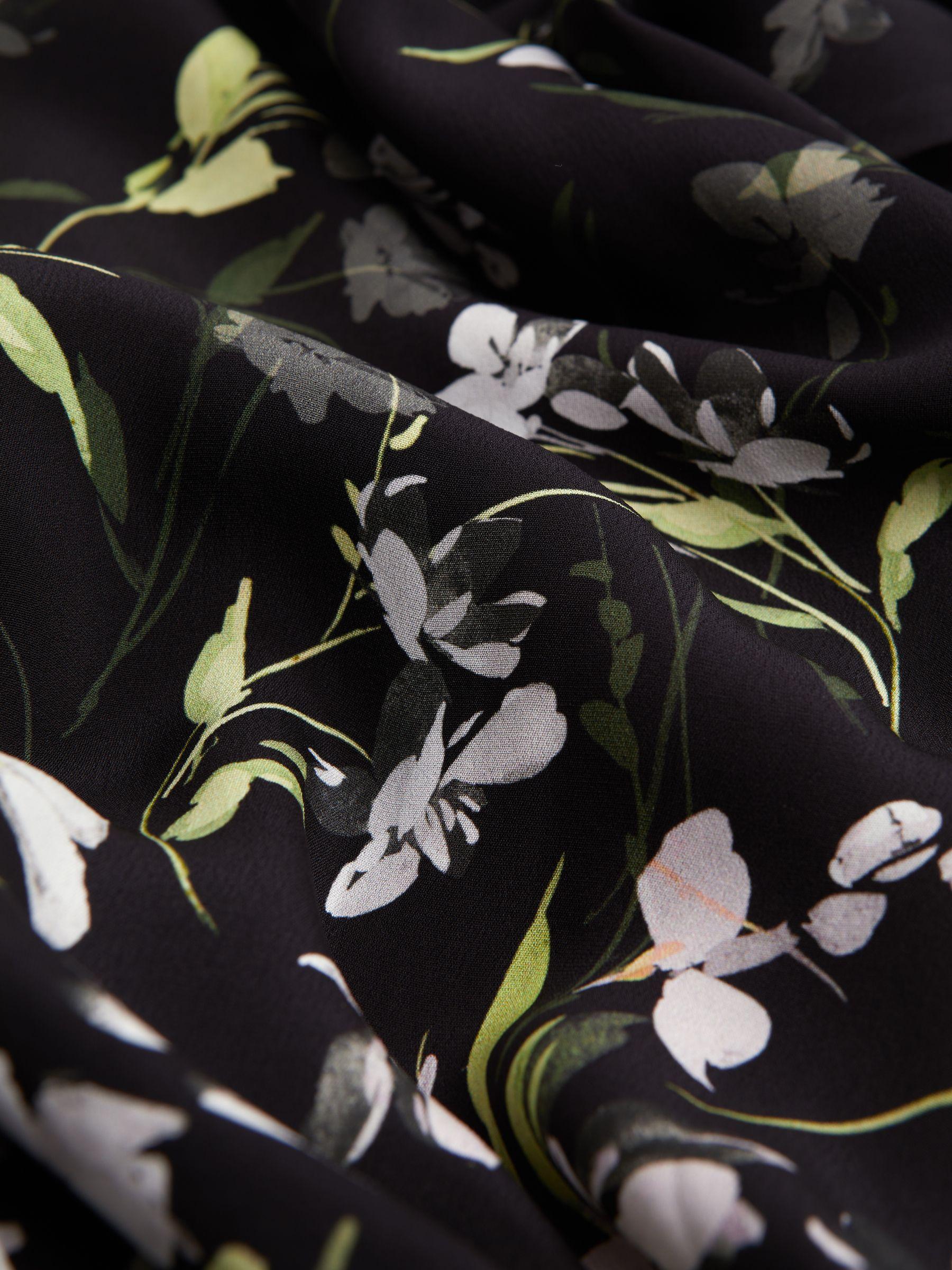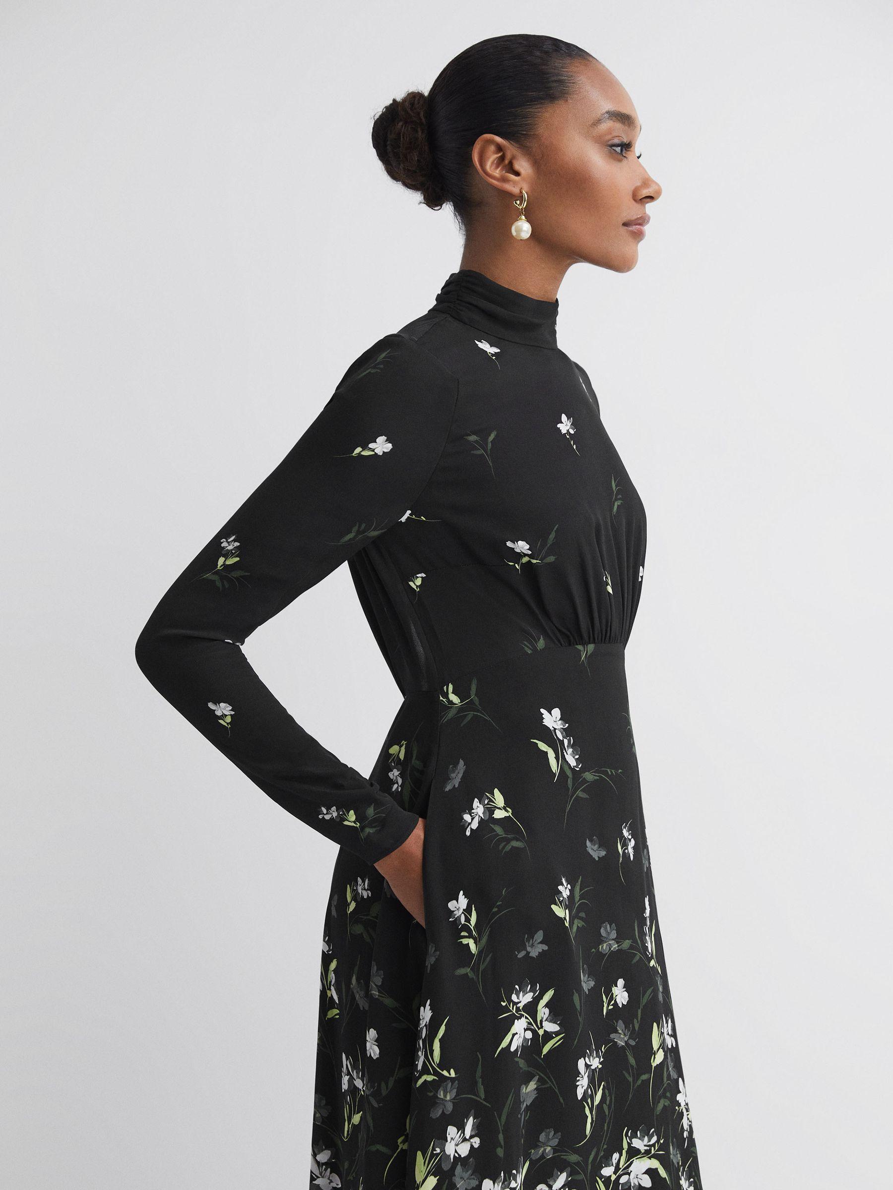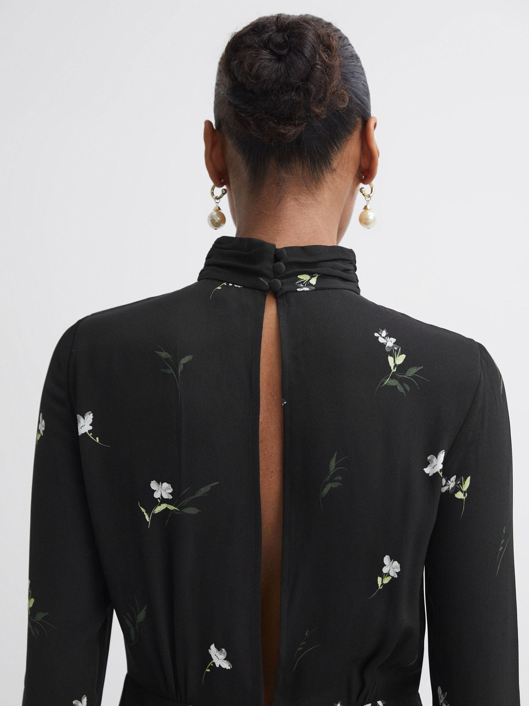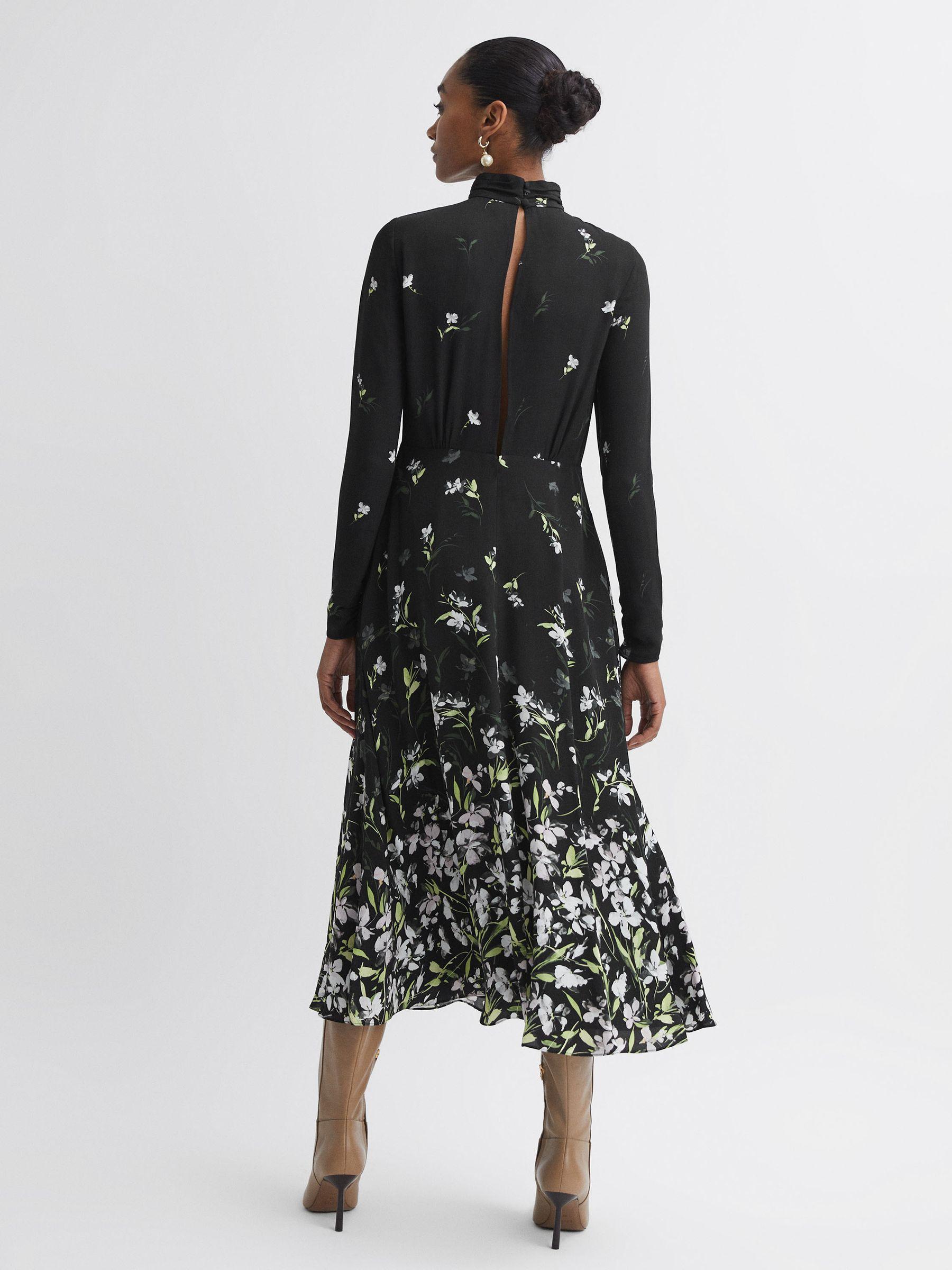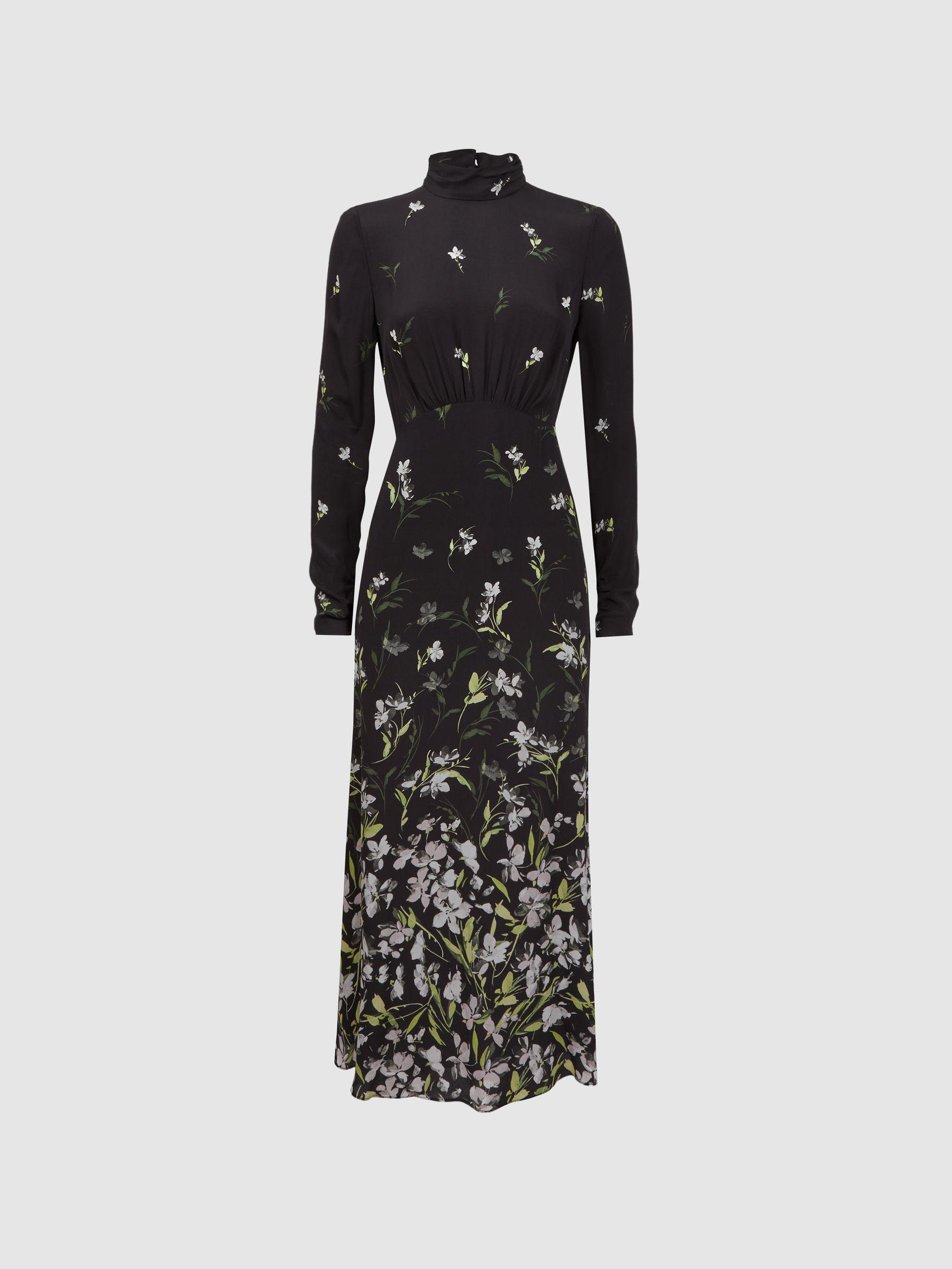 Florere is a new brand for women that celebrates the boldly feminine, creating timeless and eye-catching pieces from vintage archives, then reimagining them in vibrant colourways and fluid fits. This black dress is an ideal pick for your special occasions, thanks to its intricate floral print and sophisticated midi length. A high neckline and long sleeves streamline the profile. Pair with heeled boots to complete this eveningwear edit. Florere’s Nocturnal Garden print takes inspiration from the works of Giorgio Taroni, a prestigious textile designer in the late 20th century who widely experimented with intricate floral patterns. High neckline Long sleeves Keyhole detail to reverse Fit-and-flare silhouette Midi length