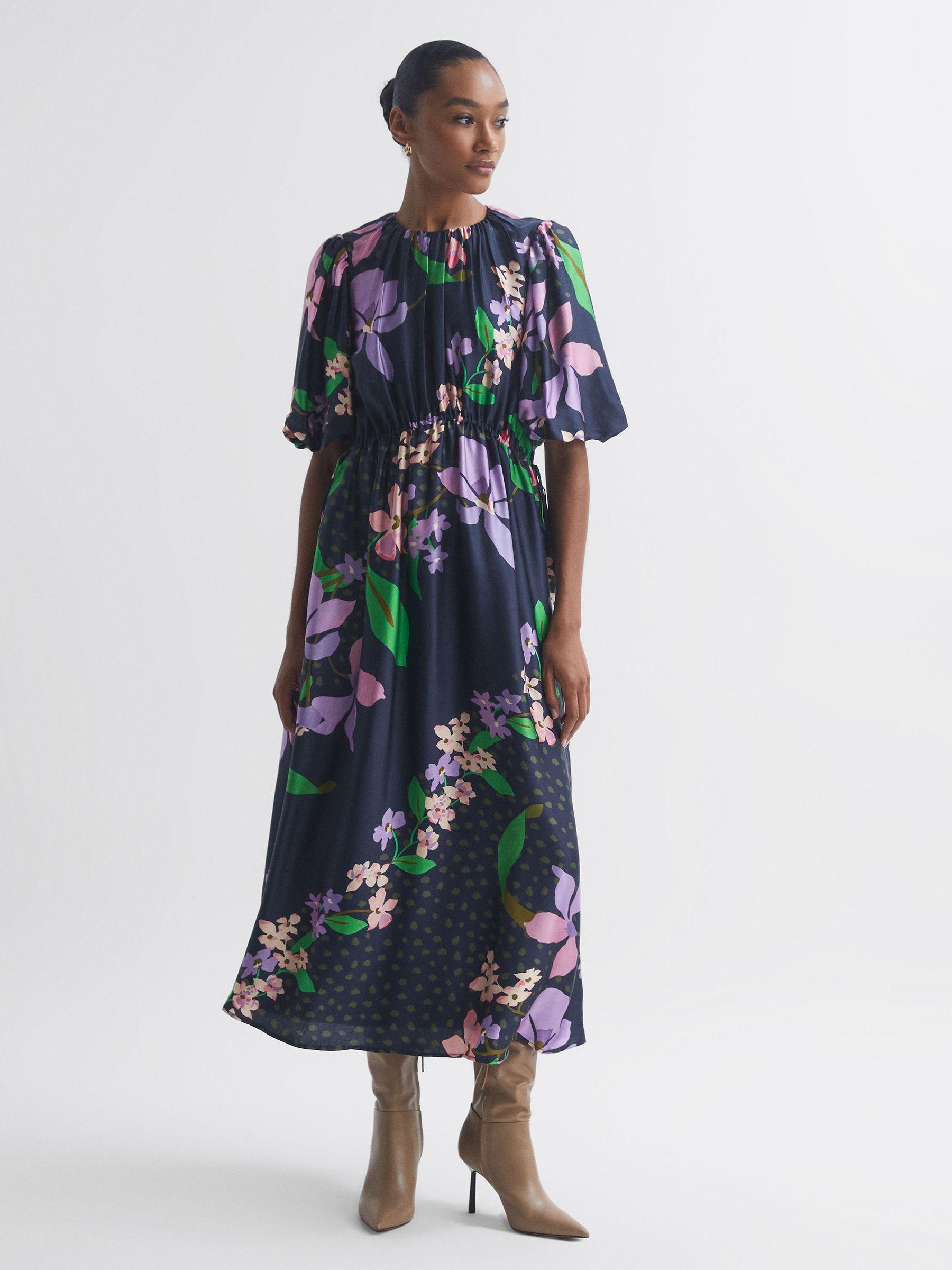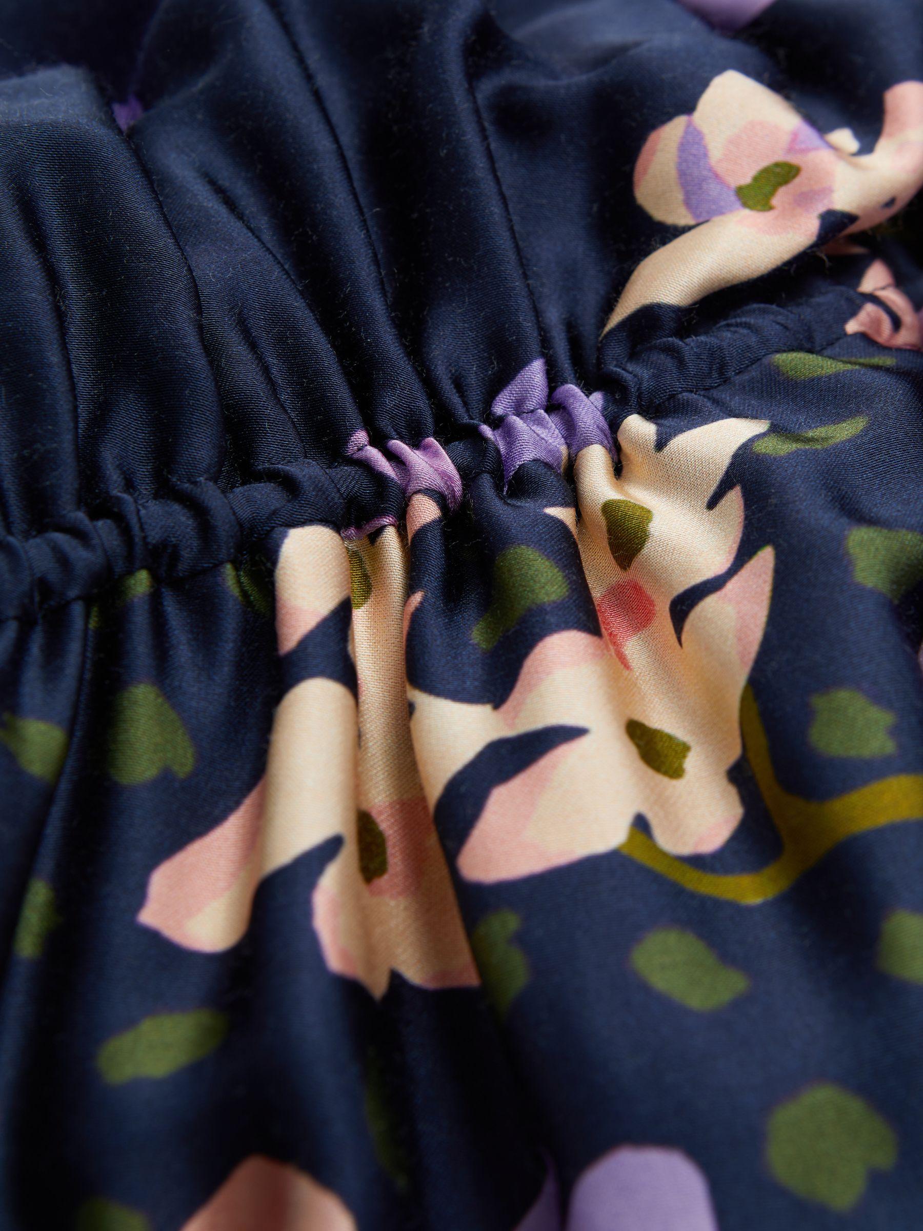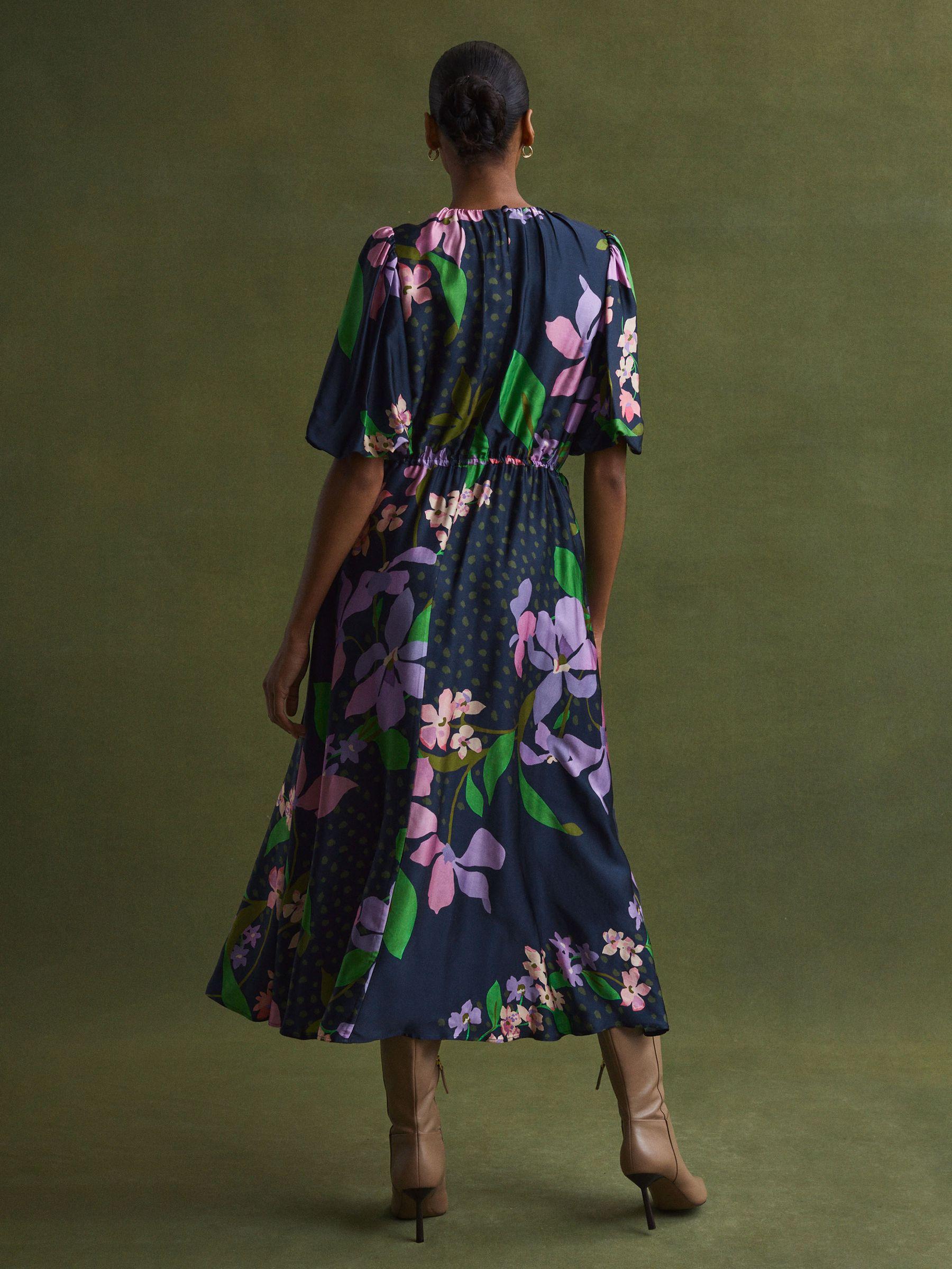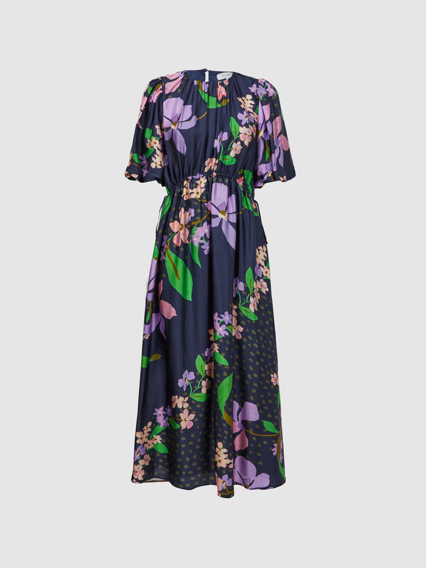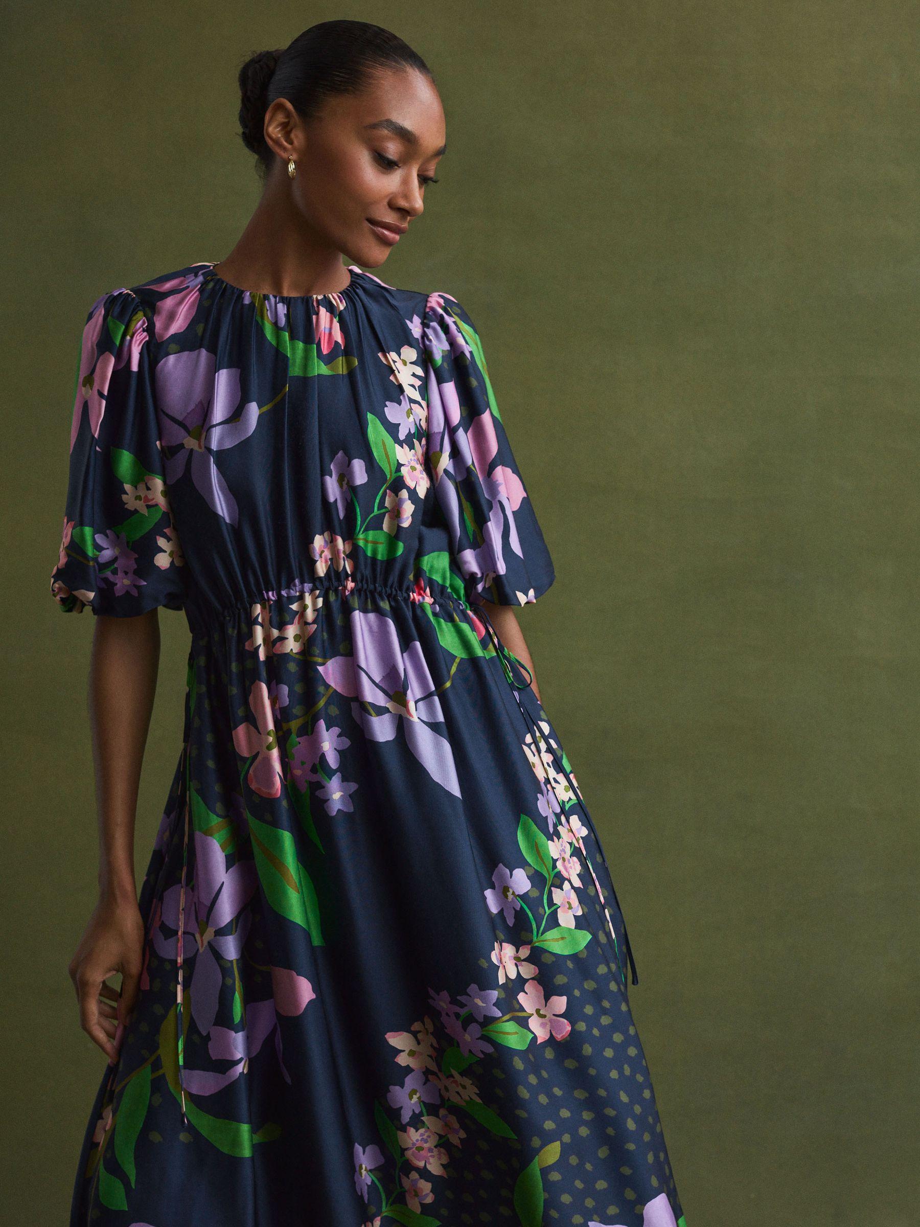 Florere is a new brand for women that celebrates the boldly feminine, creating timeless and eye-catching pieces from vintage archives, then reimagining them in vibrant colourways and fluid fits. Florere’s Flourish print features in this day-to-eve dress, lending it a feminine charm. This mood is enhanced with voluminous puff sleeves and a drawstring waistband, which accentuates the female form. Pockets are added for a functional mood. Florere’s Flourish print, characterised by bold shades and graphic florals, is inspired by Haute Couture icon Gustav Zumsteg and his silk company, Abraham. Gathered, round neckline Drawstring waistband Side-slip pockets Puff sleeves Fit-and-flare silhouette Midi length Lined