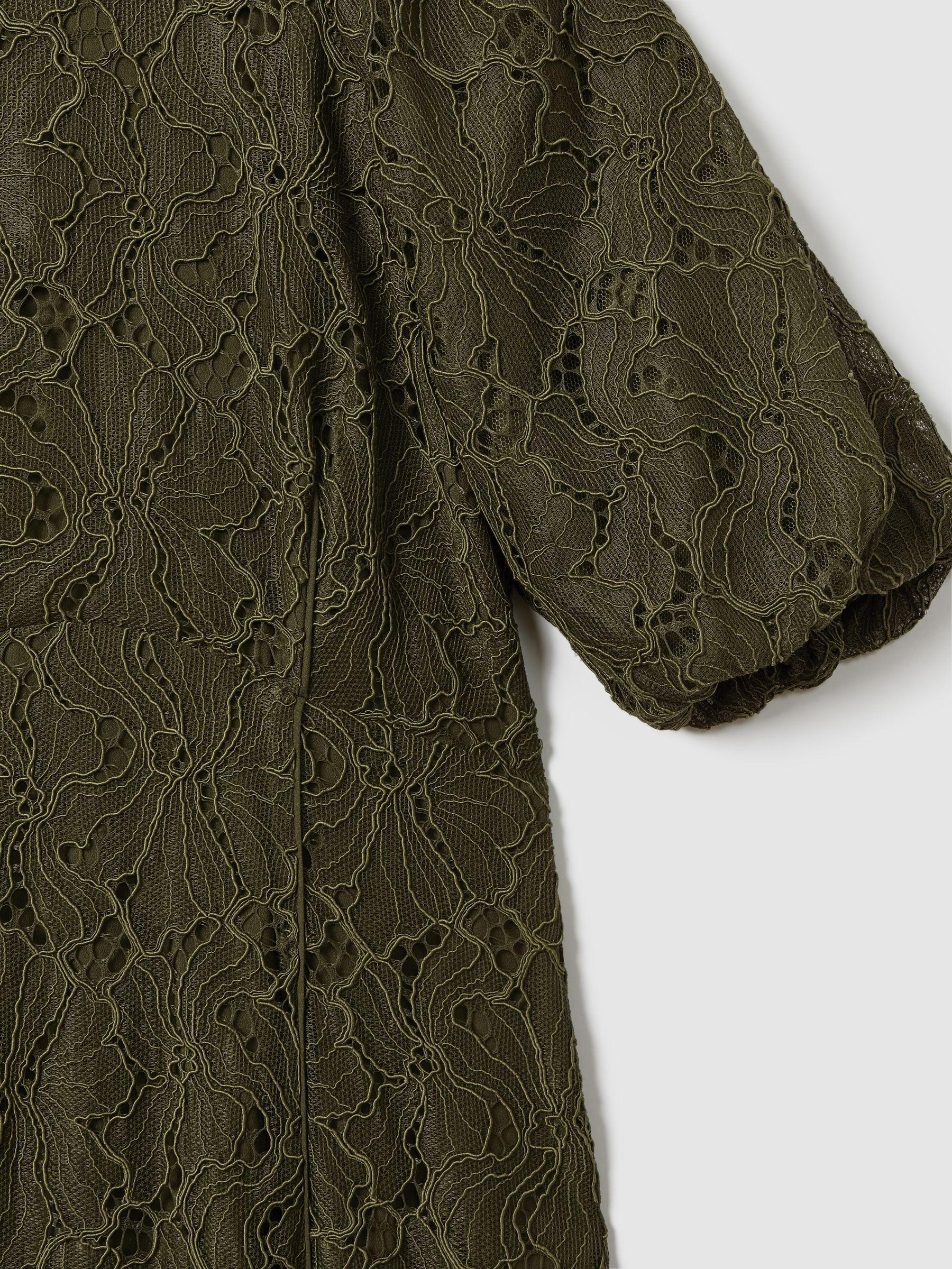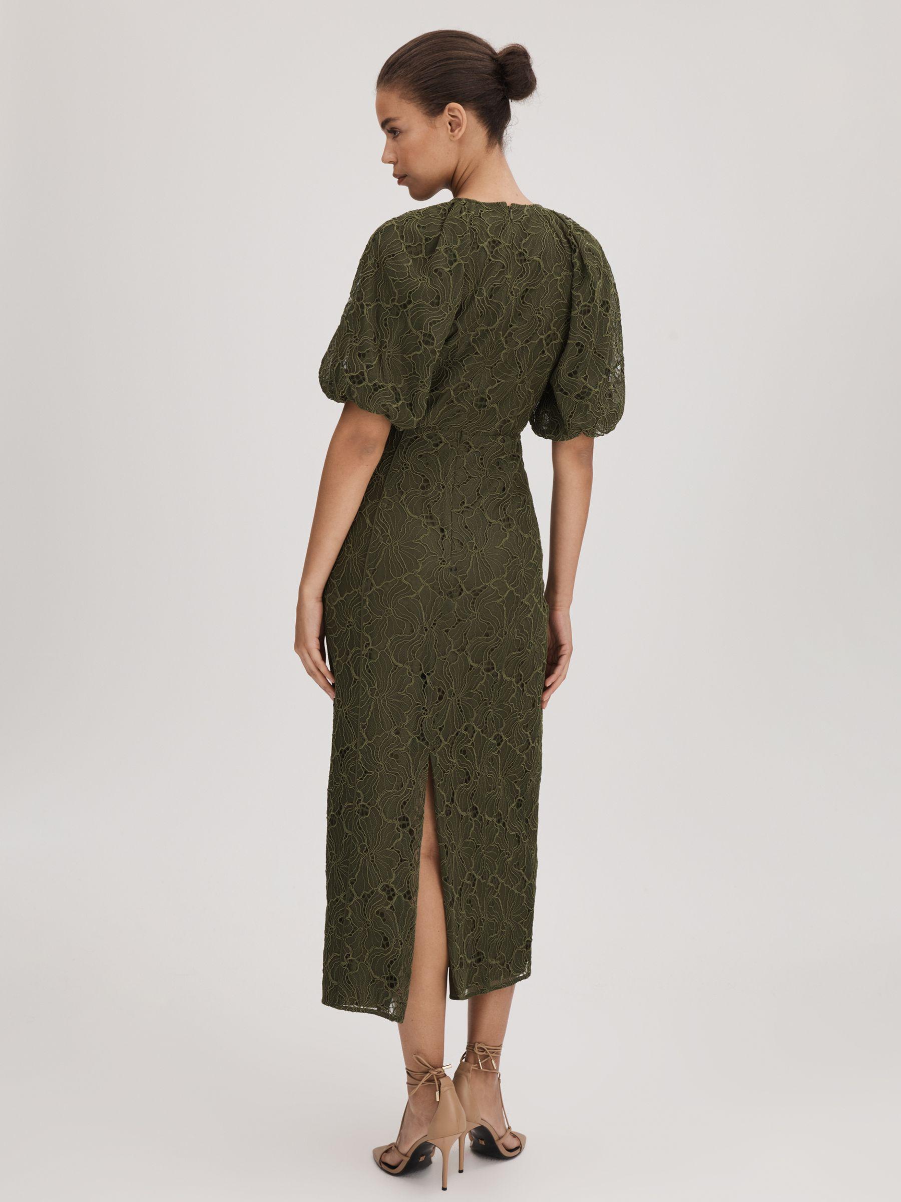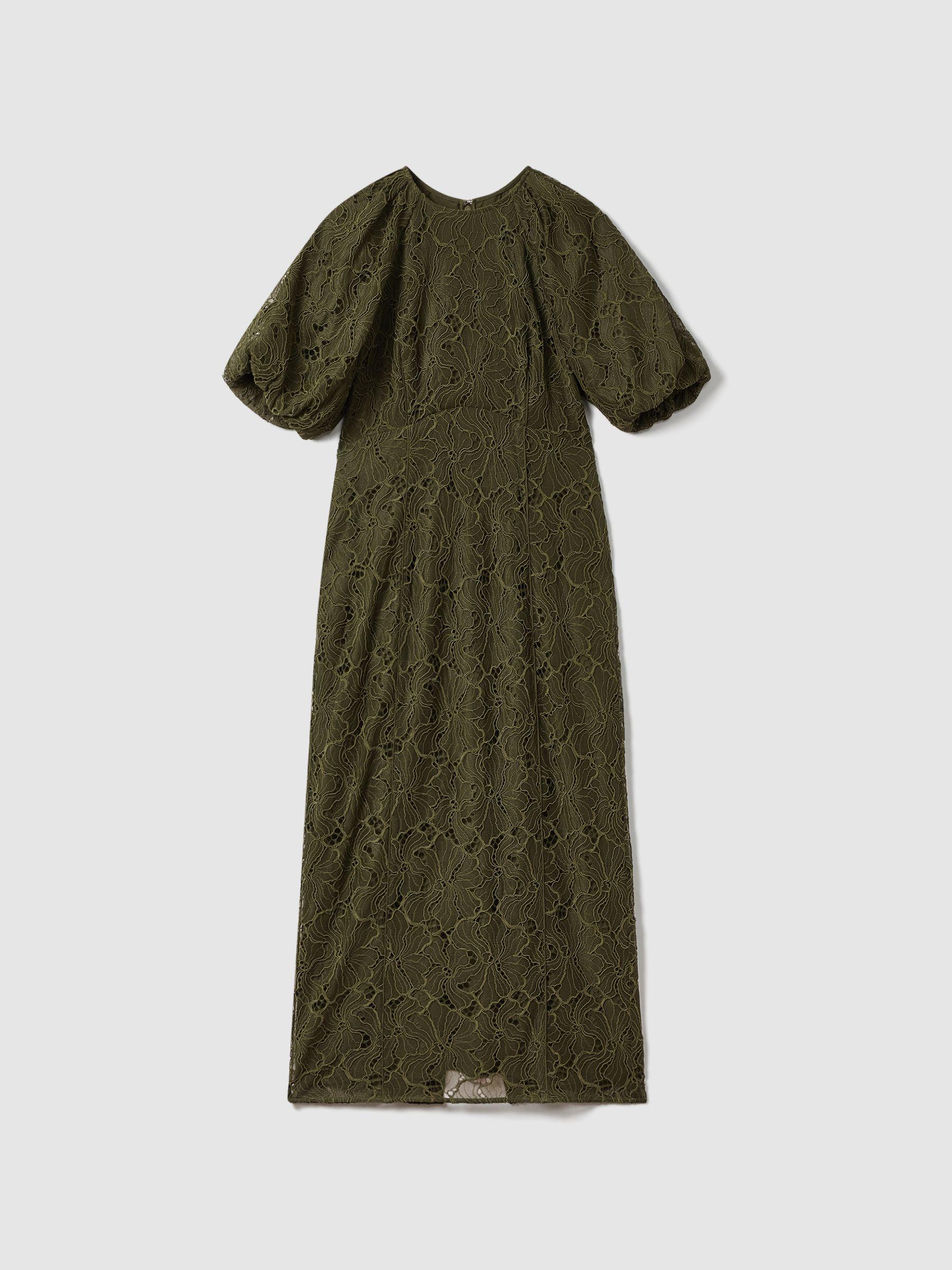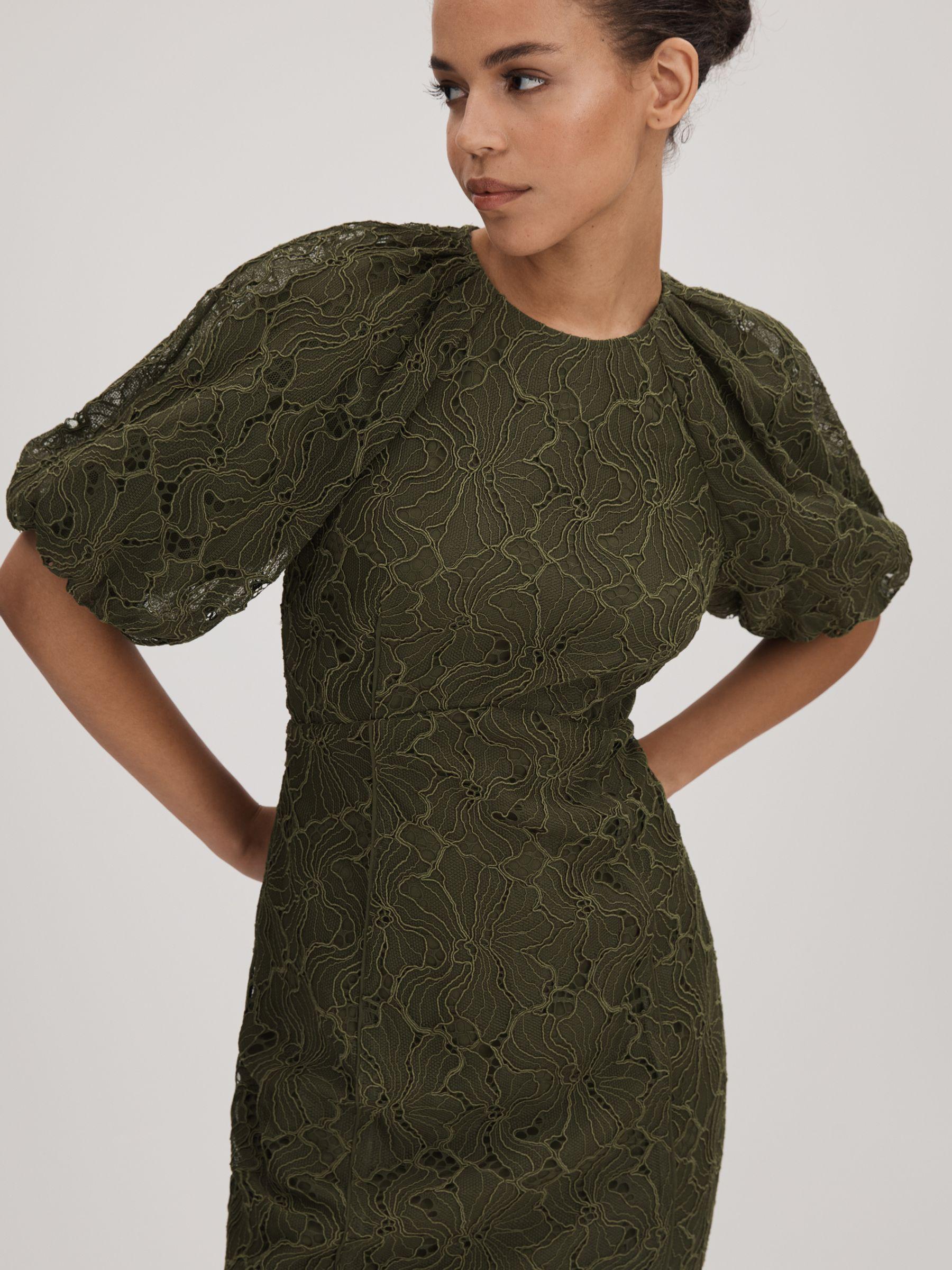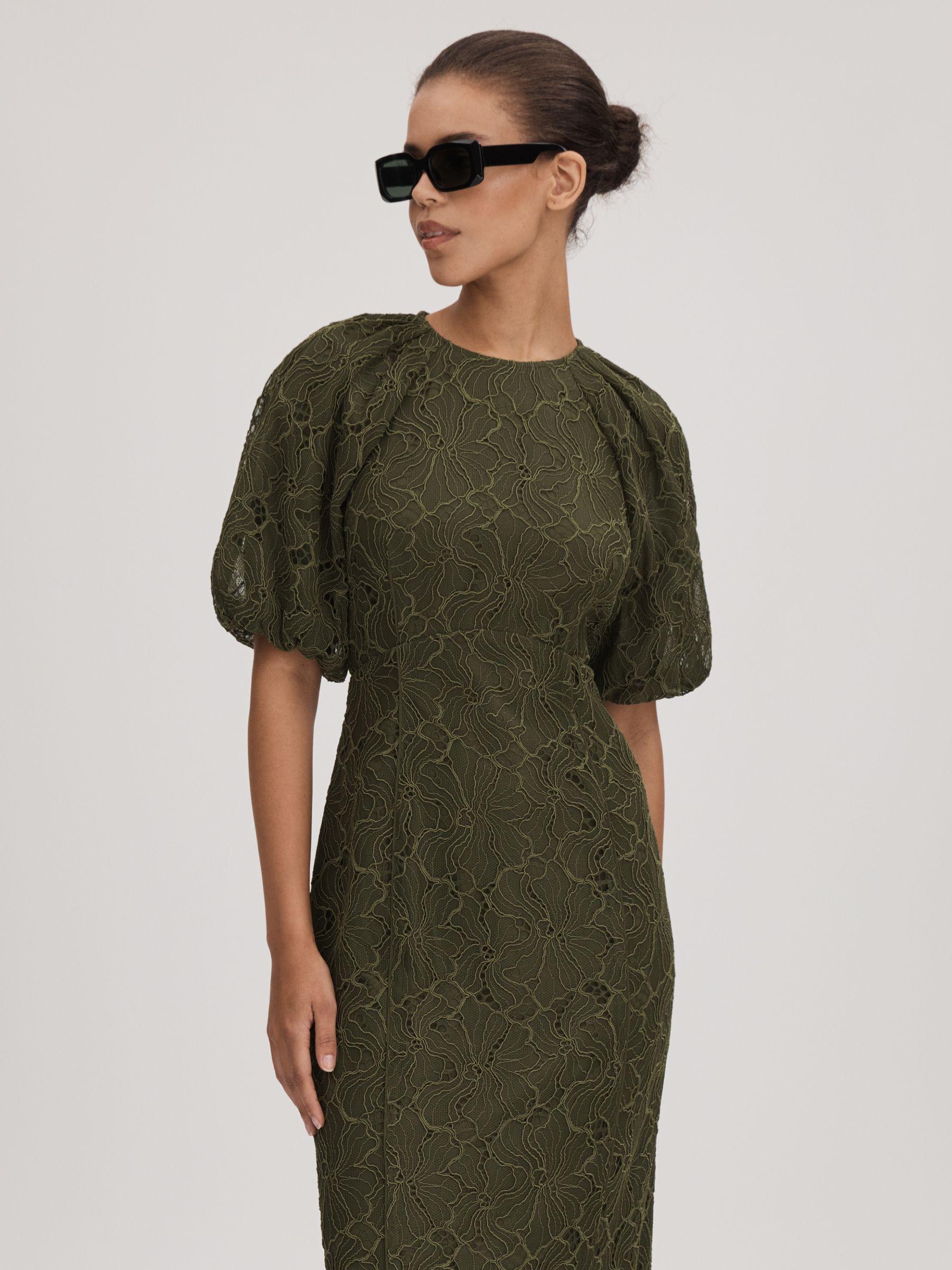 This dark khaki midi dress is cut from a textured lace fabric and lined for comfort. Puff sleeves add volume to this fit-and-flare silhouette. Textured lace fabrication Puff sleeves Fit-and-flare silhouette Split to reverse Zip-closure to reverse Midi dress Lined Florere, curated by Reiss, is a new brand for women that celebrates the boldly feminine, creating timeless and eye-catching pieces from vintage archives, then reimagining them in vibrant colourways and fluid fits.