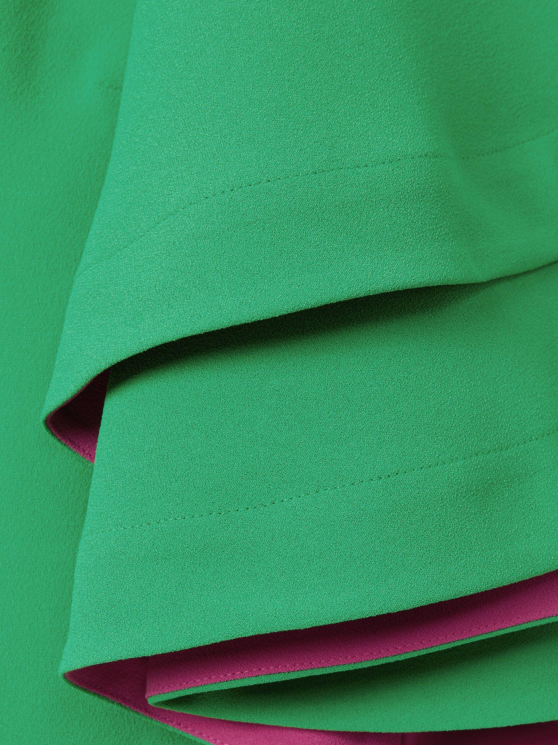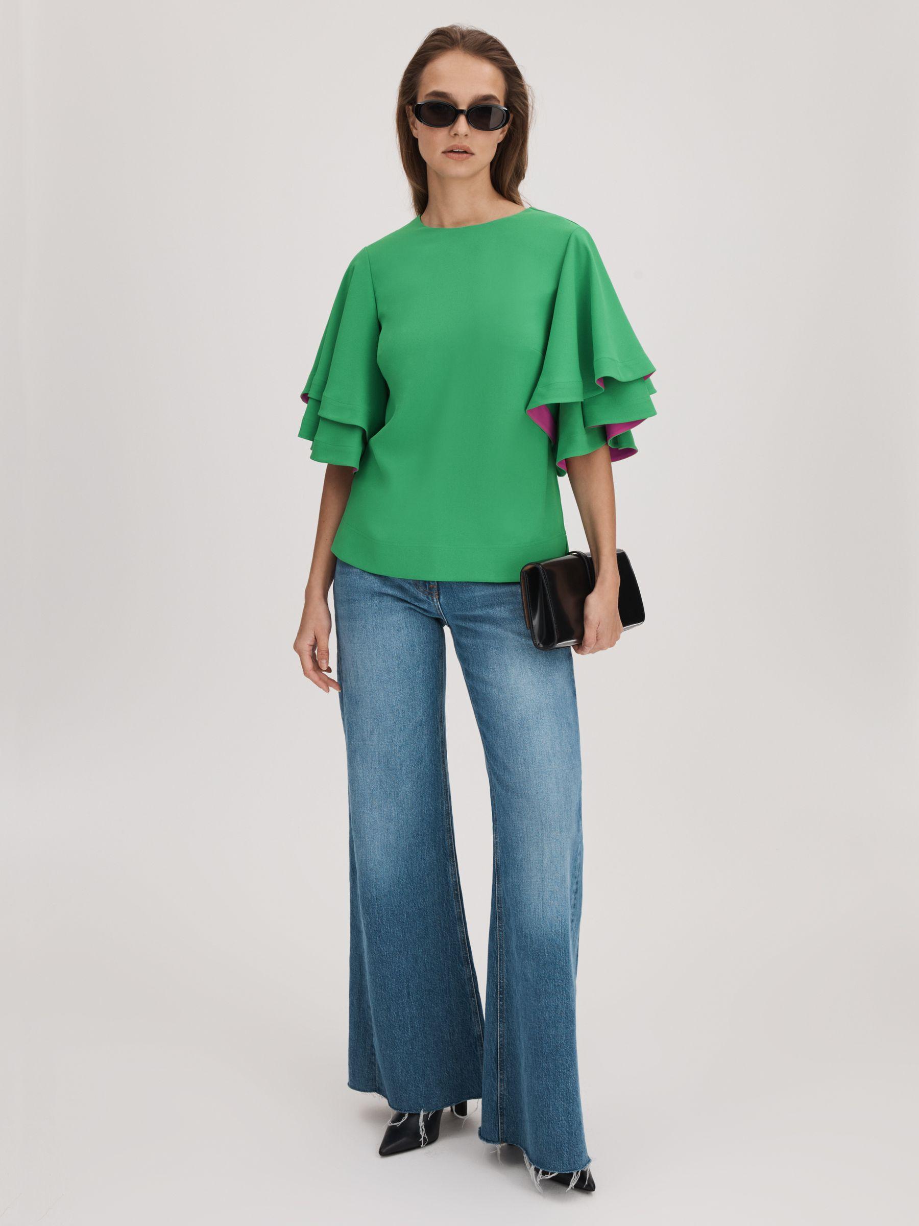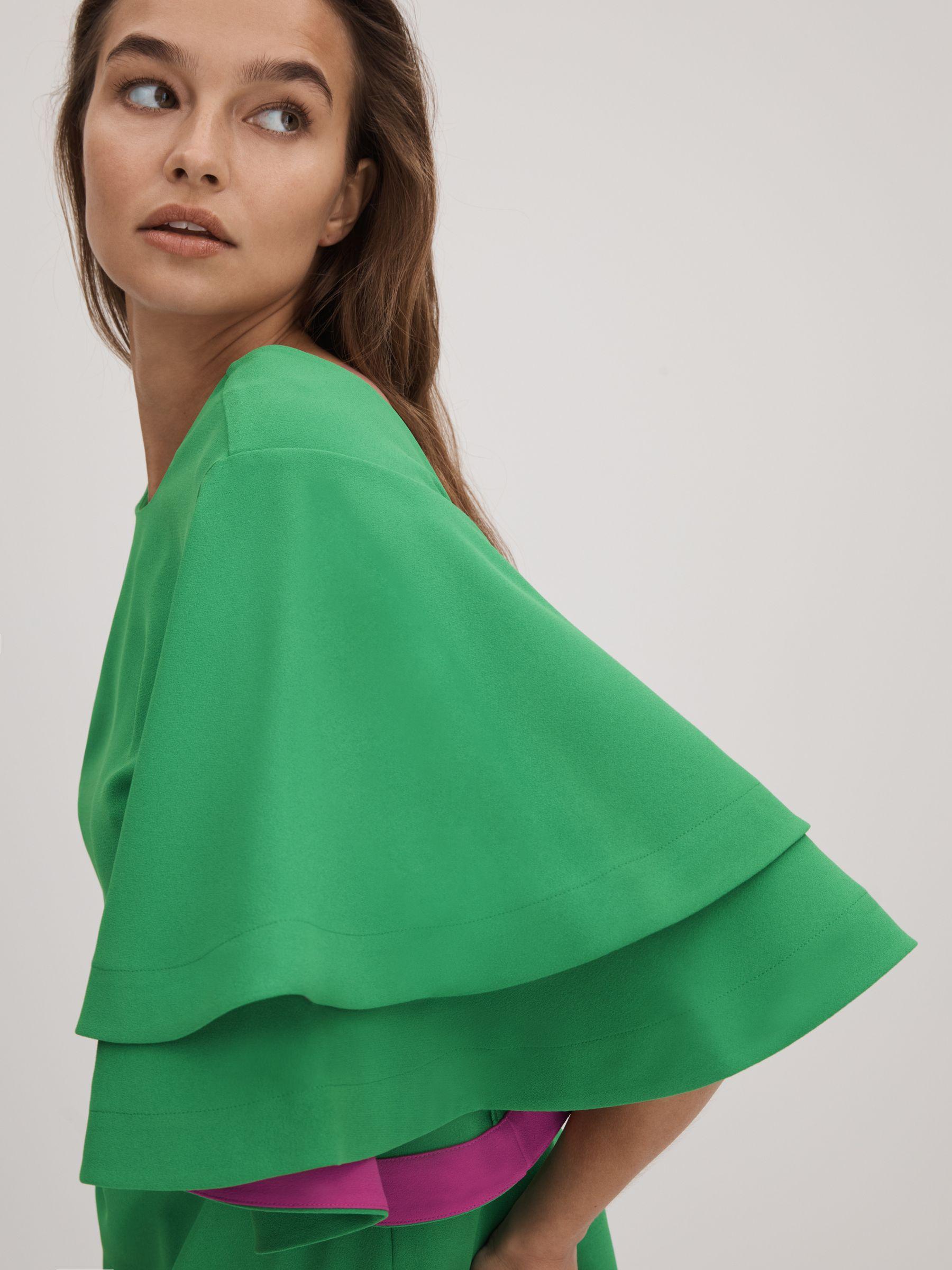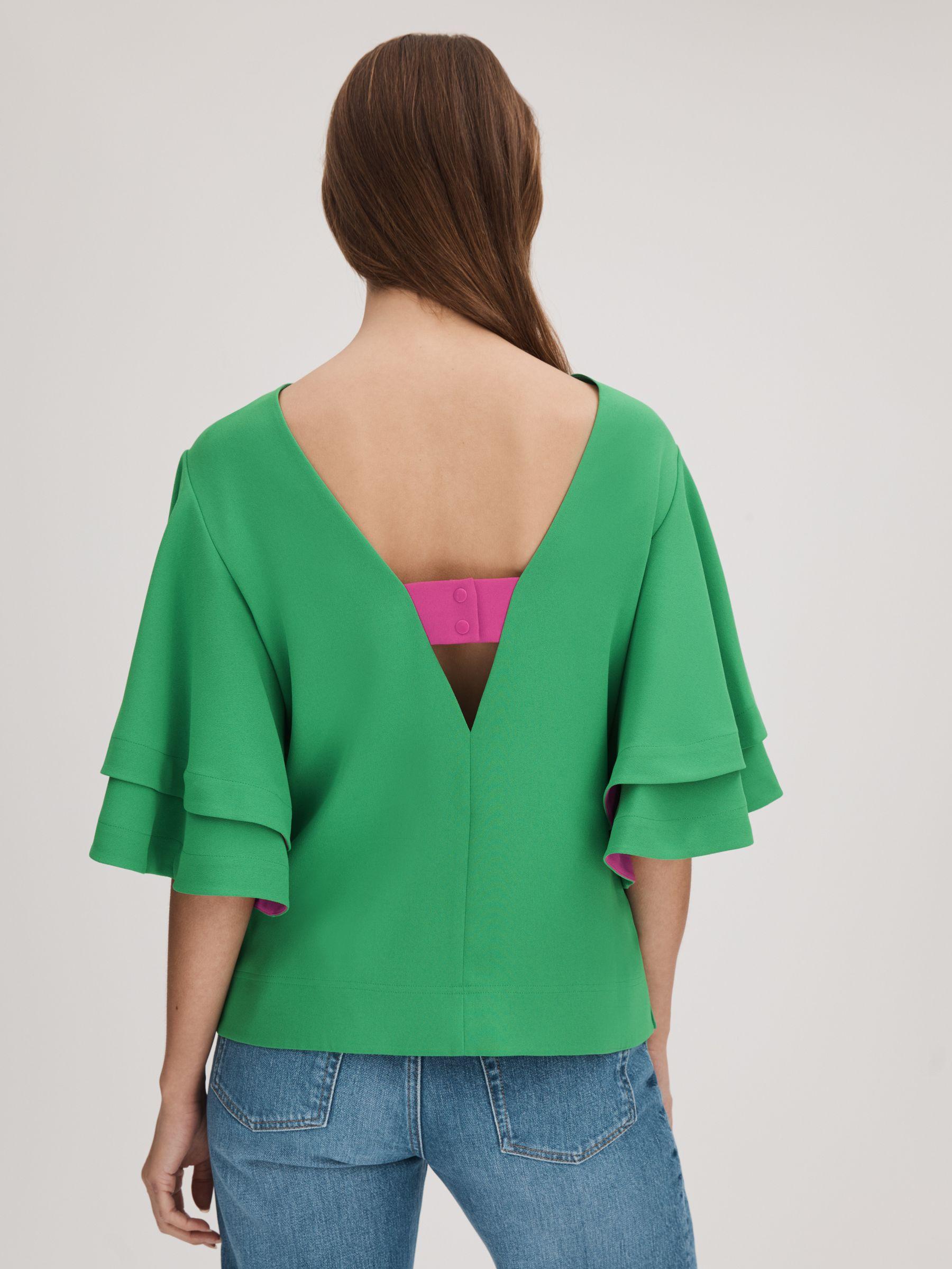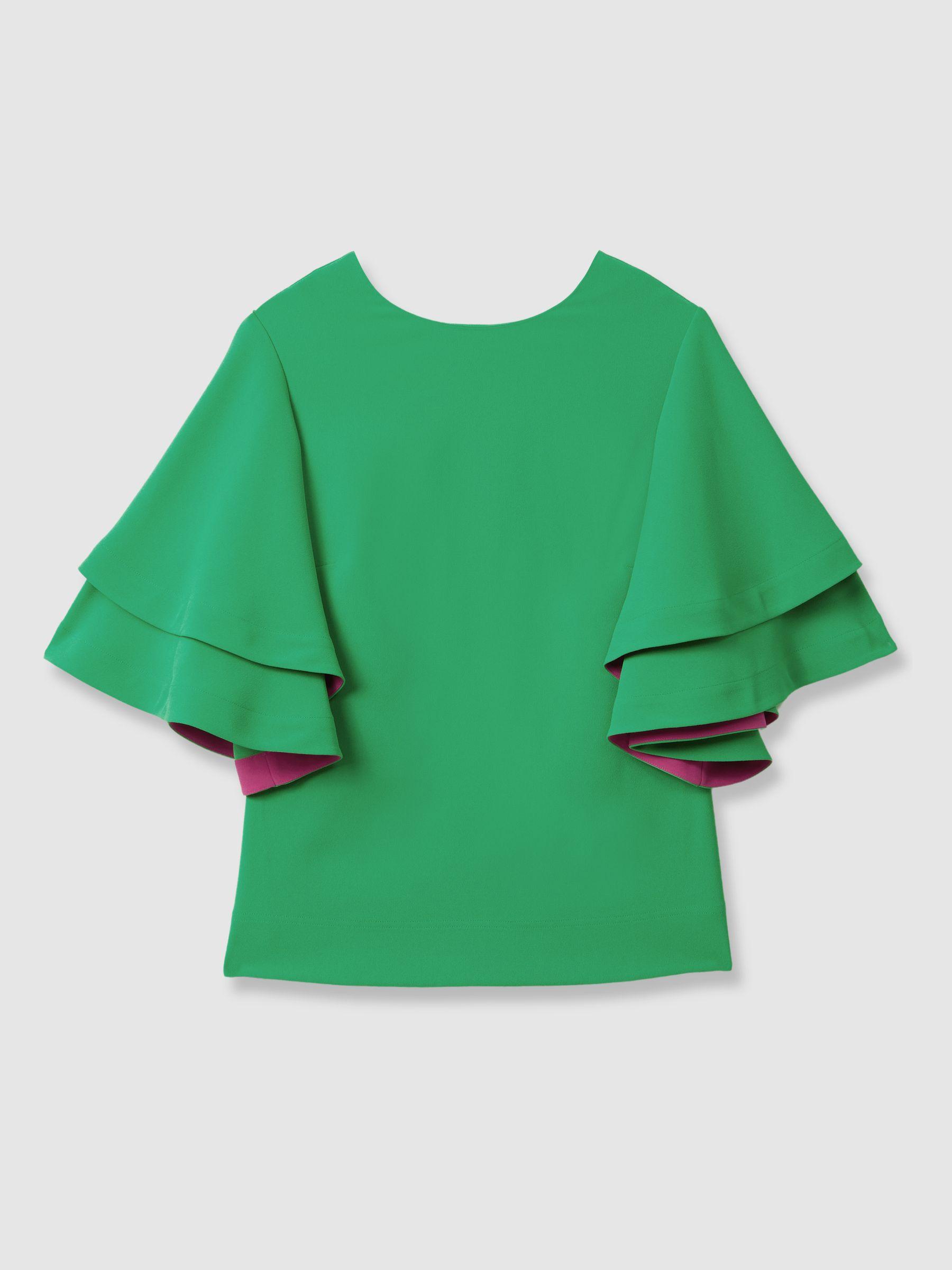 Cut with a crew neckline, this bright green blouse features layered sleeves with bold contrast detailing. It fastens with a contrasting press-stud panel to the reverse. Layered sleeves Contrast detailing Press-stud panel to reverse Florere, curated by Reiss, is a new brand for women that celebrates the boldly feminine, creating timeless and eye-catching pieces from vintage archives, then reimagining them in vibrant colourways and fluid fits.