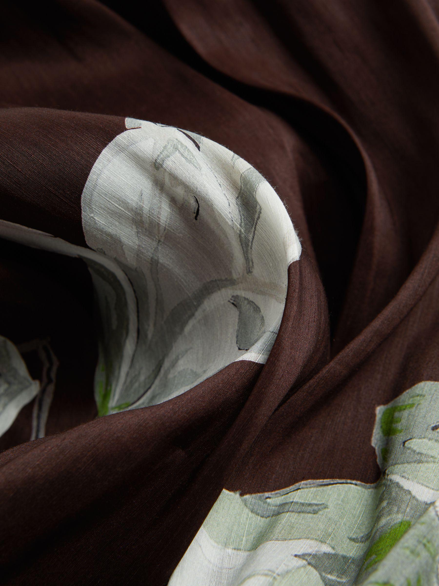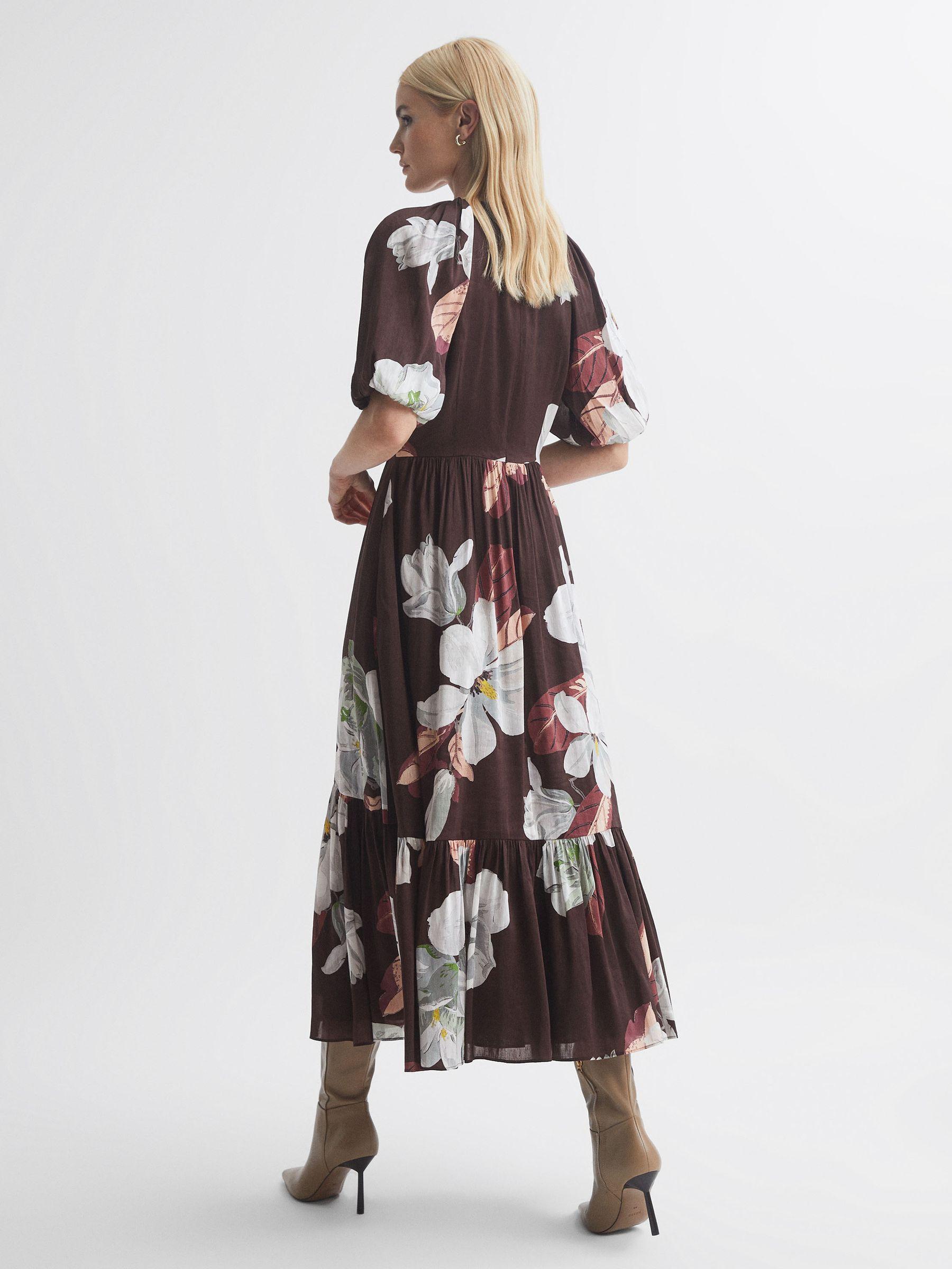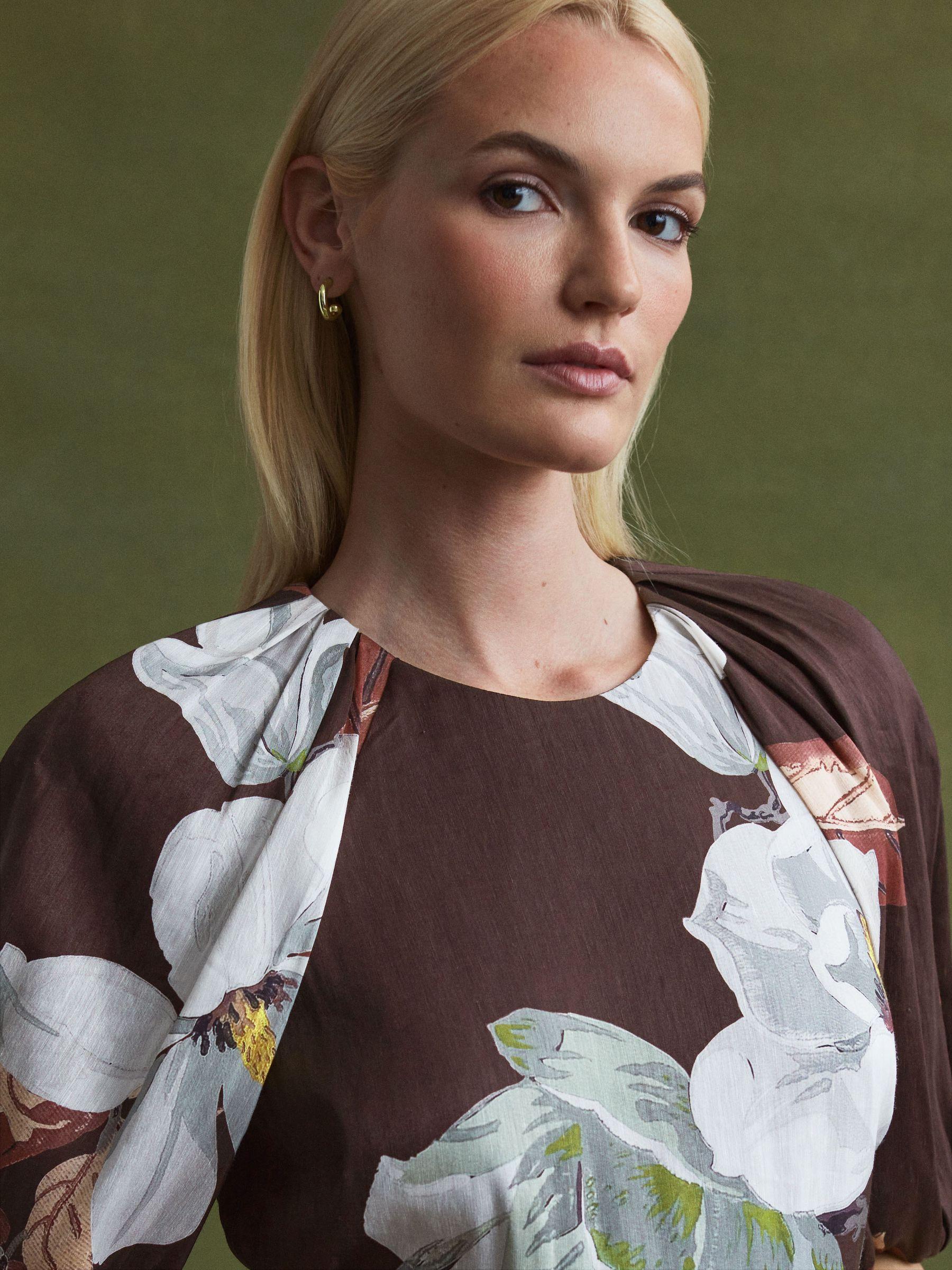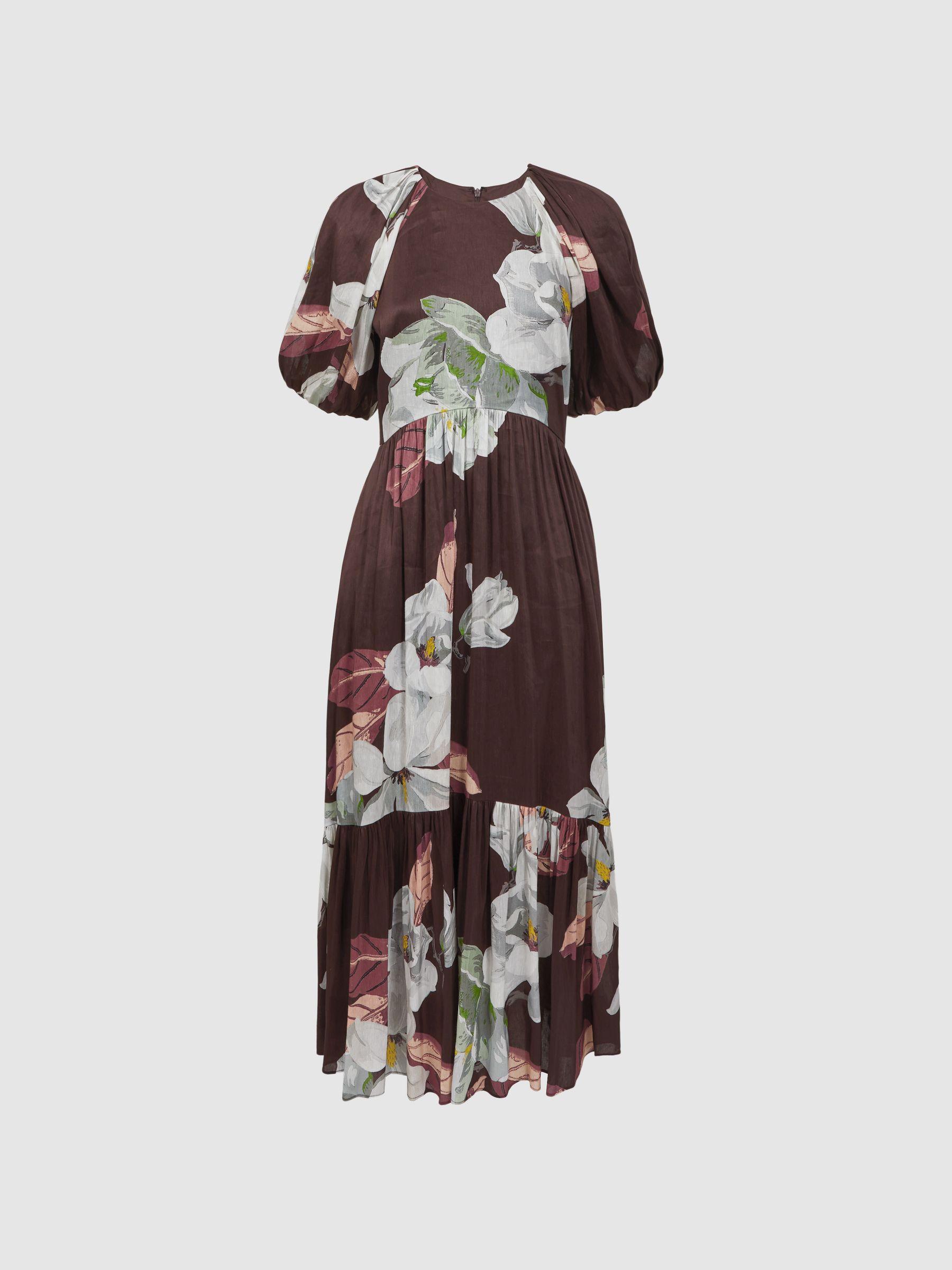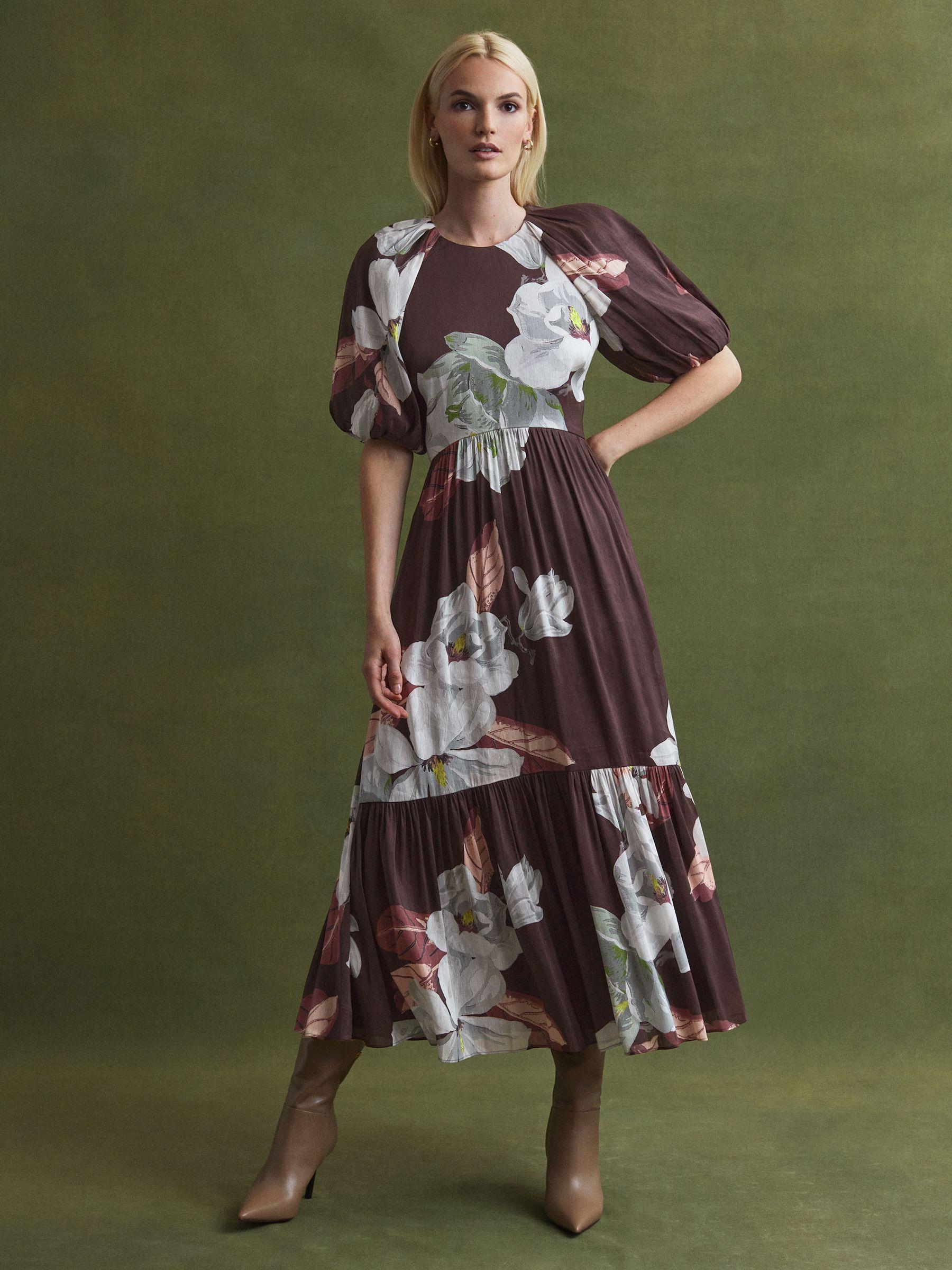 Florere is a new brand for women that celebrates the boldly feminine, creating timeless and eye-catching pieces from vintage archives, and then reimagining them in vibrant colourways and fluid fits. This chocolate midi dress is crafted from a premium blend of linen and silk for unmatched comfort, and it’s designed in Florere’s signature Oriental Bloom print. Short puff sleeves are met with a classic fit-and-flare silhouette, curating a dramatic shape. Florere’s Oriental Bloom print was inspired by vintage wallpaper, rich in heritage appeal. Linen-silk blend. Round neckline. Short puff sleeves. Fit-and-flare silhouette. Zip closure to reverse. Midi length. Lined.