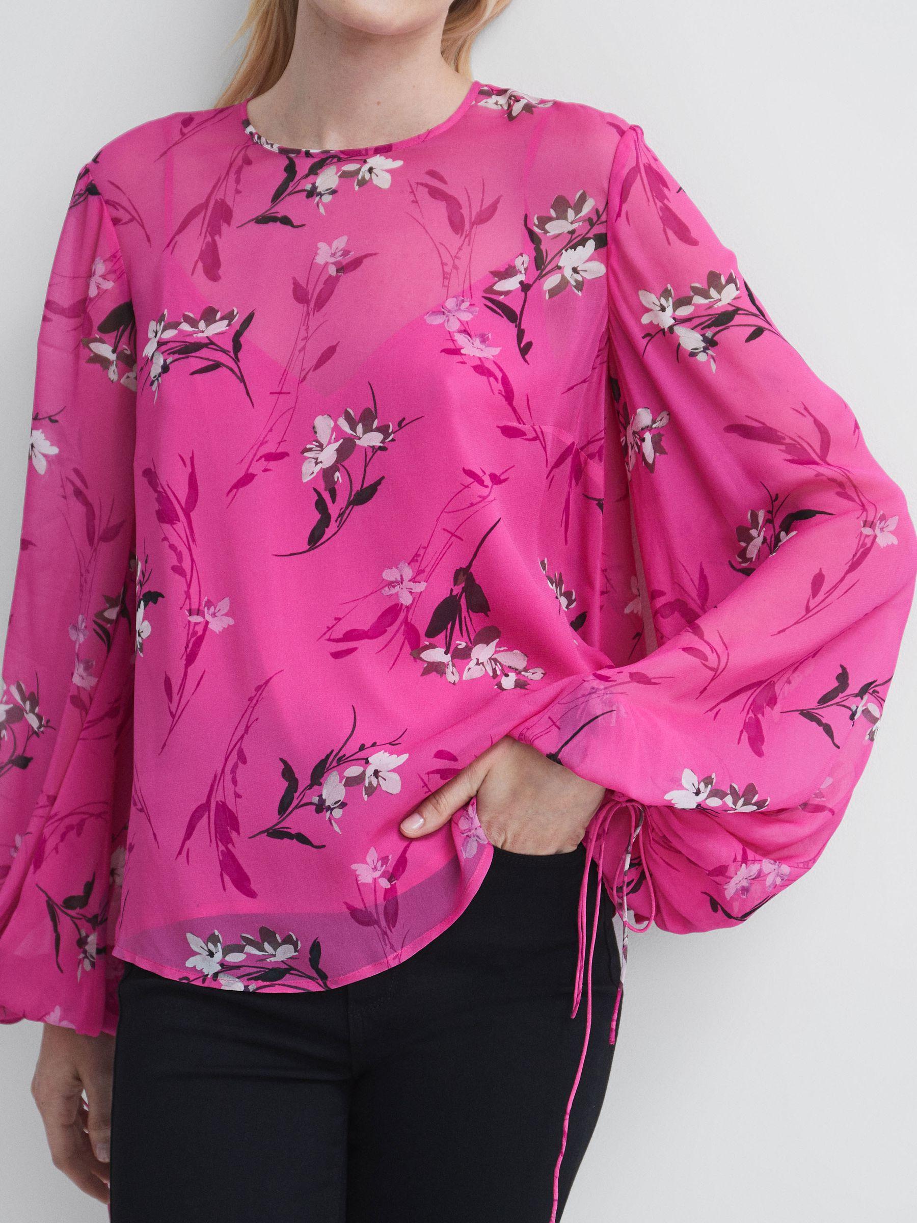 Florere is a new brand for women that celebrates the boldly feminine, creating timeless and eye-catching pieces from vintage archives, and then reimagining them in vibrant colourways and fluid fits. This sheer, bright pink top is a feminine pick, rendered here in Florere’s signature Nocturnal Garden print. It’s cut with a crew neckline which secures behind the neck and it’s fitted with a removable V-neck undervest. Blouson sleeves are added and finished with tied cuffs. Florere’s Nocturnal Garden print takes inspiration from the works of Giorgio Taroni, a prestigious textile designer in the late 20th century who widely experimented with intricate floral patterns. Sheer fabrication Removable V-neck undervest Crew neckline. Self-tie fastening to neck. Keyhole opening to reverse. Long, blouson sleeves. Tie detail to cuffs.