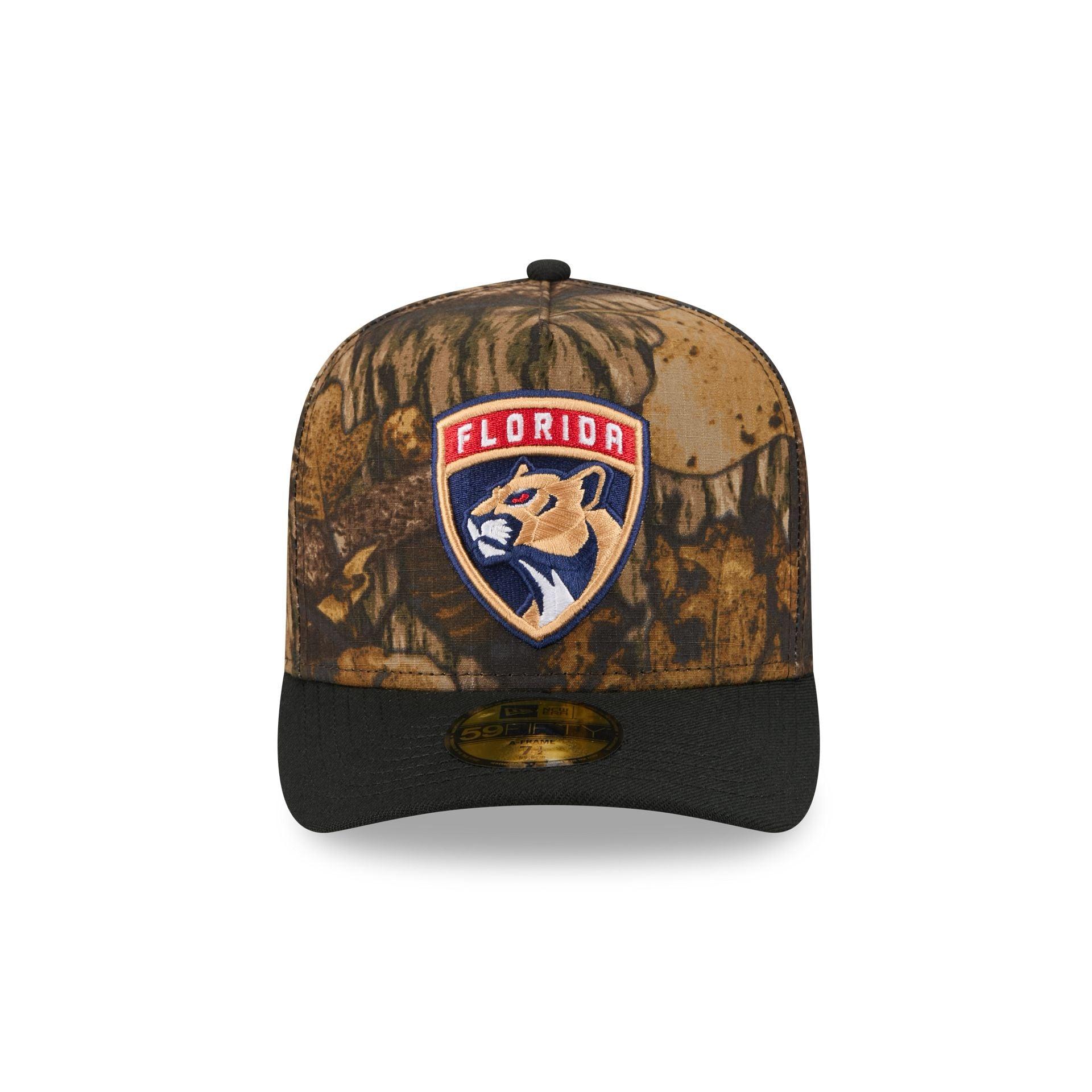 The Florida Panthers Ripstop Camo 59FIFTY A-Frame Fitted Cap features an embroidered Panthers logo at the front panels against a specialty Japanese milled ripstop camo fabrication from Three Looms Japan Fabrics throughout the cap. Additional details include an NHL Shield logo at the rear and a gray undervisor.