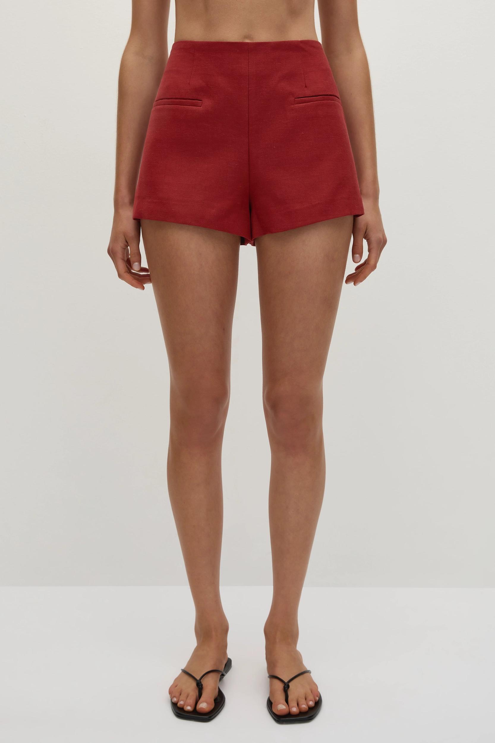A mid-rise mini short, designed from an ultra soft blend of viscose, rayon and a signature 100% European Flax® linen fabrication in a deep shade of red. Smooth through the front and soft tailored, they are a straight yet slightly relaxed silhouette with single welt pockets. Style with the Florine Blazer for a seasonal approach to suiting.This style is true to size. There is no elastic woven into the fabric so it does not offer any additional stretch.