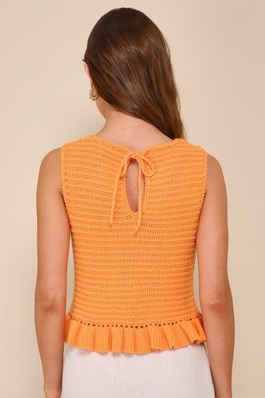 Every sunny day is a perfect reason to romp around in the Lulus Flouncin' Around Orange Cropped Ruffled Sweater Tank! Cotton-blend sweater knit shapes a high rounded neckline, a sleeveless bodice with pierced pointelle accents, and a boxy silhouette that falls to a cropped hem with a flouncy ruffled trim. Keyhole cutout at back secures with a tying detail.