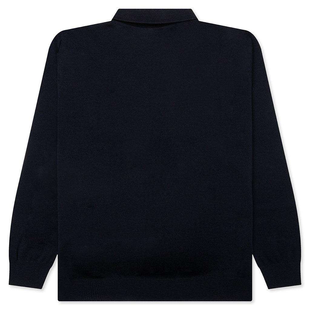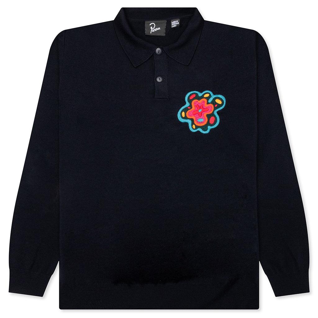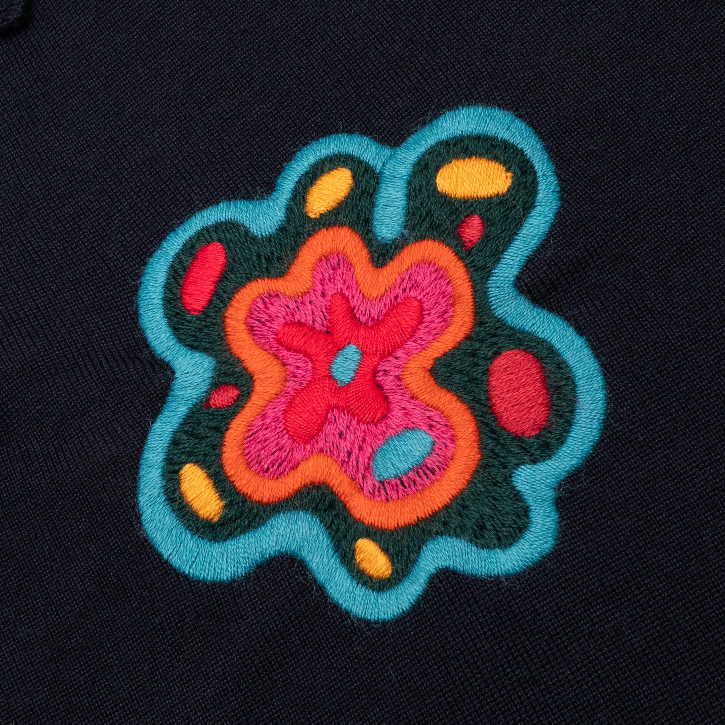 he Flower Blob Knitted Polo Shirt in Midnight Blue is made from Merino wool for a soft, luxurious feel. It features embroidery at the chest and a half placket with two tonal buttons. The ribbed collar, cuffs, and hem enhance its classic design, while the regular fit ensures comfort and style. 100% Merino wool Gauge 14 Embroidery at chest Half placket with two tonal buttons Ribbed collar, cuff and hem Regular fit Style No: 52226