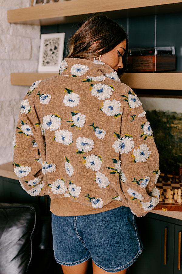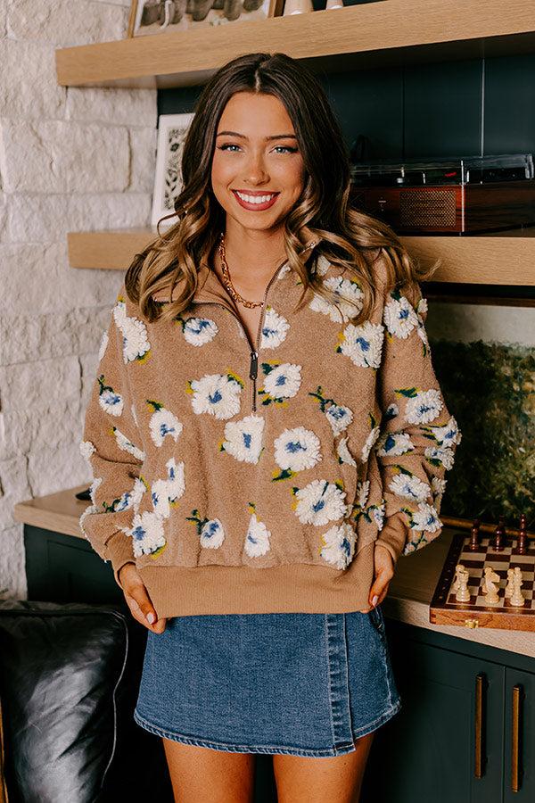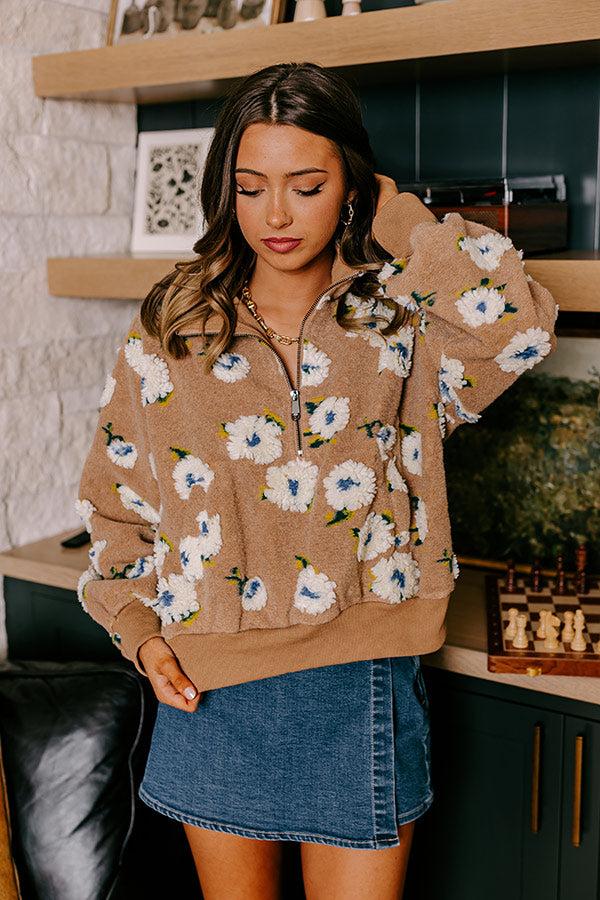 - This darling pullover is sure to keep you cozy! From morning strolls to everyday errands, this adorable piece will become your new go-to for keeping the chill out. - Unlined material with yellow, blue, green, and ivory hued floral sherpa pattern - A collared v-cut neckline that zips down into a half zipped bodice - Long, loose sleeves with ribbed cuffs - A functional kangaroo pocket on the front - A relaxed silhouette that ends in a ribbed waistband