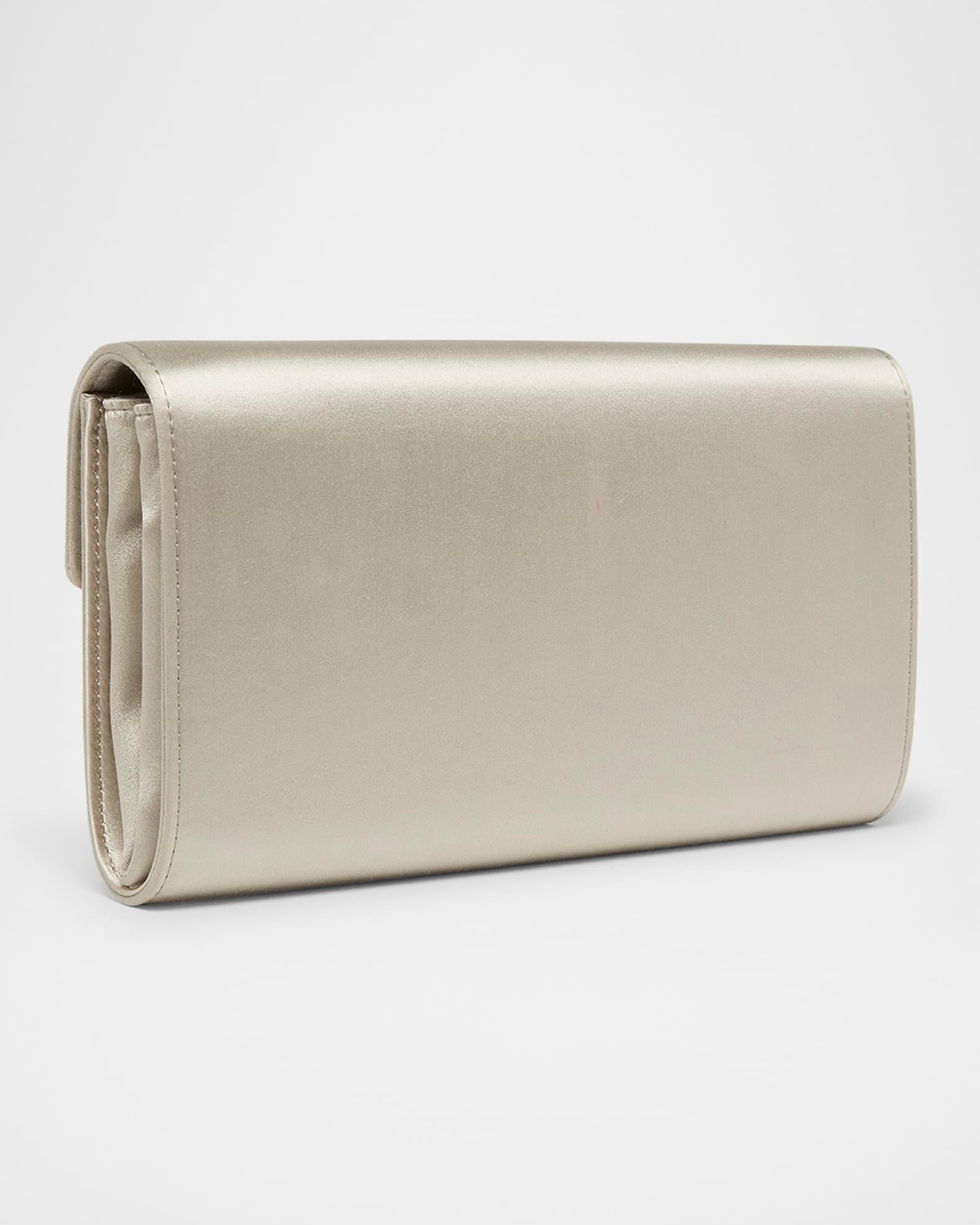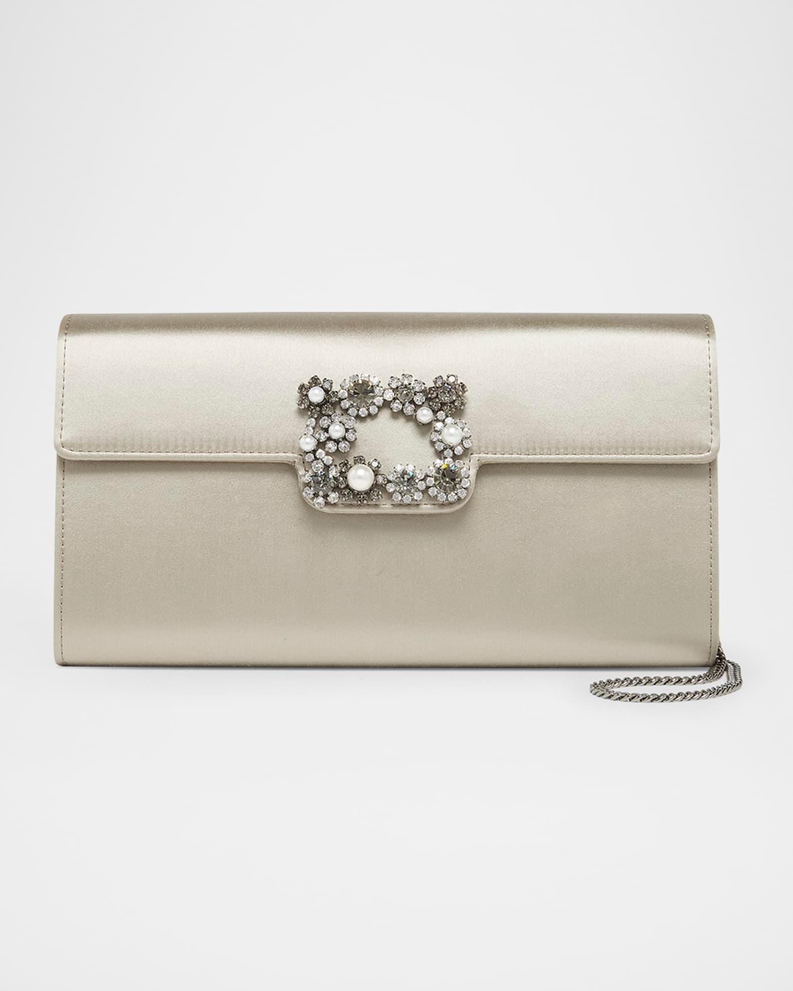Roger Vivier envelope flap bag in silk satin features a crystal and pearlescent bead buckle embellishment Chain shoulder strap Flap top with magnetic closure Divided interior, one card slot Lining: Viscose Approx. 5.1"H x 9.4"W x 1.3"D Made in Italy