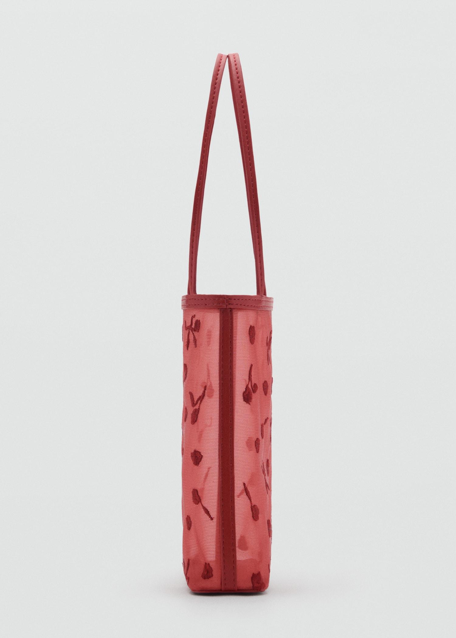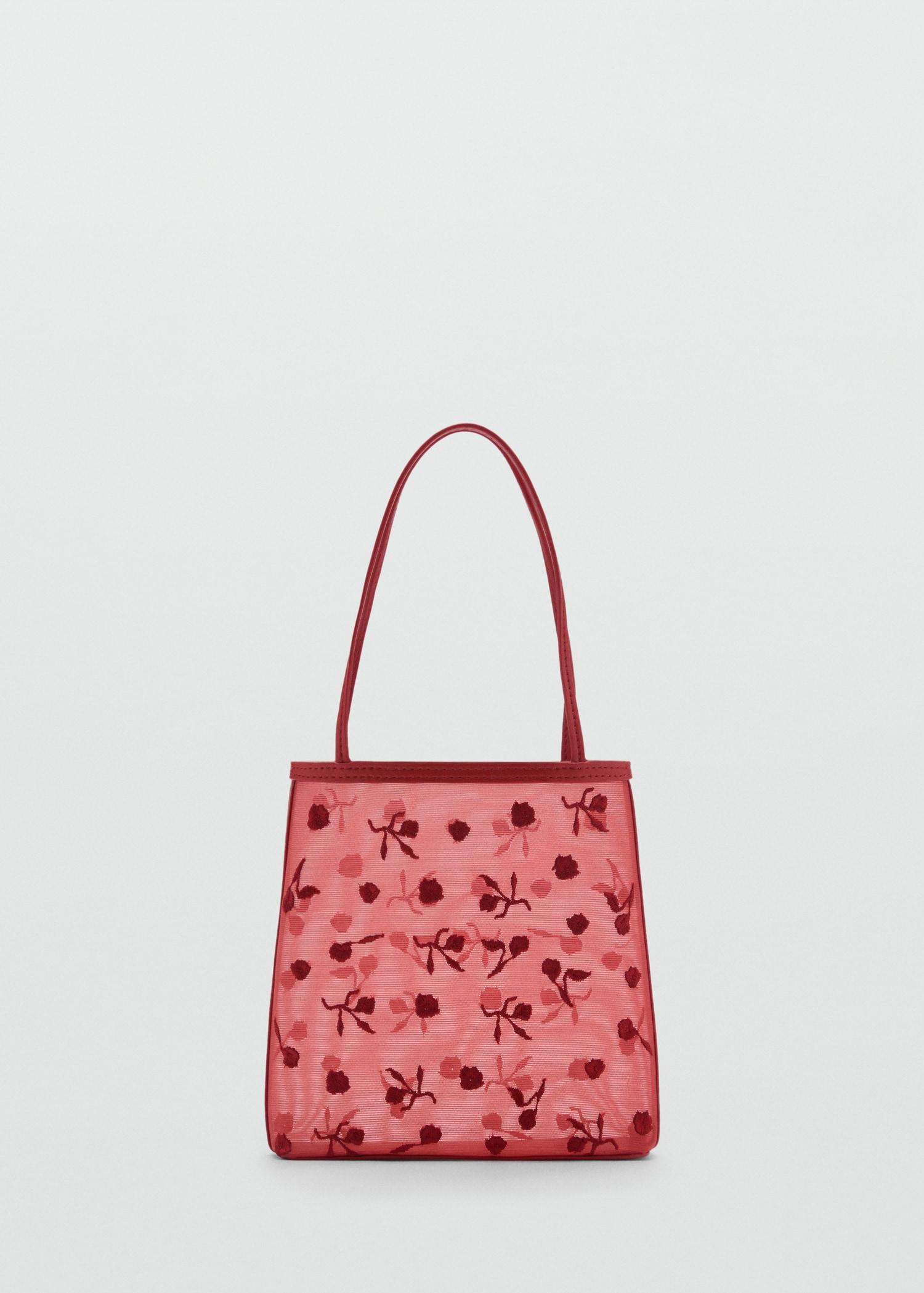 Mesh fabric. Sheer fabric. Floral embroidery. Double handle. Shoulder strap. Unlined. 7.48x7.87x1.97 in (Length x Height x Width)
