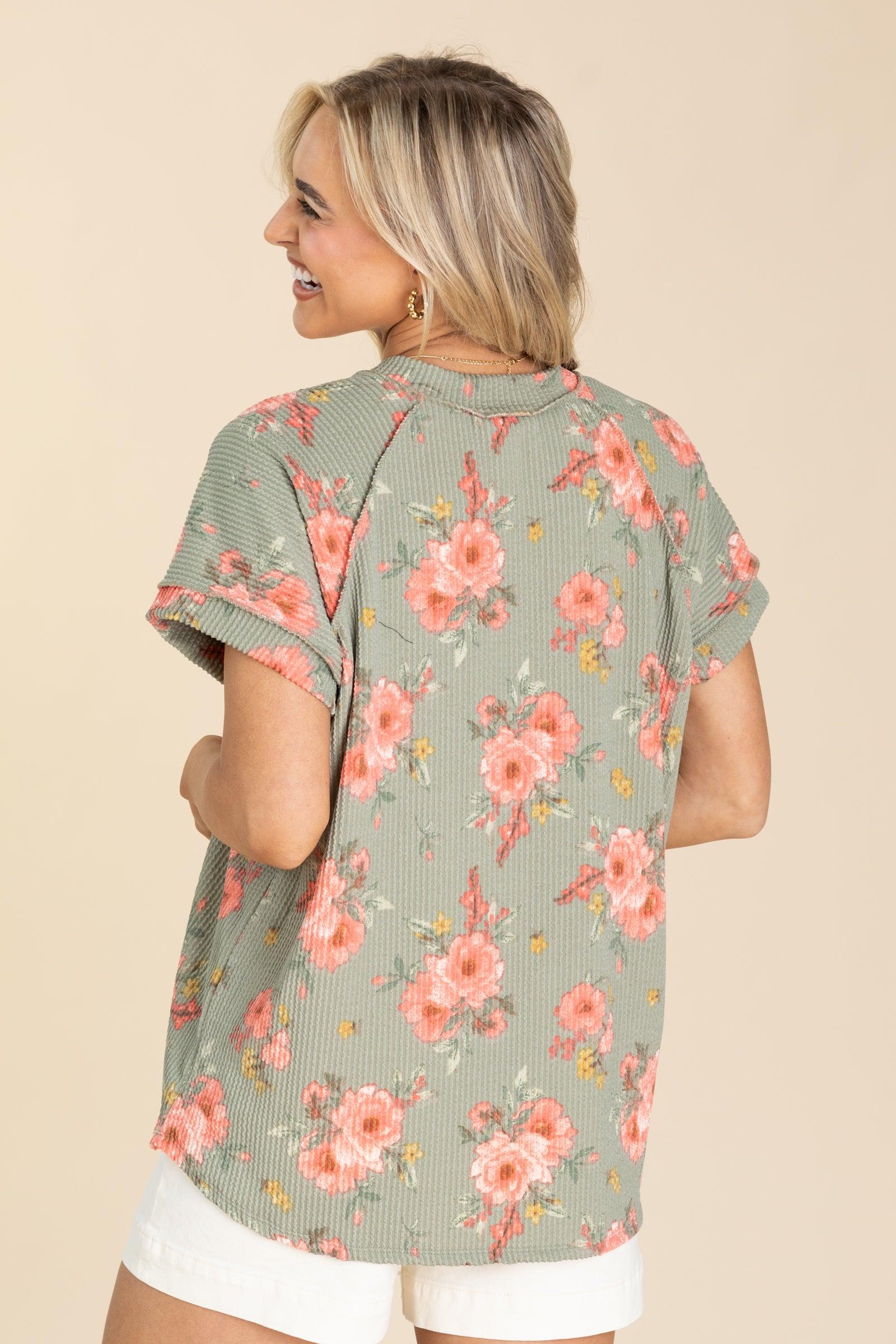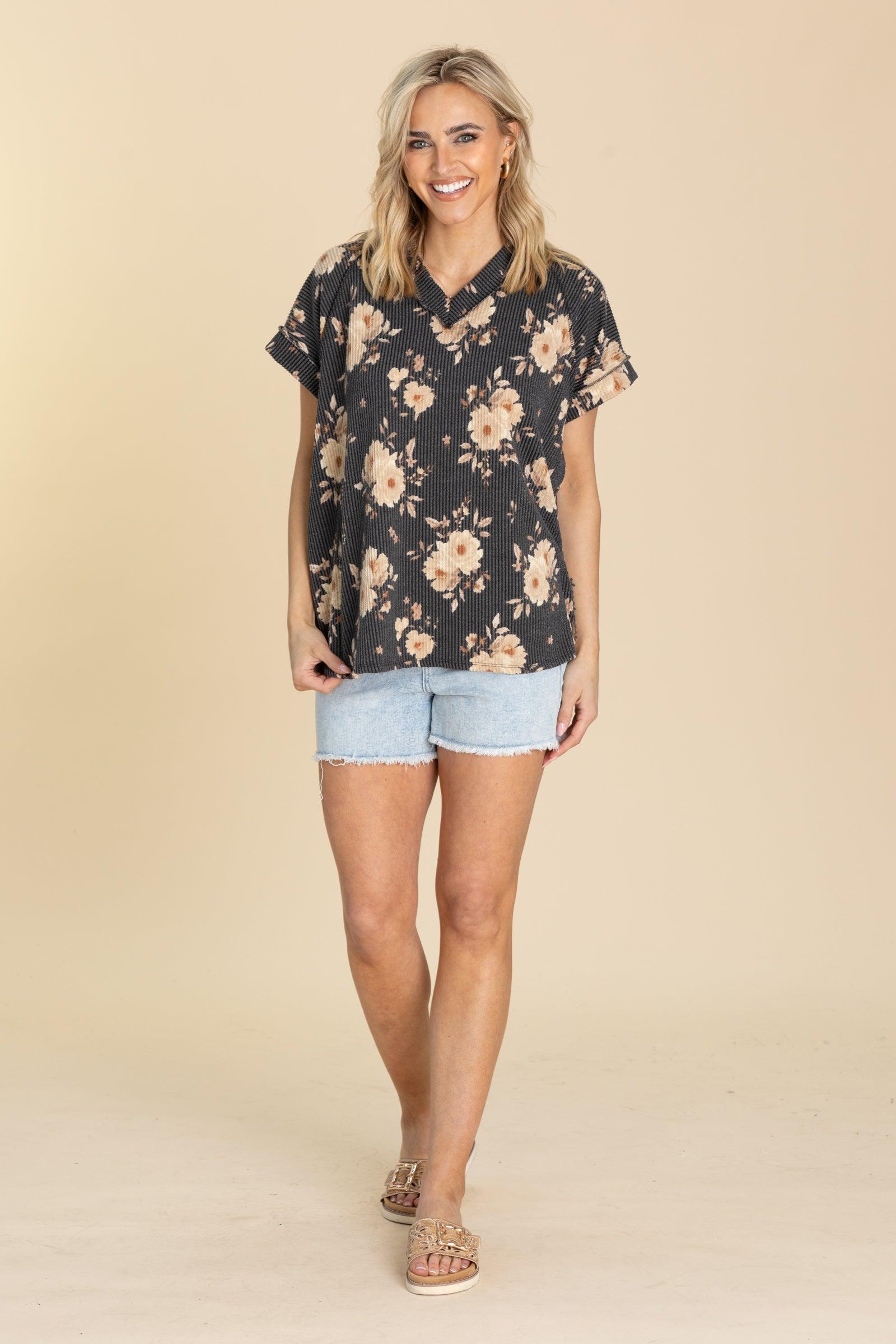 Product Details Colors: Sage, Coral, Dark Mustard, Off White/ Charcoal, Tan, Brown, Orange Print: Floral Neckline: V-Neck Sleeve: Short Sleeve Hemline: Straight Brand: Heimish Material and Care 95% Polyester 5% Spandex Hand Wash Cold Hang/Line Dry Size and Fit Small: Bust 46" Waist 46" Length 28" Medium: Bust 48" Waist 48" Length 28.5" Large: Bust 50" Waist 50" Length 29" 1X Large: Bust 52" Waist 52" Length 29.5" 2X Large: Bust 54" Waist 54" Length 30" 3X Large: Bust 56" Waist 56" Length 30.5" Model is 5’8” and wearing her true size small