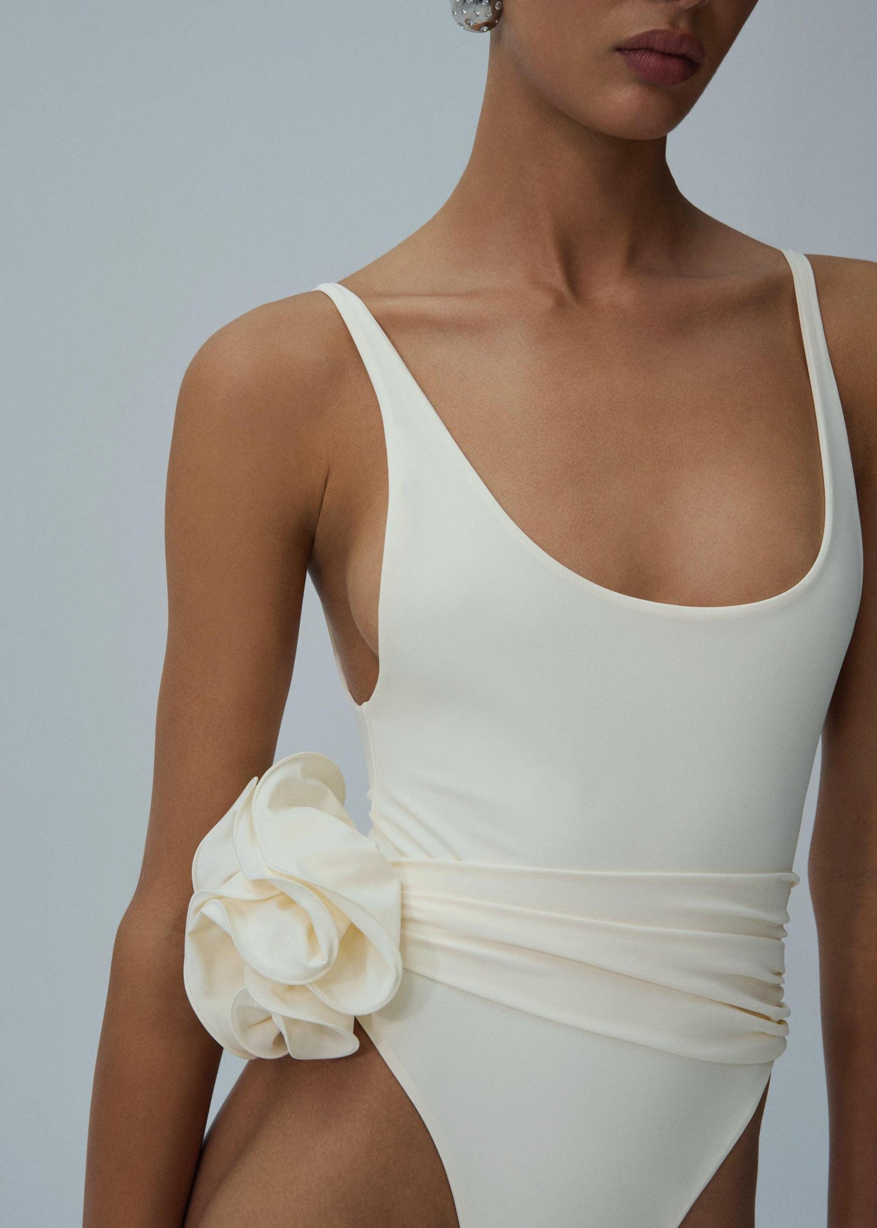 Flower scoop neck swimsuit in cream