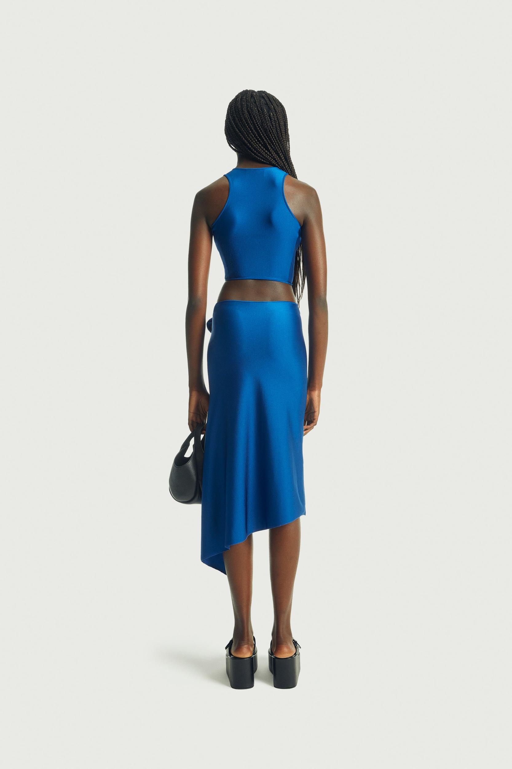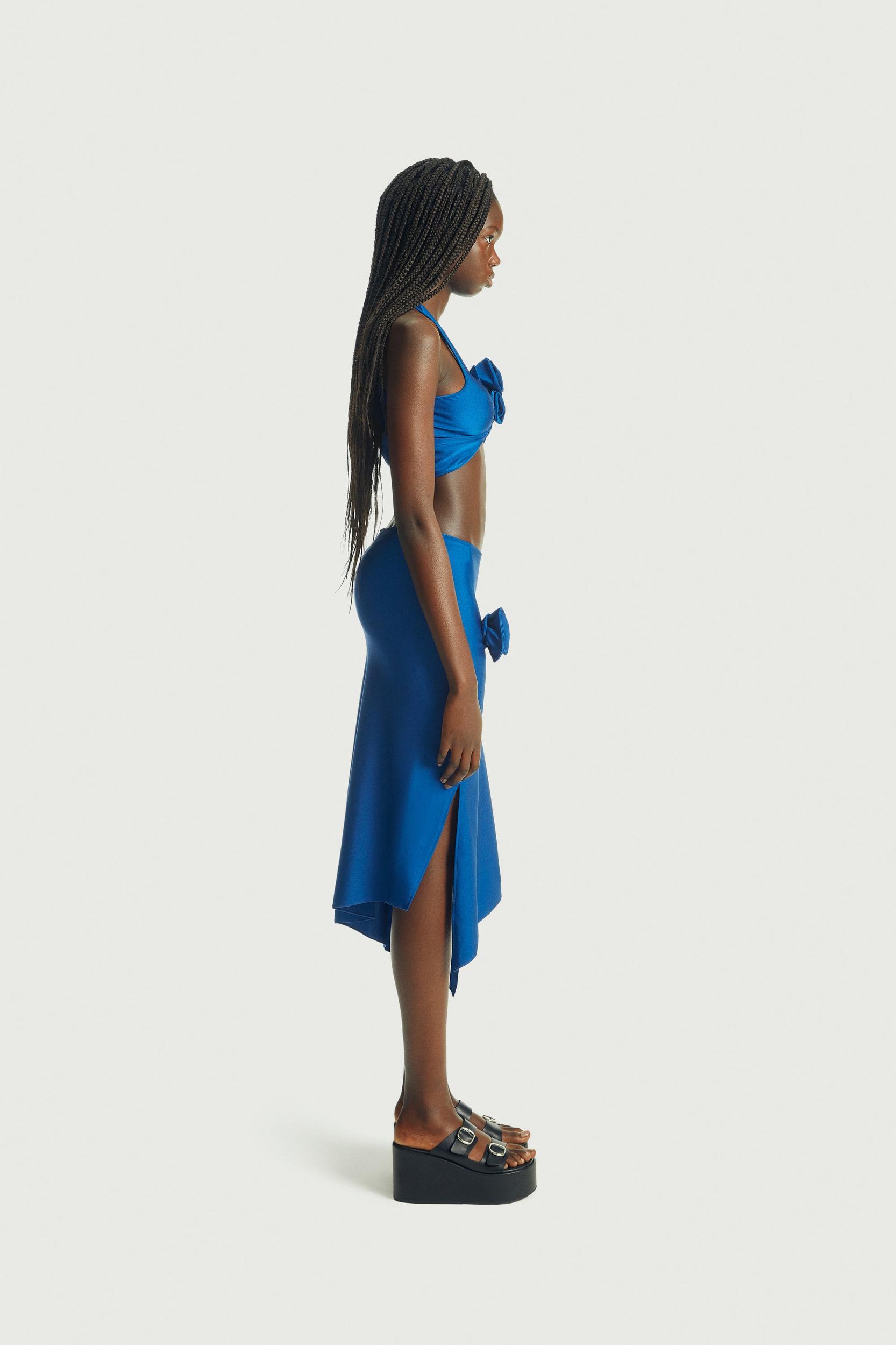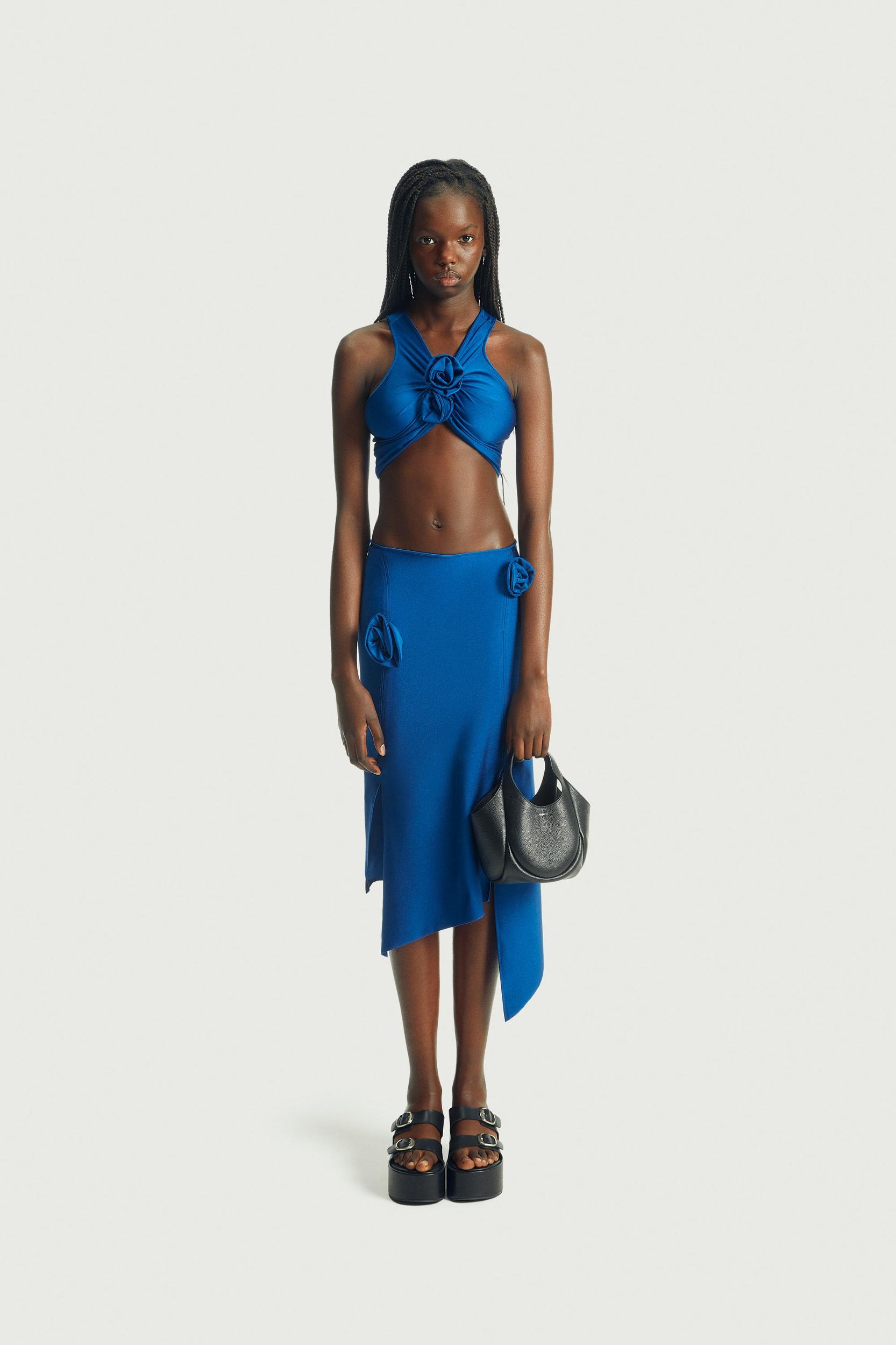 Stretch blue satin top gathered beneath the collarbone for a close-fitting, super cropped style. The central point is embellished with two knots in the form of roses. Come with matching pencil skirt.