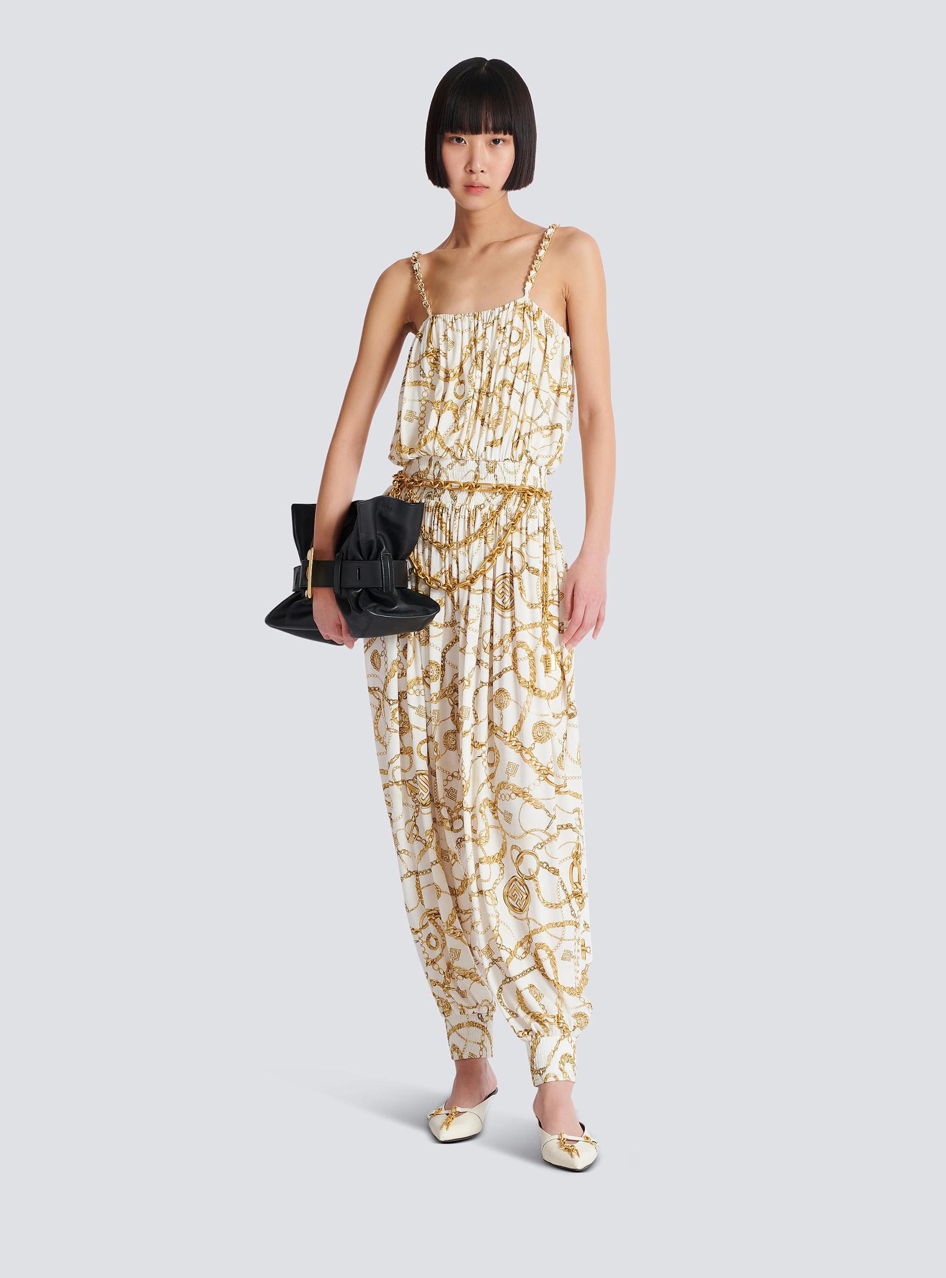 Flowing printed jumpsuit with all-over Balmain Chains patternJersey and interlocked chain strapsSquare necklineBuilt-in belt2 slash side pocketsGathered anklesInvisible side zip fasteningRelaxed fit with fitted waistModel measures 178cm and wears a size 36Main material: 90% polyester 10% elastaneMade in PortugalItem: FF1PW195JK90