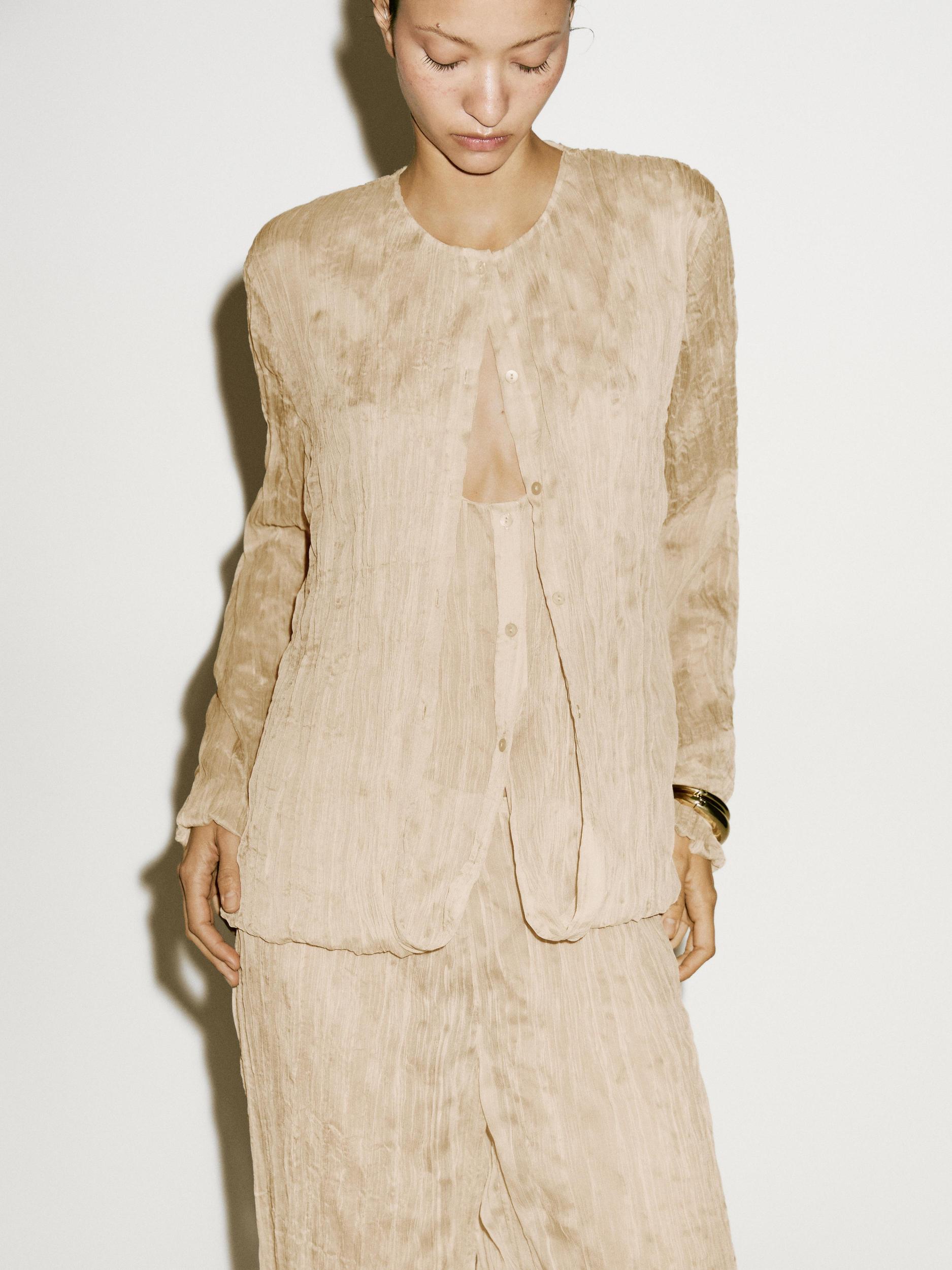 Flowing shirt, Crew neck, Long sleeves, Button-up front, Elasticated rubber detail on the cuffs and hem area, Pleated detail, Flowing fabric, Matching garment available