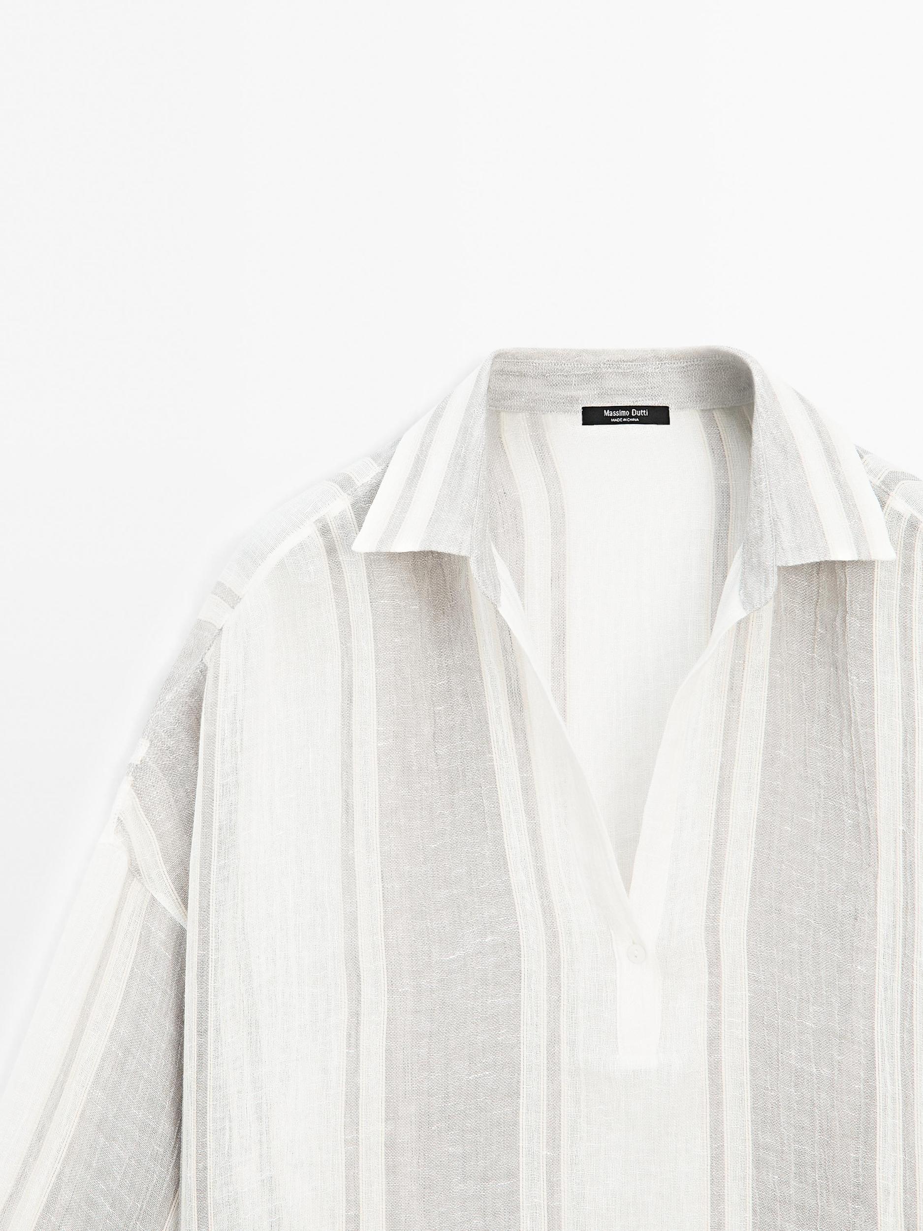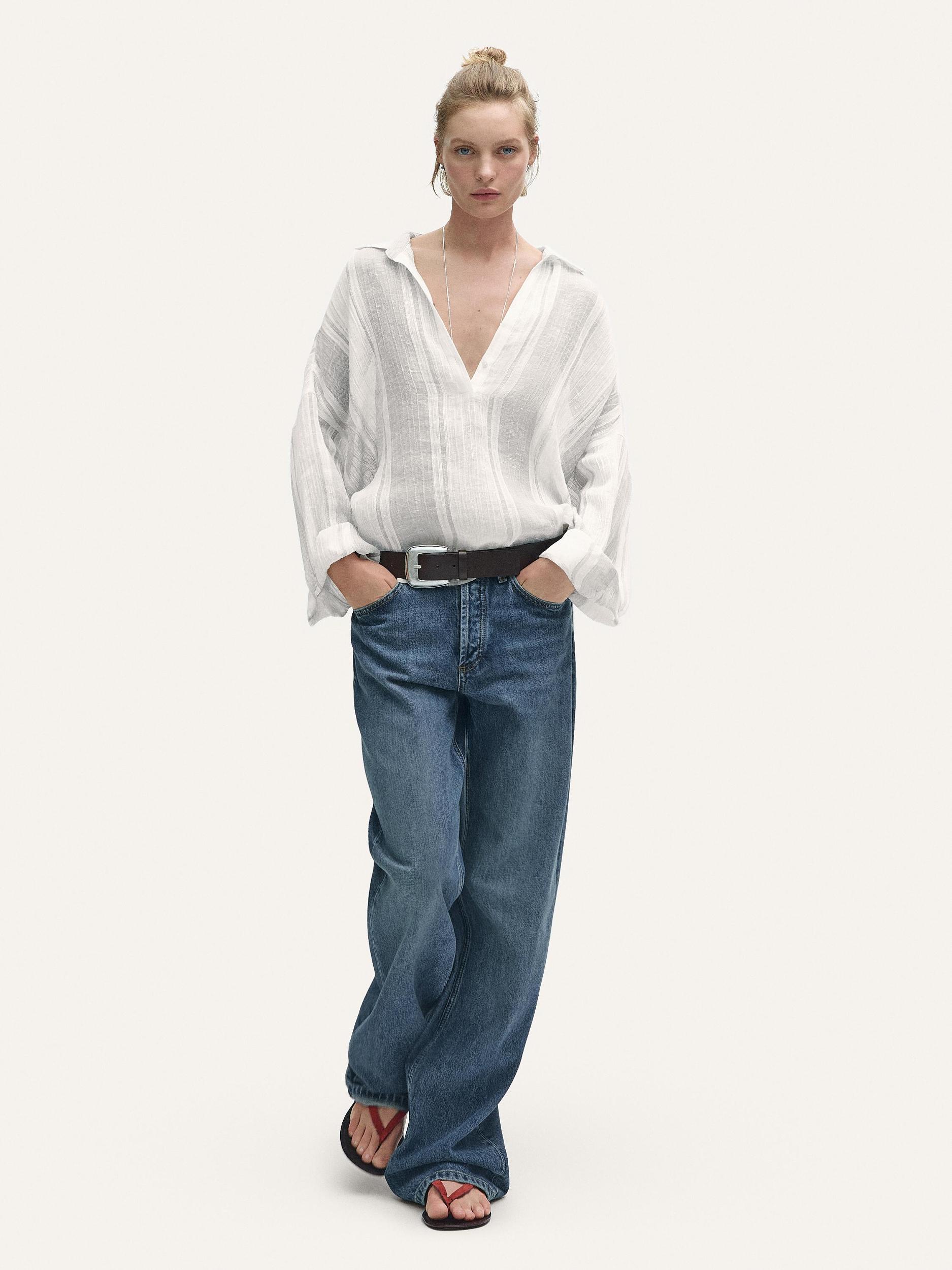 Flowing blouse, Long sleeves, Button fastening, Open shirt collar, Striped print, Semi-sheer fabric, Wide and relaxed silhouette, not tailored