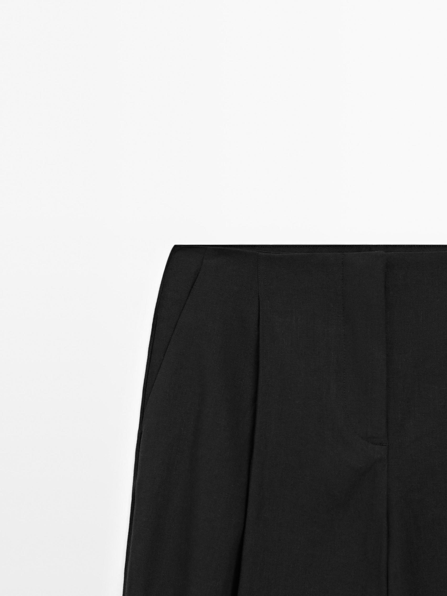 Flowing trousers made of a linen blend fabric, Zip fastening concealed by a placket, with hook-and-eye clasp and button, Two side pockets, Two buttoned welt pockets on the back, Darted detail on the front, Flowing fabric, Matching garment available