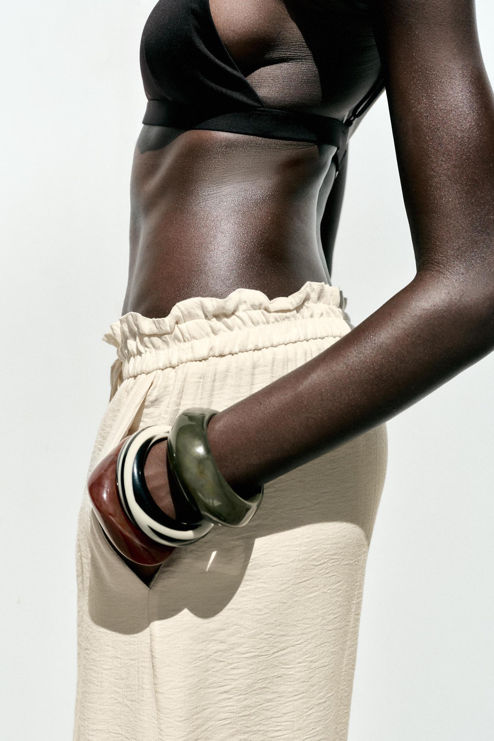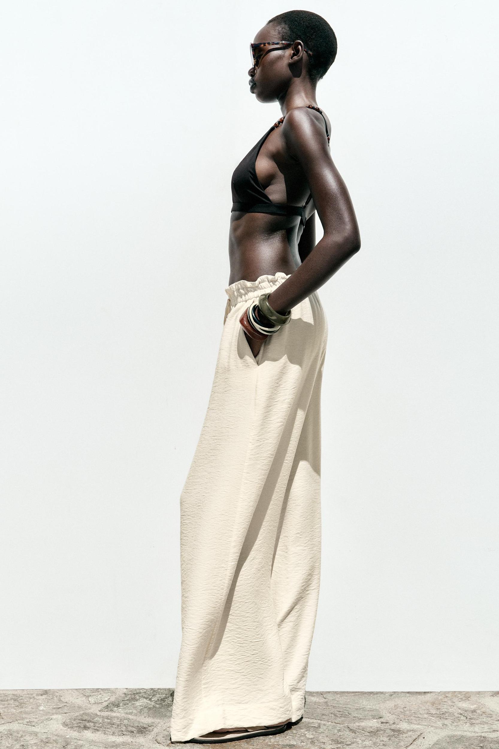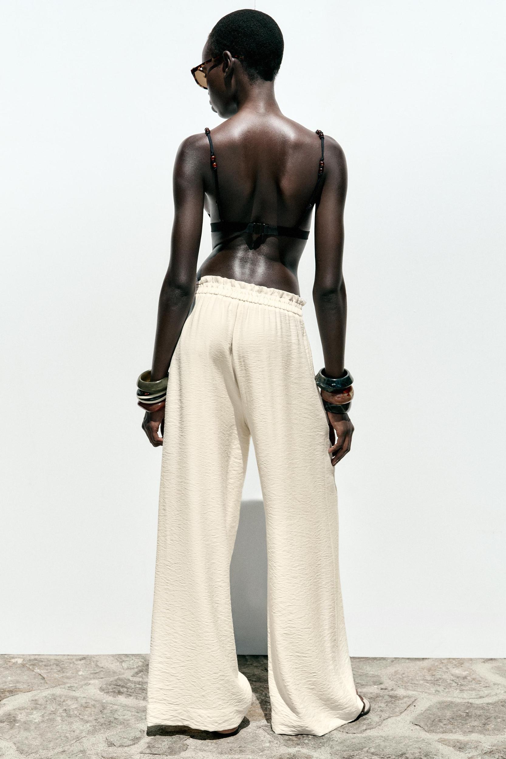 High-waisted pants with gathered elastic waistband with beaded drawstring. Front pockets. Wide leg.