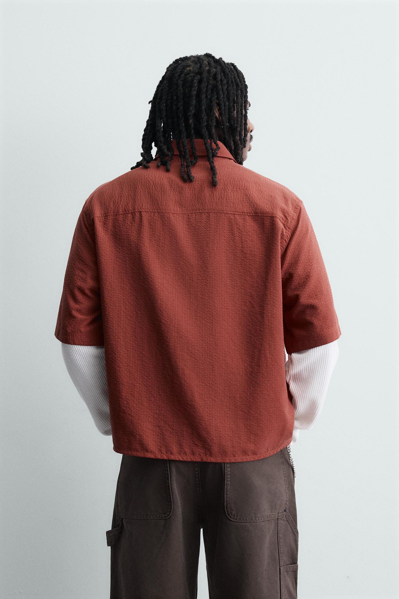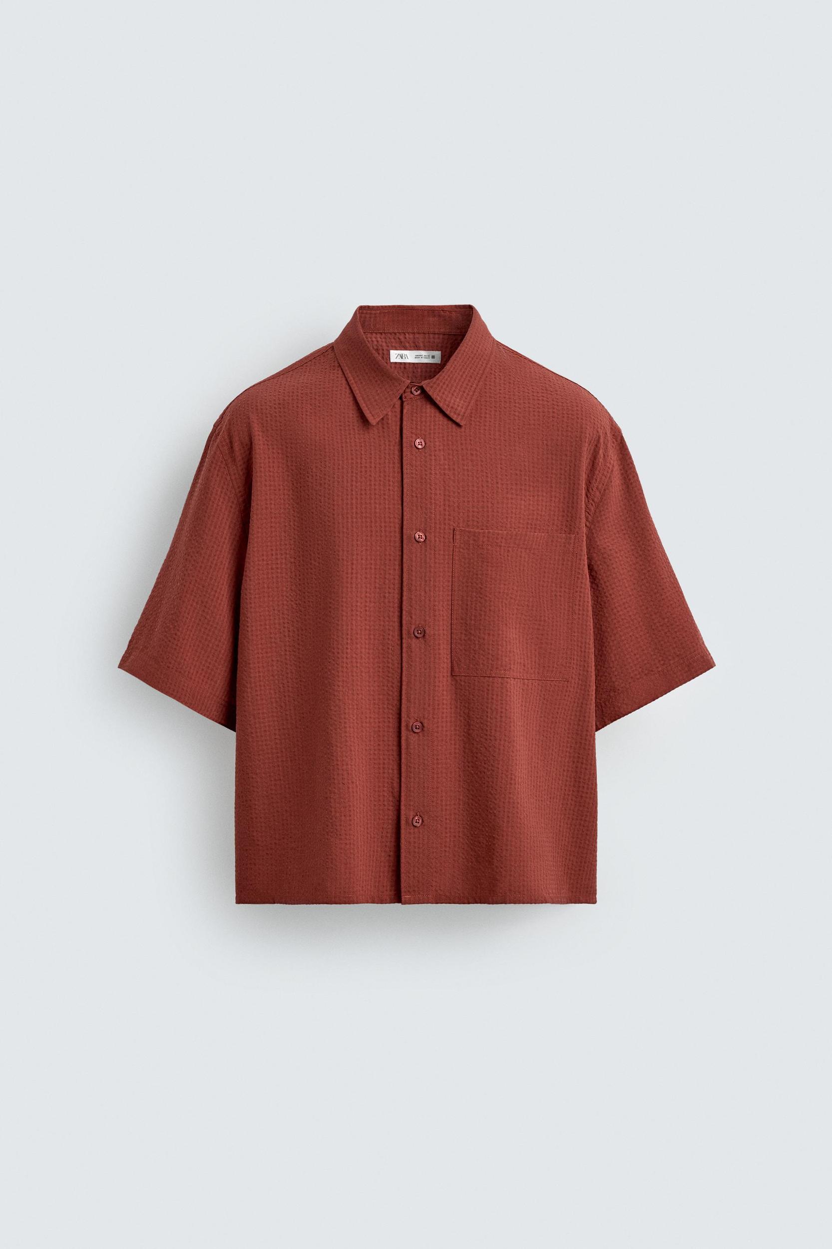 Boxy fit shirt made of fluid fabric. Lapel collar and short sleeves. Patch pocket on chest. Front button closure.
