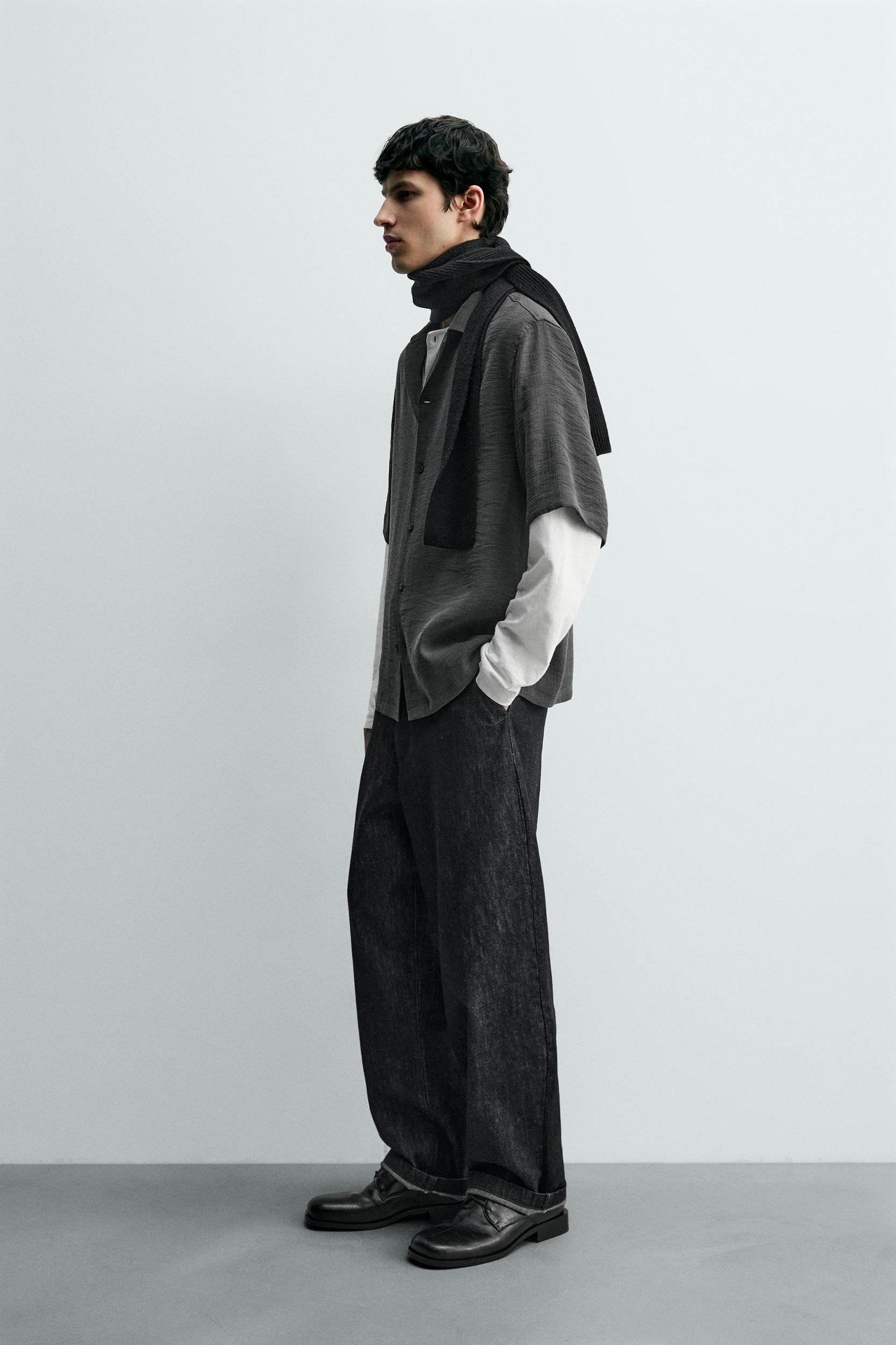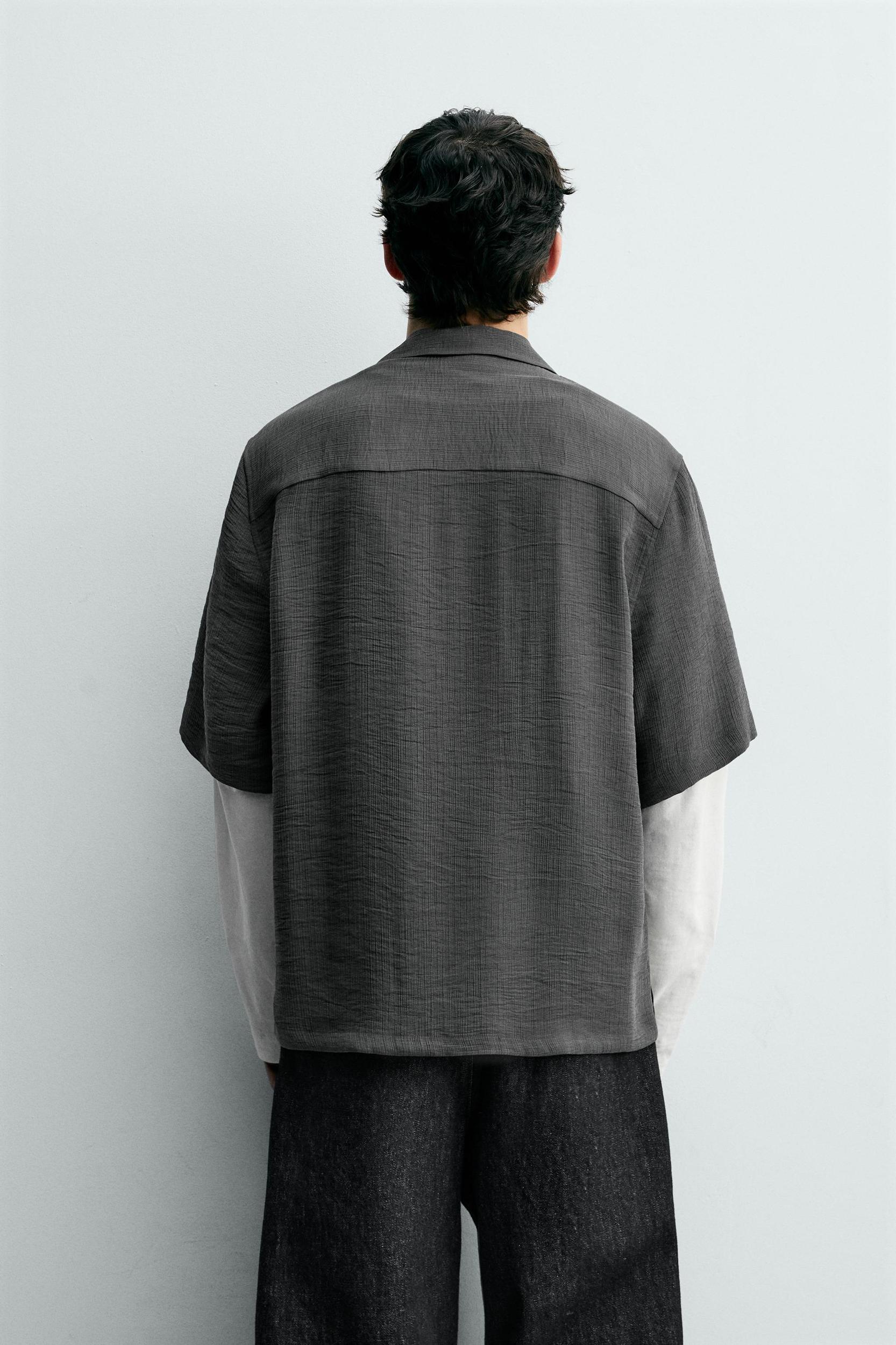 Relaxed fit shirt made from a viscose blend fabric. Features a spread collar and short sleeves. Side vents at the hem. Front button closure.