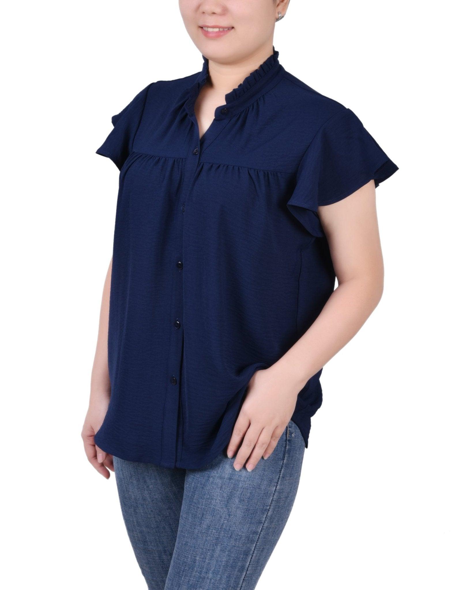 You'll want this ruffled-neck blouse in every color. This flutter sleeve blouse pairs well with your favorite jeans or skirt. - Relaxed Fit - Short Flutter Sleeves - Mandarin Collar - Ruffled Neckline - Button Front - Slightly Textured Polyester Fabric