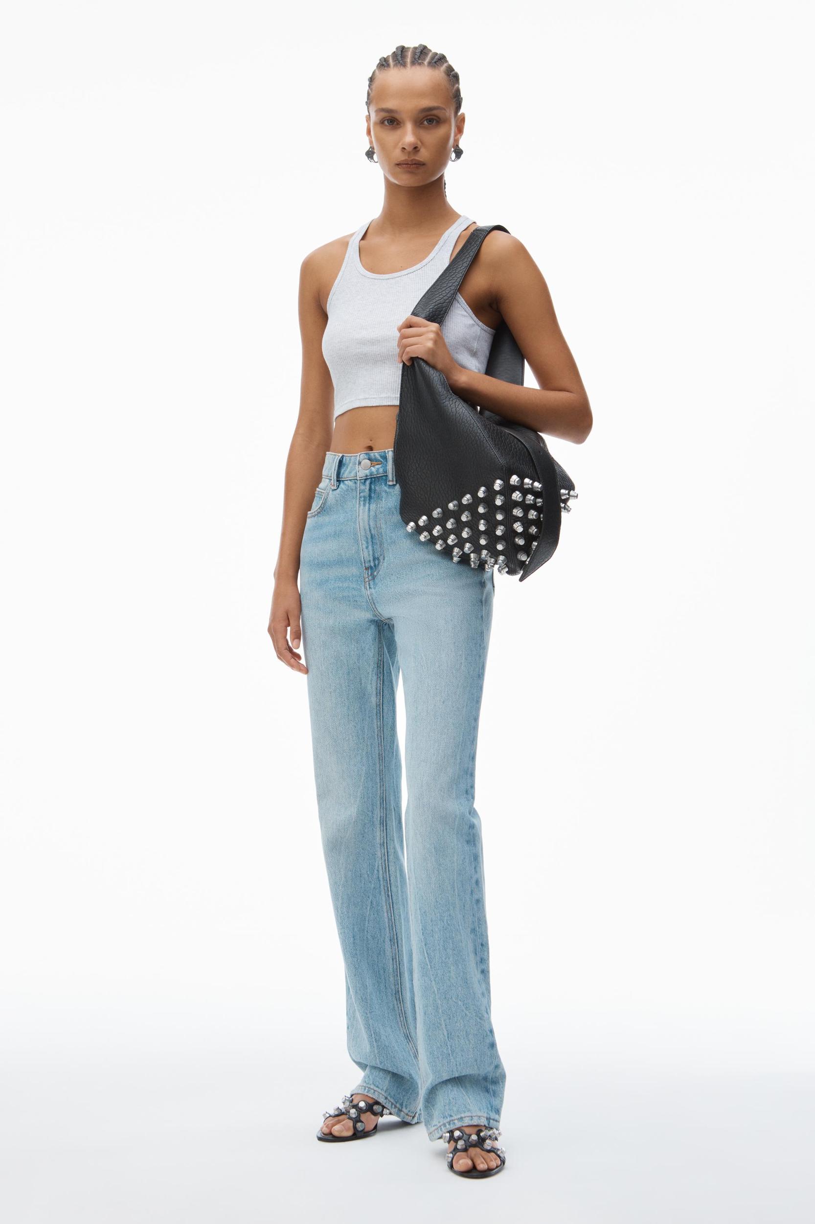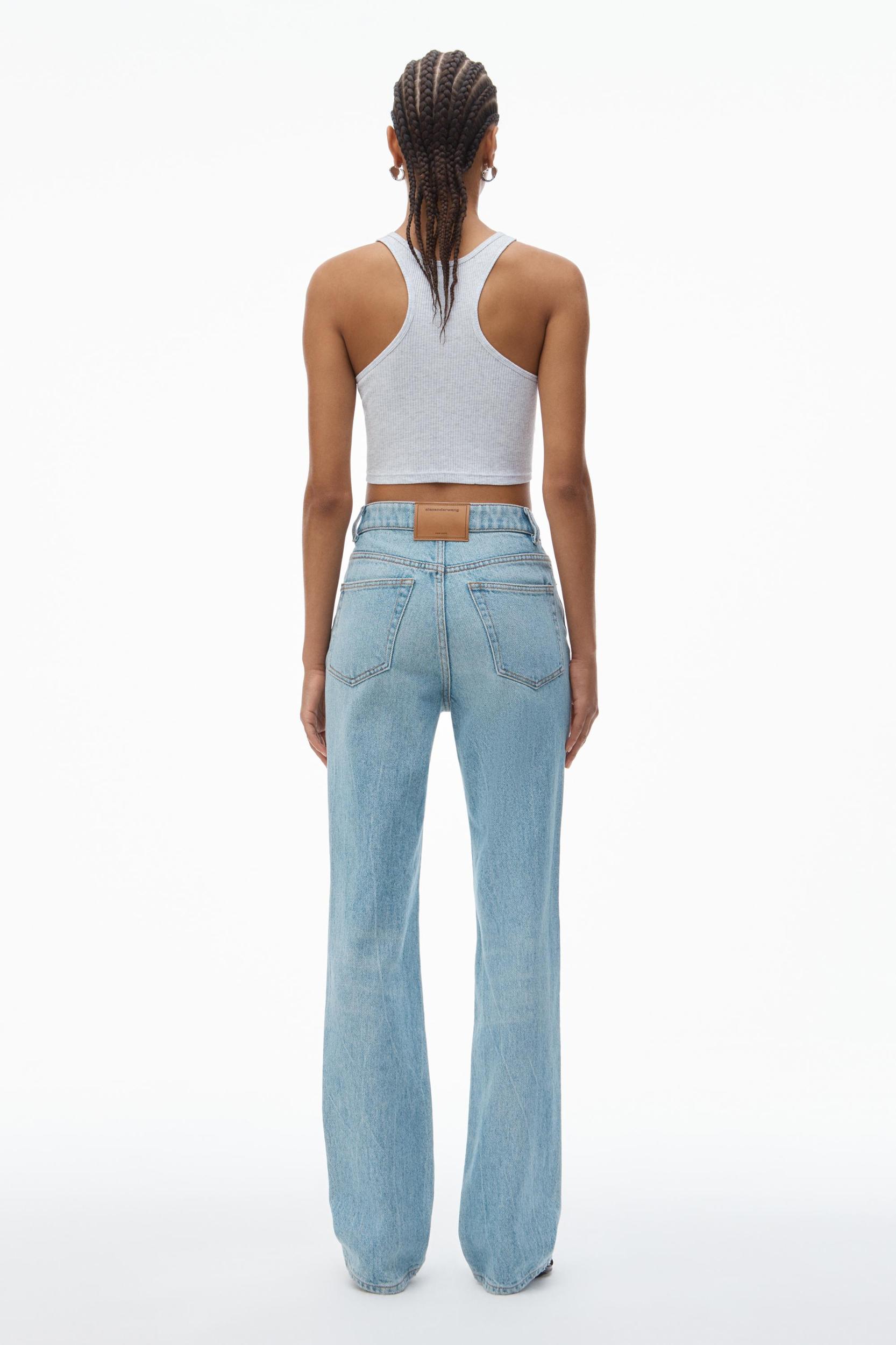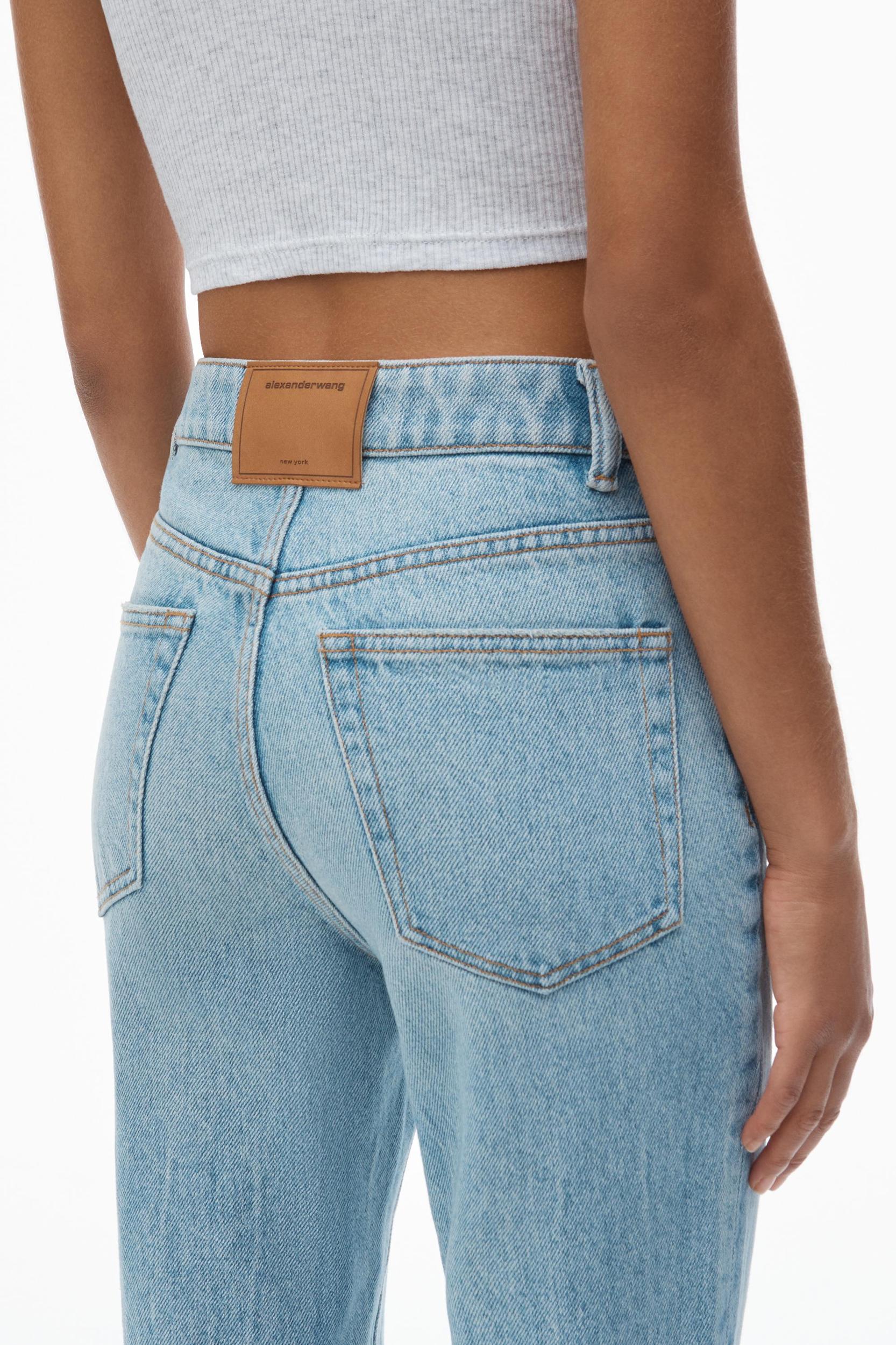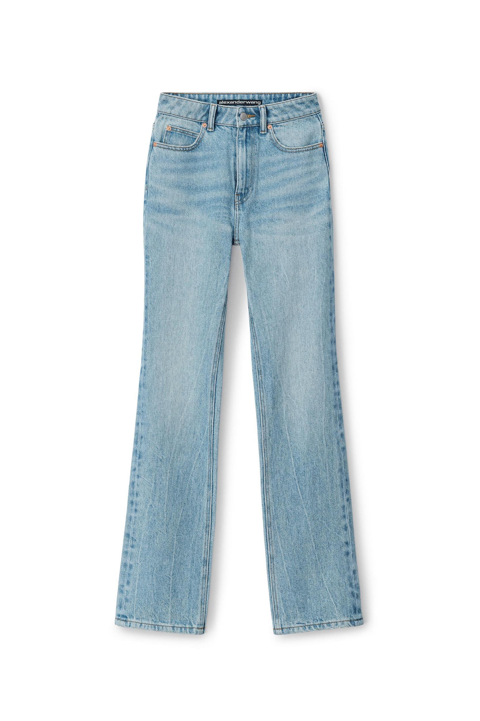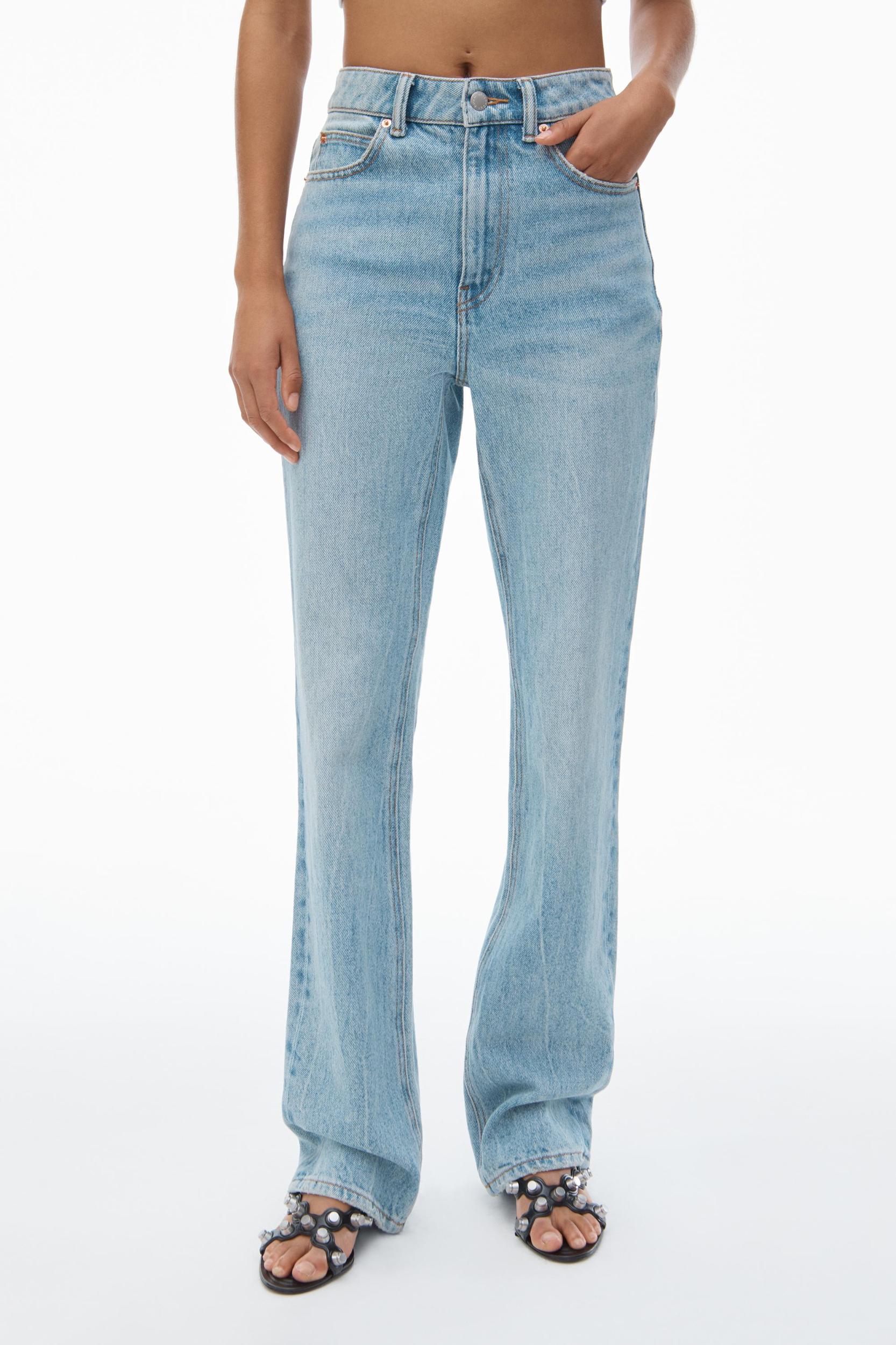 Fly high-waisted slim stacked jean in chunky twill denim and a vintage faded indigo wash, featuring classic 5 pocket detailing