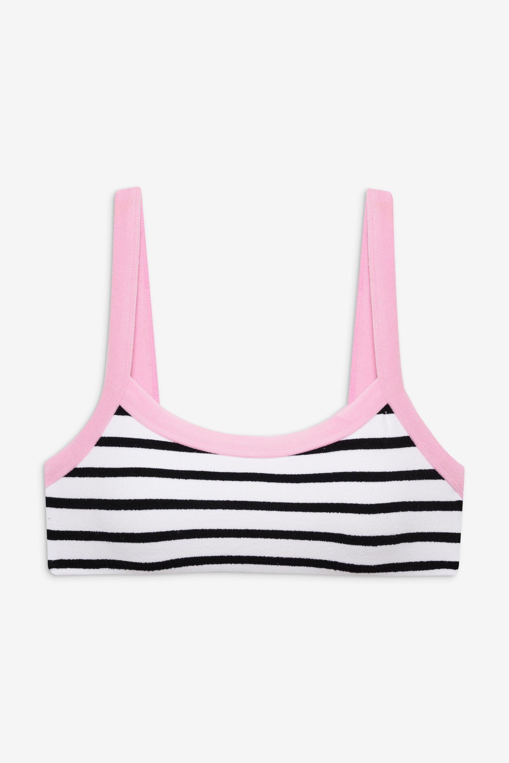 The Flynn bikini top is designed for effortless days spent in the sun. Crafted from ultra soft terry cloth fabric with a Vintage Stripe pattern, this bralette bikini top is a standout piece this season. Details Flattering scoop neck design with medium coverage Moderate support for all day comfort Accented with baby pink binding Fabric 95% Nylon + 5% Spandex Terry Swim Terry Fabric Model Size & Fit This style runs true to size Eileen is wearing a size Small Height 5’9” (175cm) Bust 32” (81.5cm), Waist 25.5" (65cm), Hips 35" (89cm)