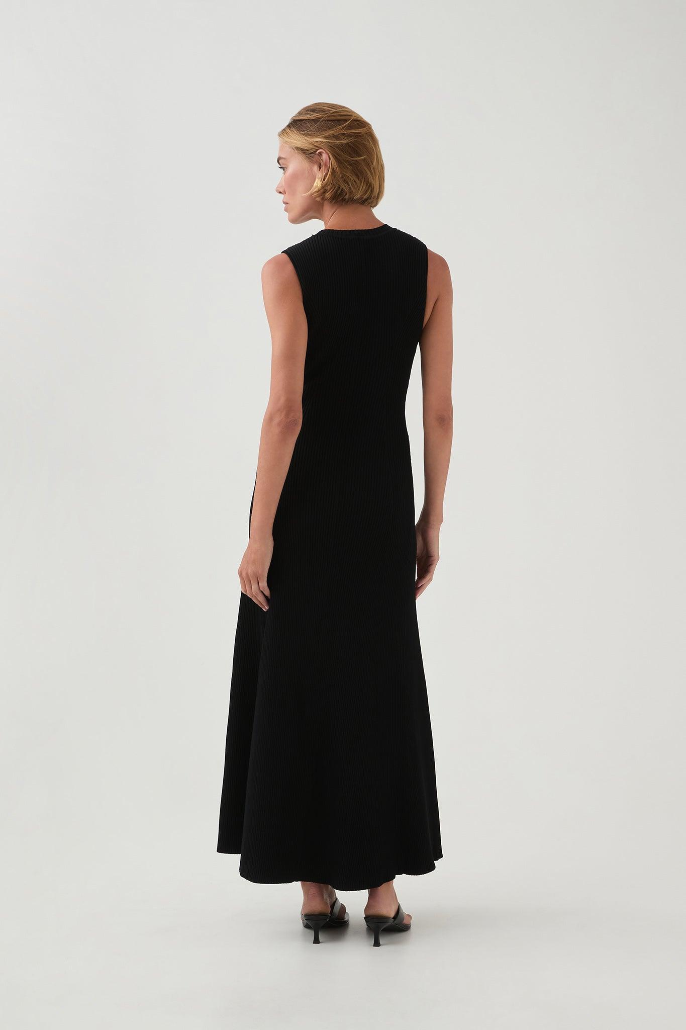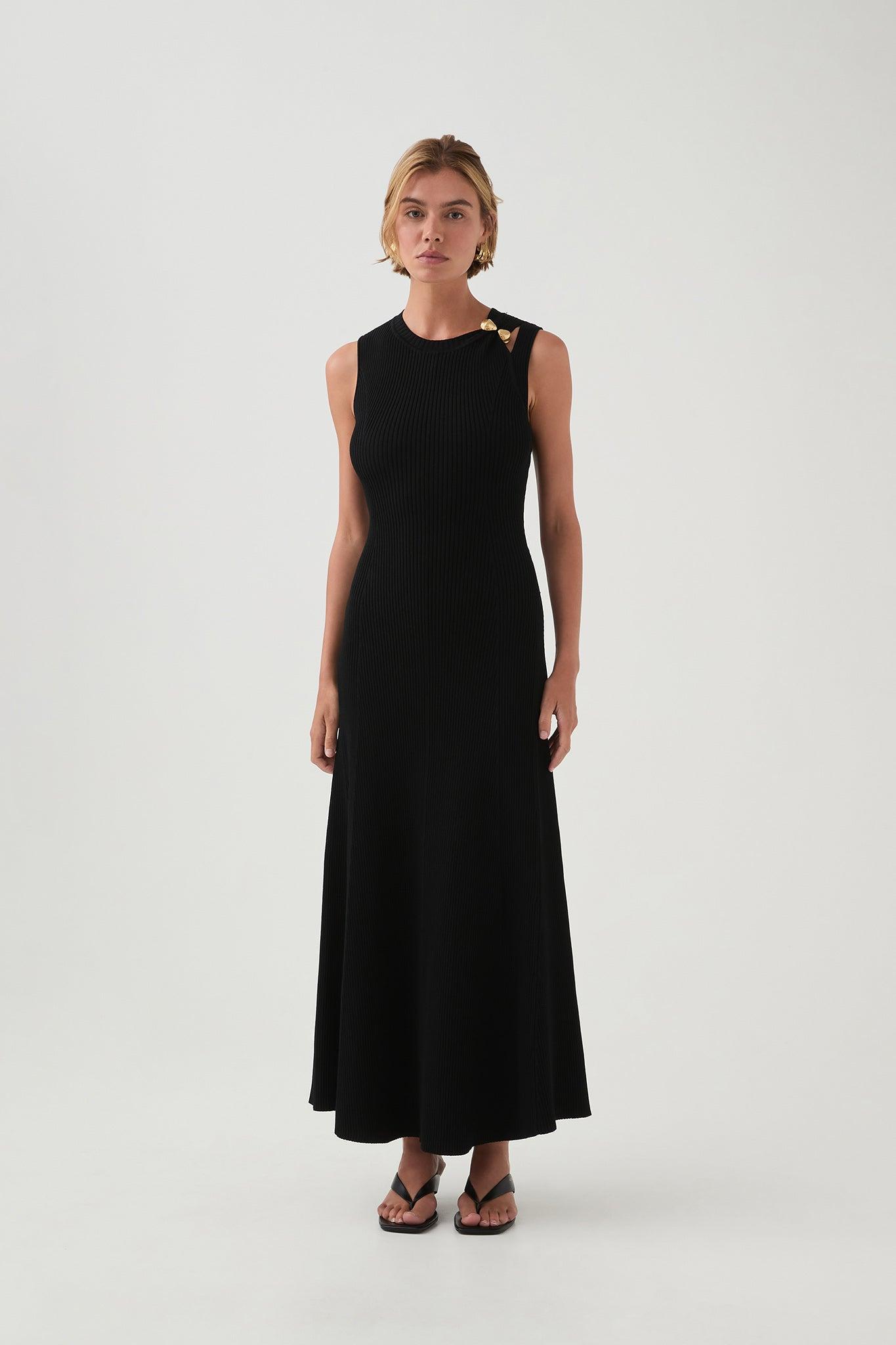 PRODUCT DETAILS Women’s knit midi dress Sleeveless slim fit Sculptural gold hardware detail Ribbed finishes 100% Cotton Delicate Cold Hand Wash With Mild Wool Detergent Shop All Dresses SIZE AND FIT Model wears a size AU 8/S Height: 178cm/ 5’10 Bust: 84cm Waist: 64cm Hips: 86cm