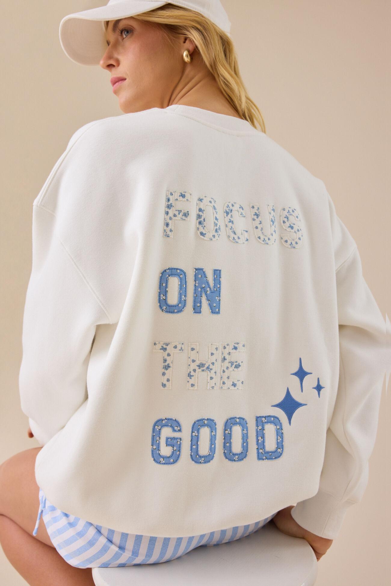 This crewneck sweatshirt combines comfort with a reminder to Focus on the Good. The floral lettering adds a touch of beauty and charm to this cozy and versatile piece.