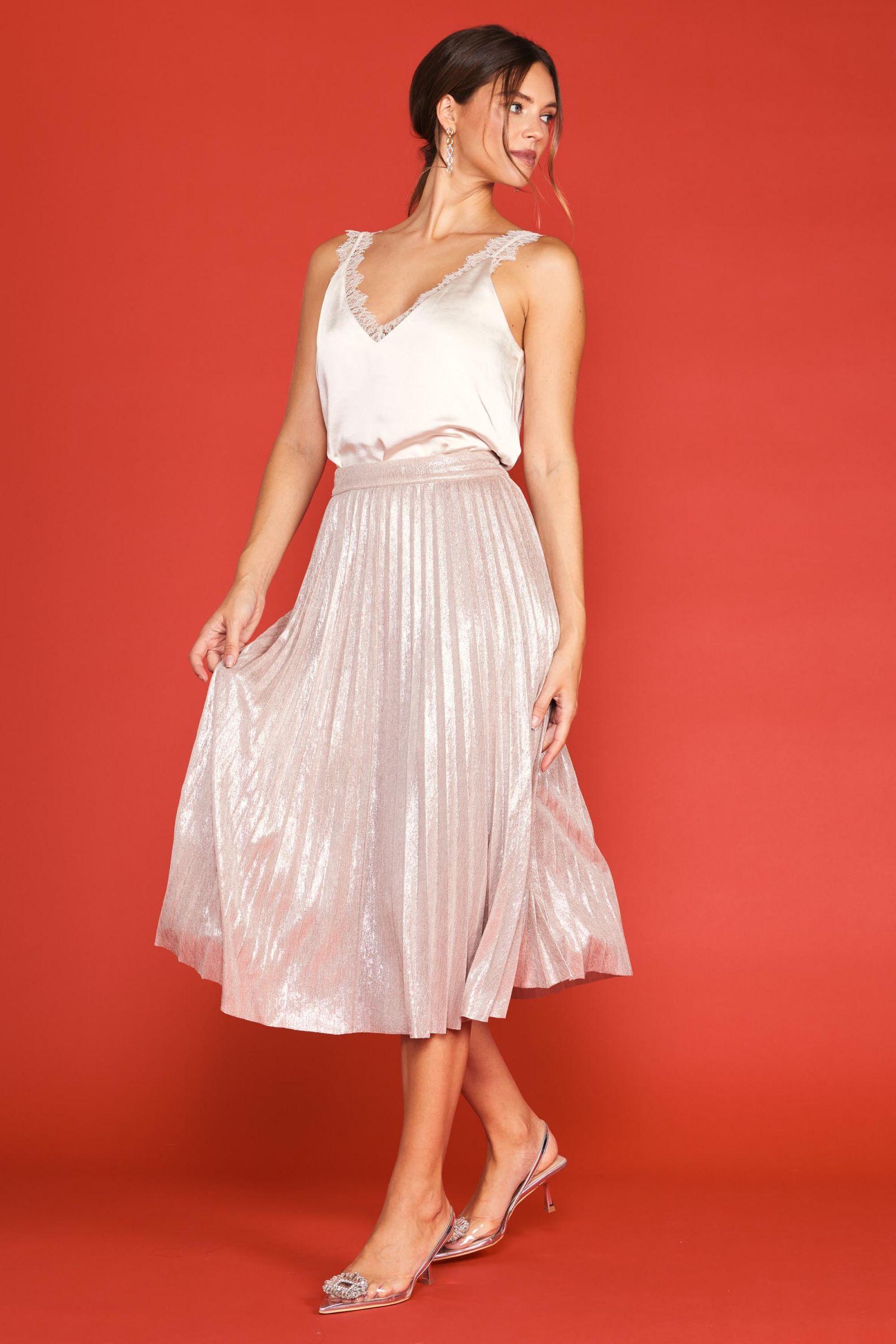 Discover elegance with our Foil Coated Pleated Midi Skirt. Featuring a stunning sheen, this skirt combines sophistication with a modern twist. Perfect for any occasion, it flows beautifully with every step, making it an essential addition to your wardrobe. Dress it up or down effortlessly!