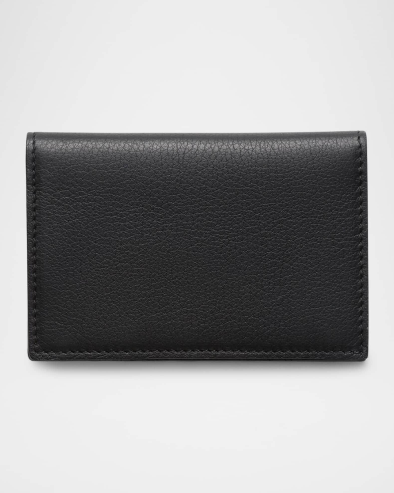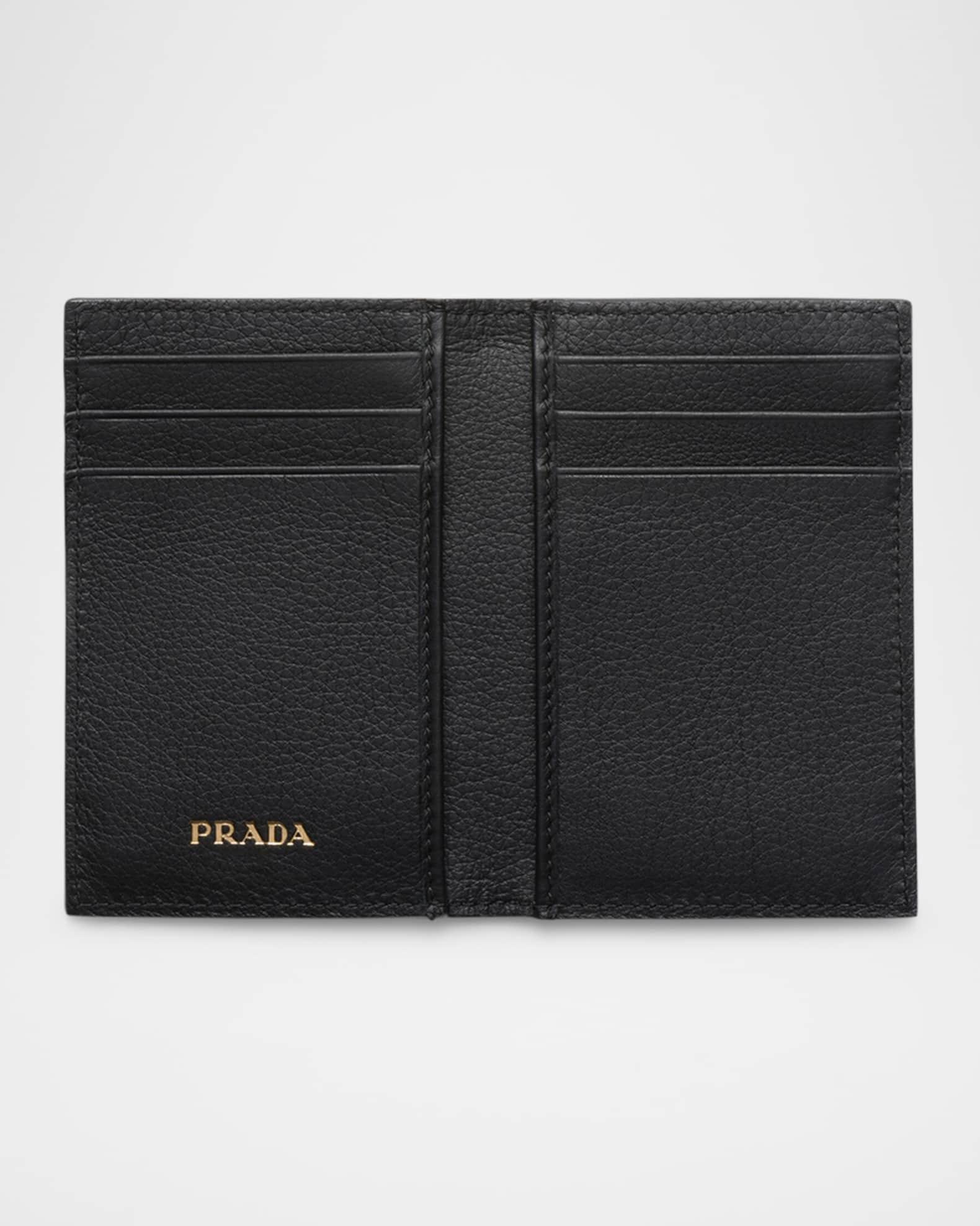 Prada folding card holder in leather Features signature stamped logo lettering Six card slots Two slip pockets Approx. 4.3" x 2.7" Imported