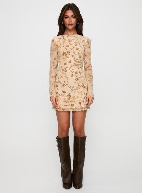 Long sleeve cut-out mini dress Floral design, round neckline, flared cuffs, button closure at back, sheer Non-stretch material, fully lined 100% polyester Cold gentle machine wash